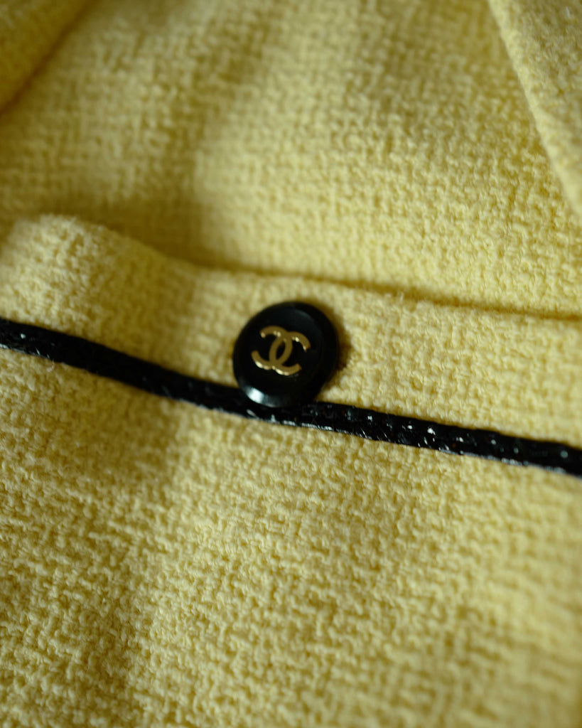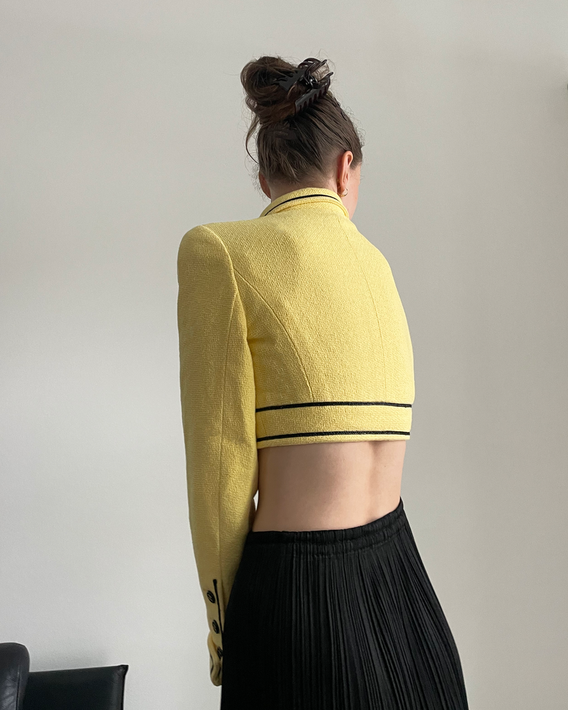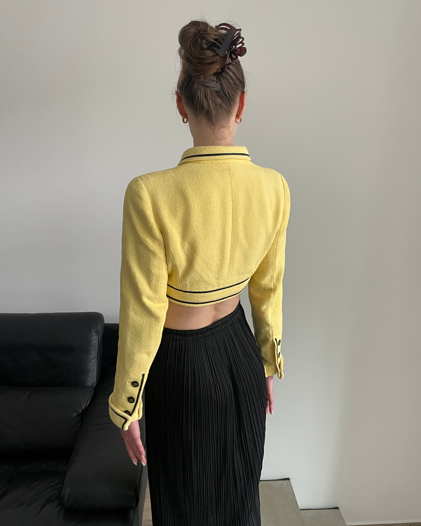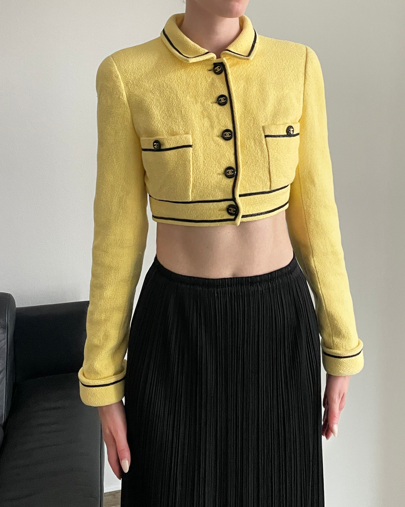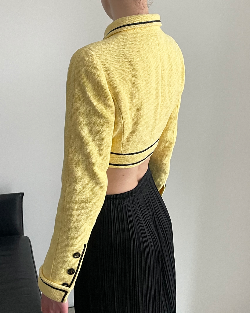 Yellow cropped  Chanel suit jacket from the iconic Barbie collection spring summer 1995/P95 with collar. Seen on the runway in exakt colourway on Trish Goff, look 7. Five black bbuttons with golden CC on front,  three on each sleeve as well as on the two chest pockets. Gold weight chain on the inside. CC logos woven into the silk lining (no staings on the lining).