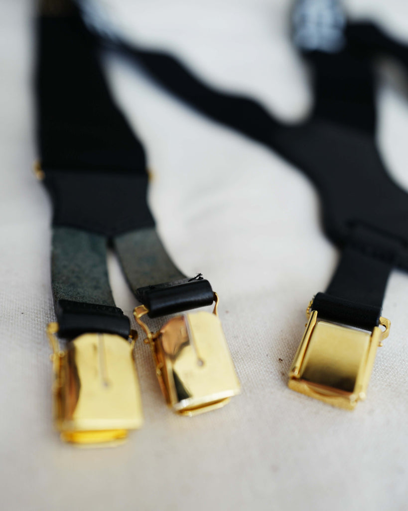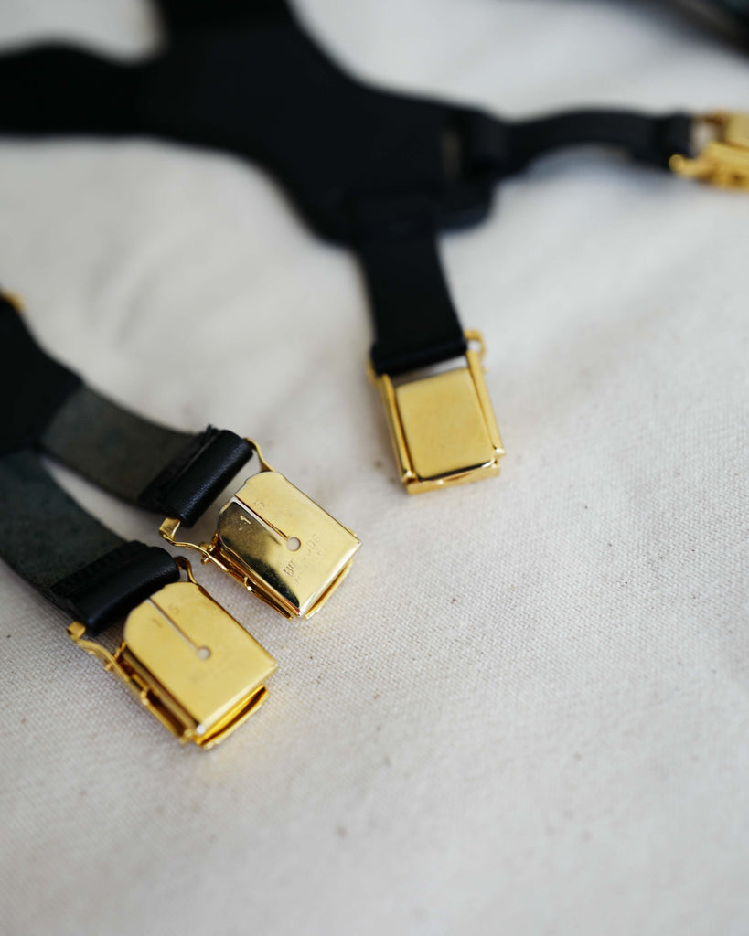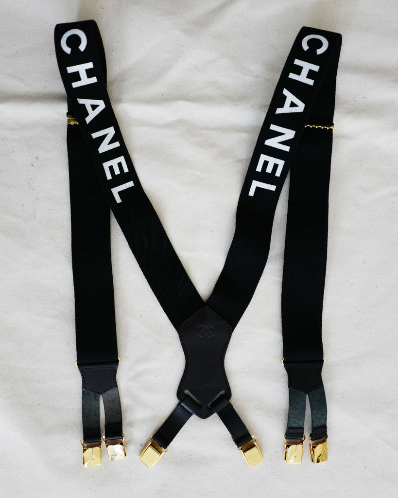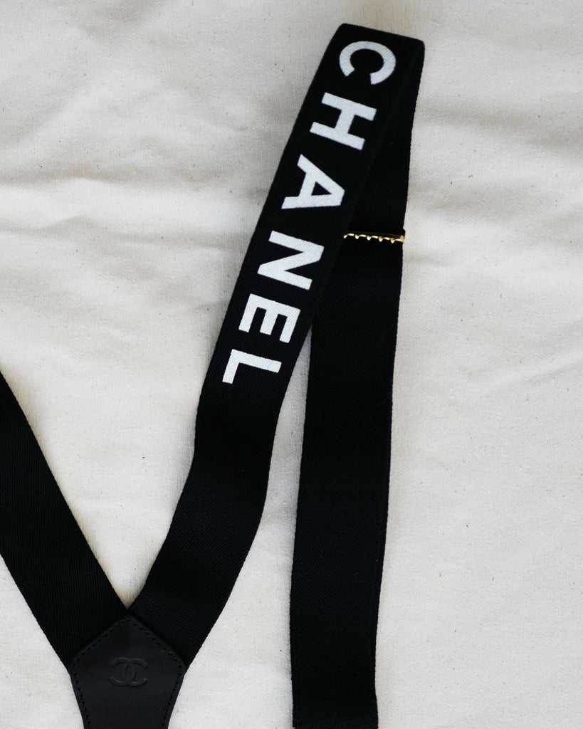 Vintage Chanel suspenders in black with white print. Gold clips with serie number and logo.