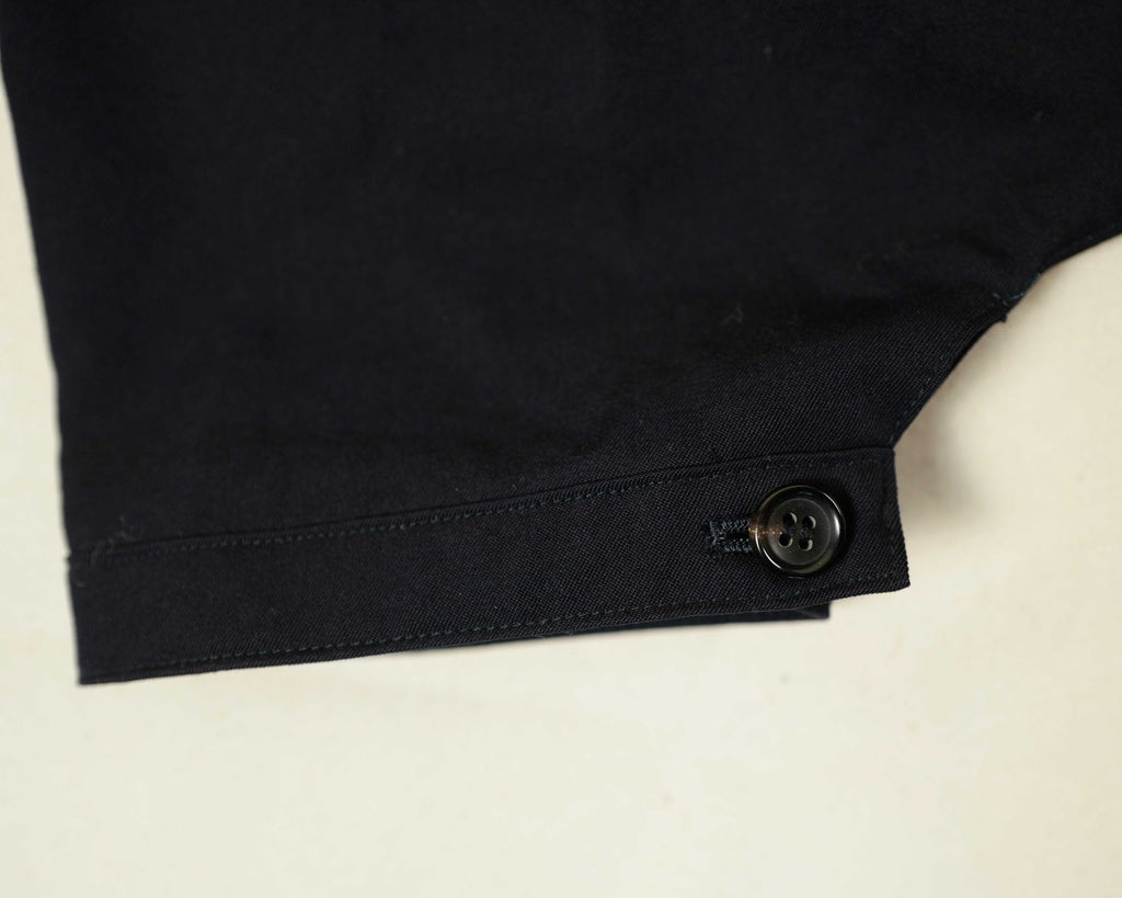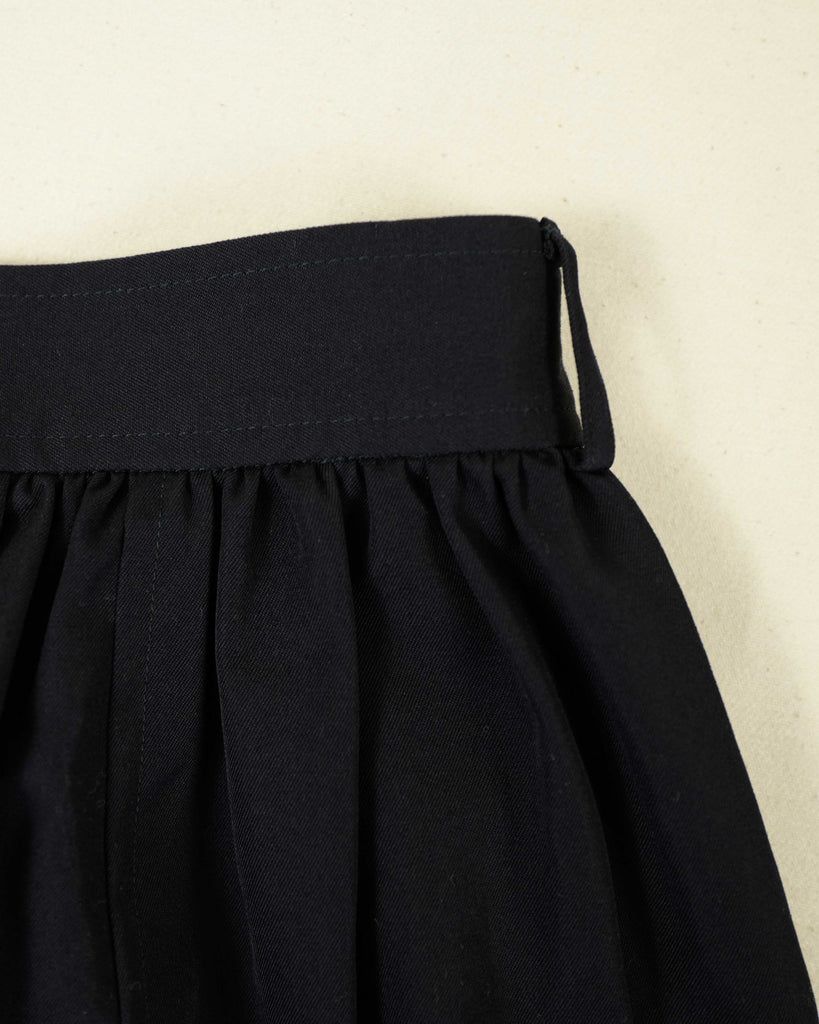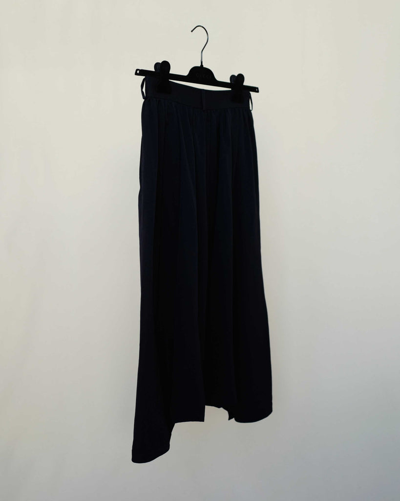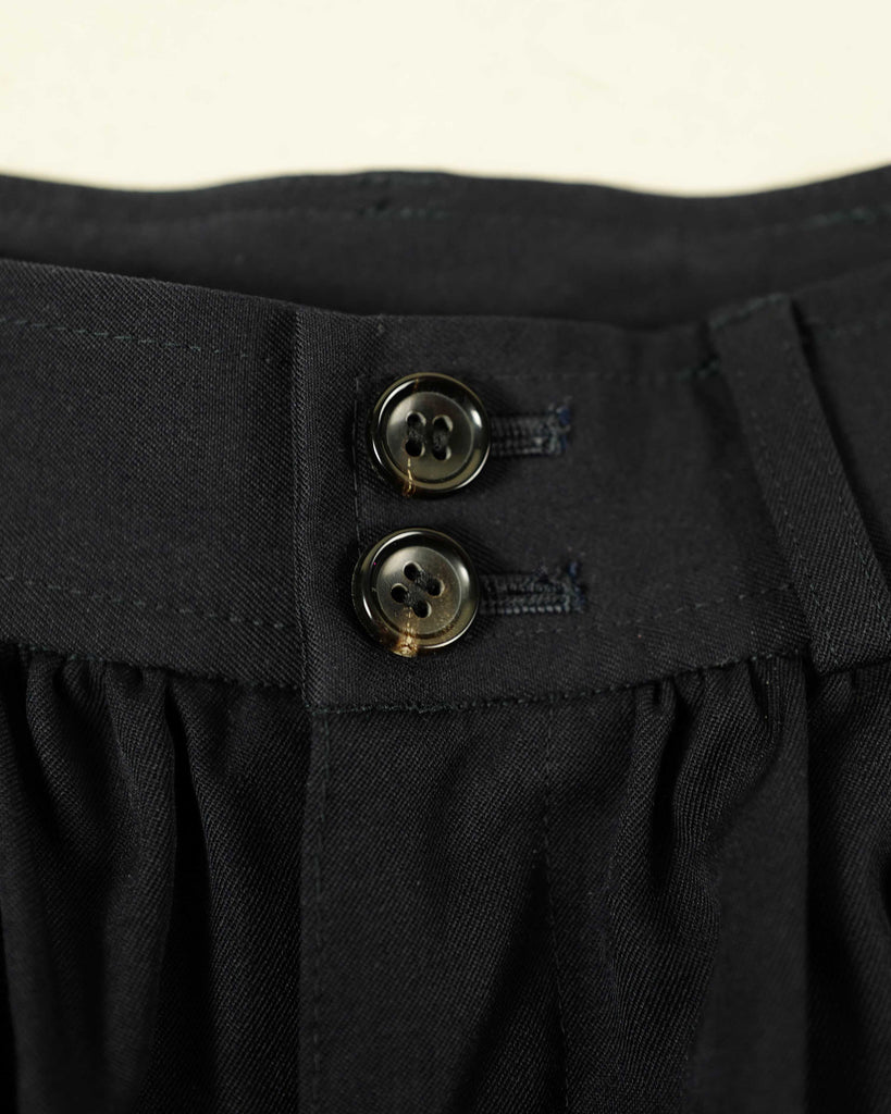 Black, artisinal wool drop-sown-crotch pants. Light pleating from waistband. Buttons at the knee/calf.