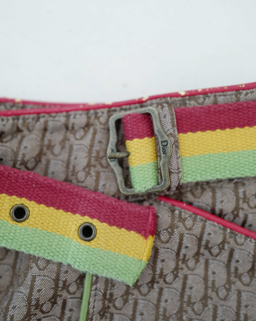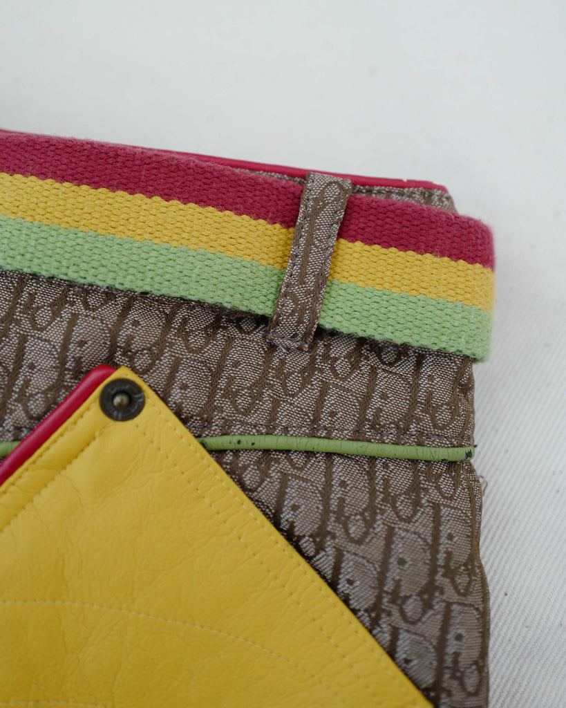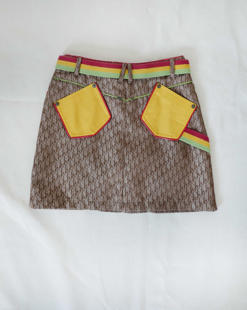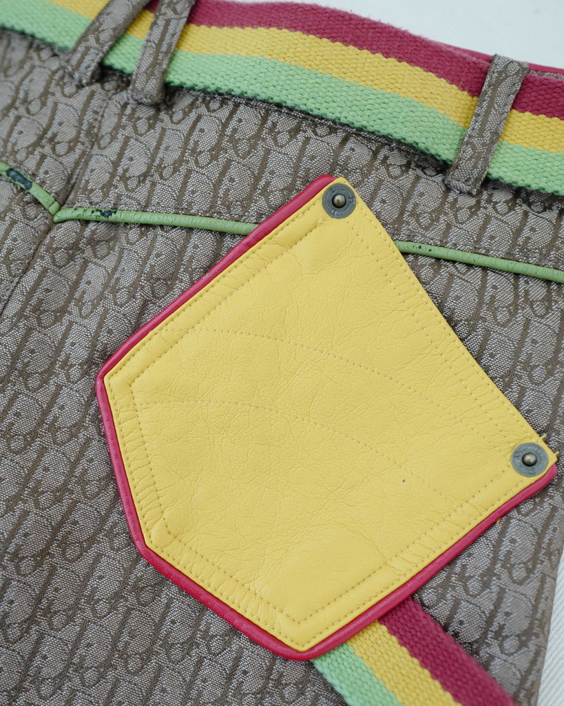 Christian Dior monogram skirt. Applications in green, yellow and red PU leather through out the skirt. Five-pocket-model. Green, yellow, red belt with Christian dior embossed. Y2k, 2000 era.