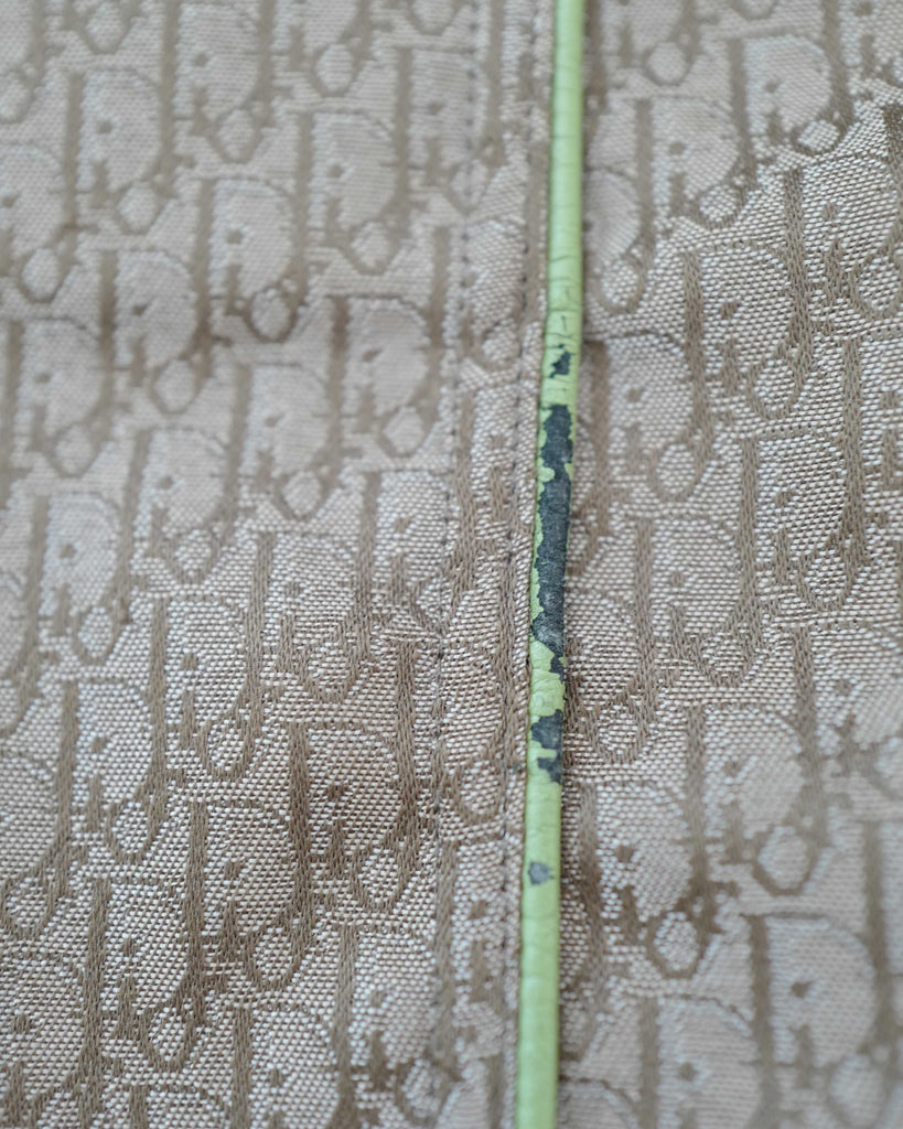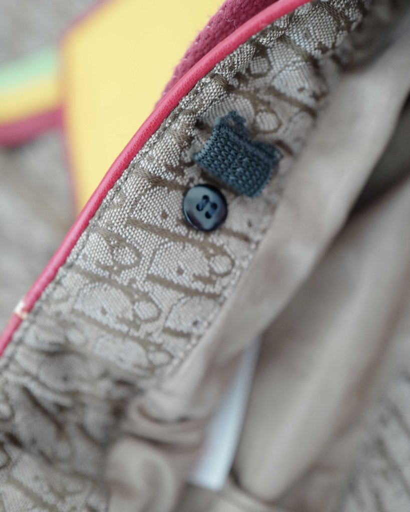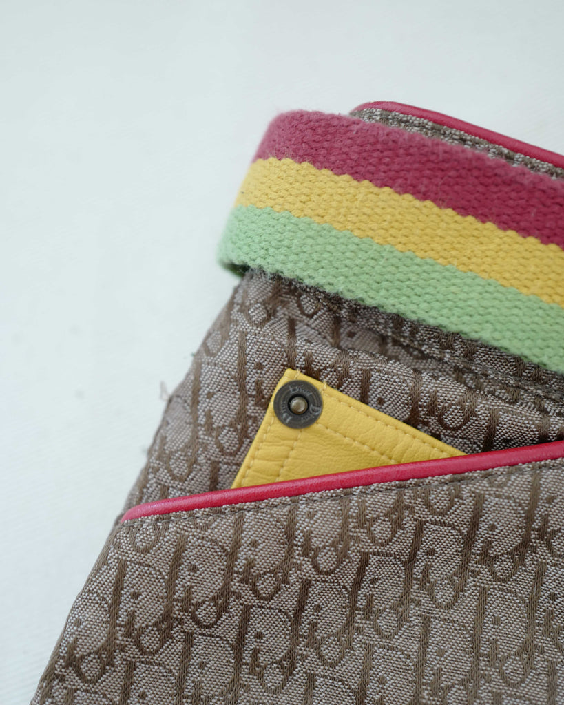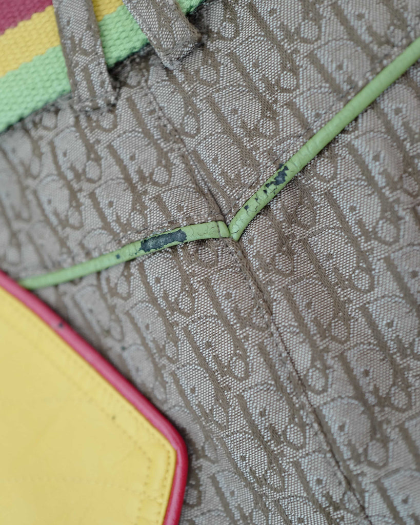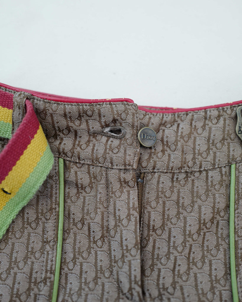 Christian Dior monogram skirt. Applications in green, yellow and red PU leather through out the skirt. Five-pocket-model. Green, yellow, red belt with Christian dior embossed. Y2k, 2000 era.
