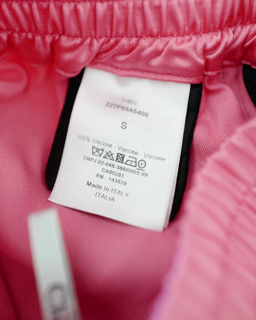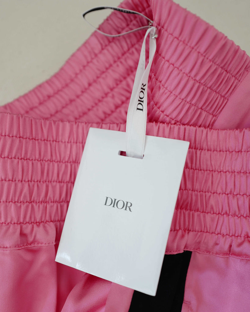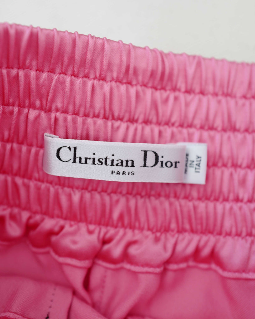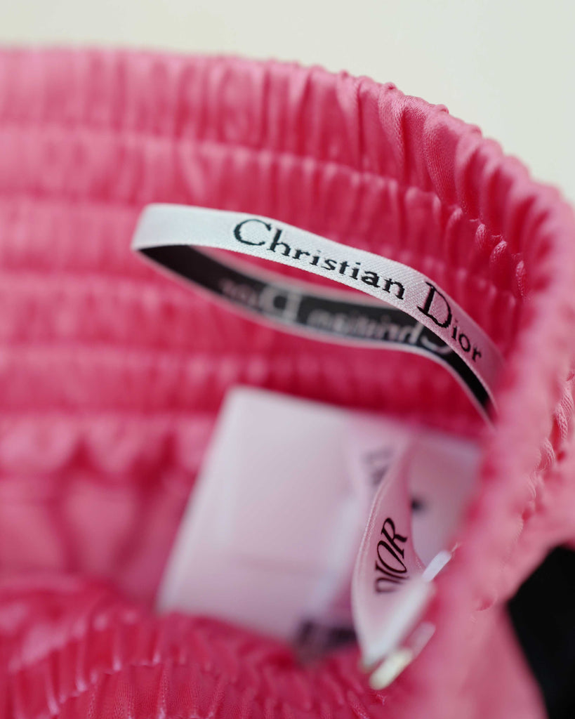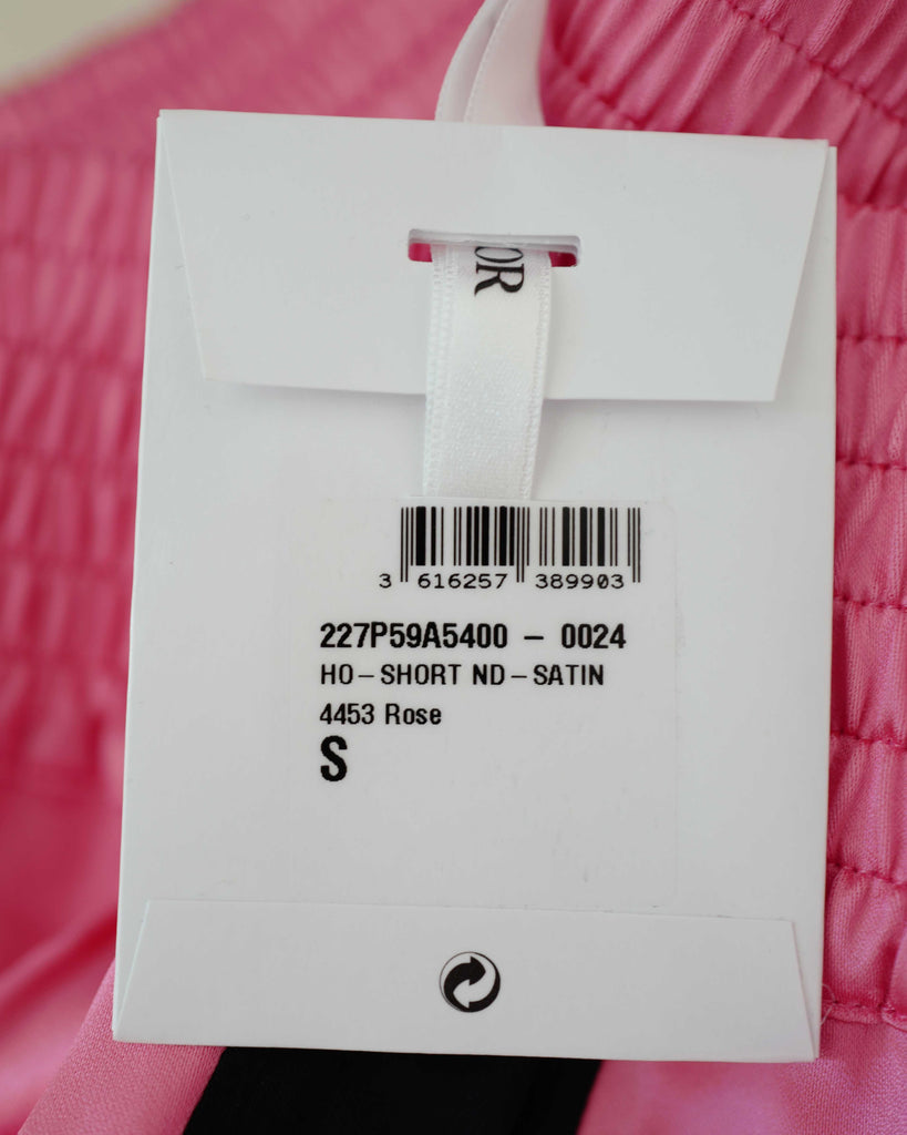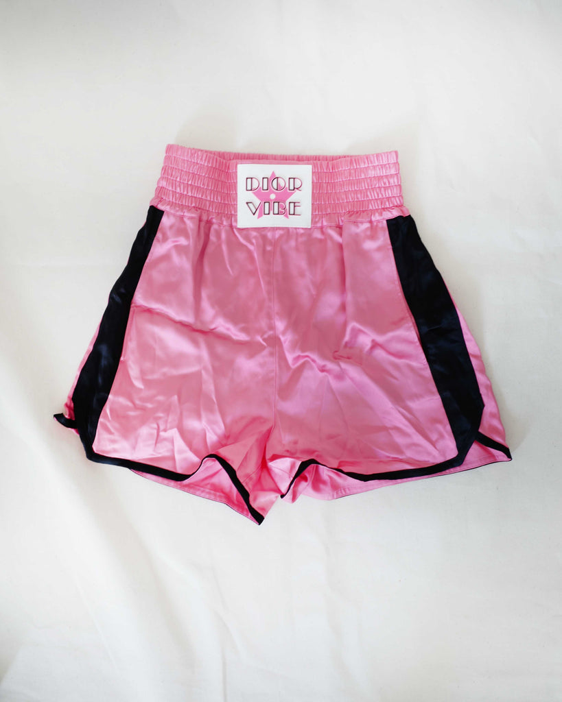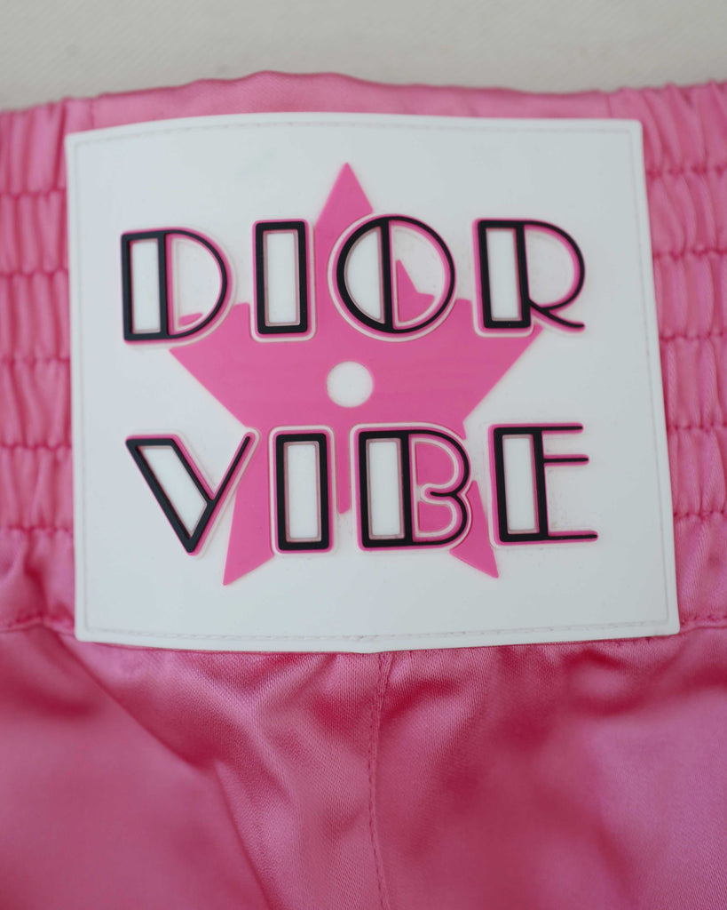 Barbie pink Dior silky boxer shorts from spring summer 2022, look 39. "DIOR-VIBE" on thick rubber application. The look was featured in five different colours on the runway.