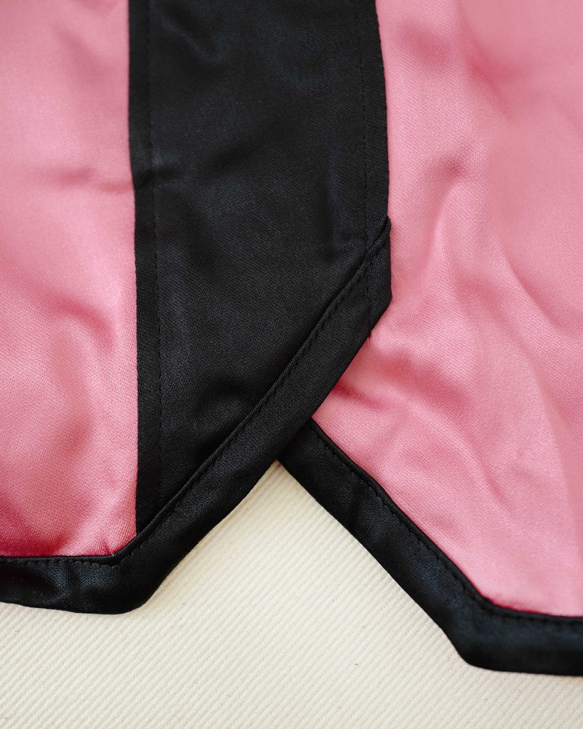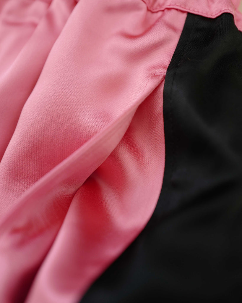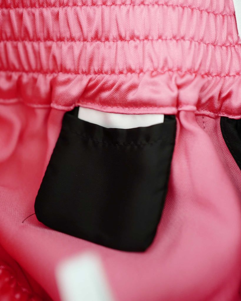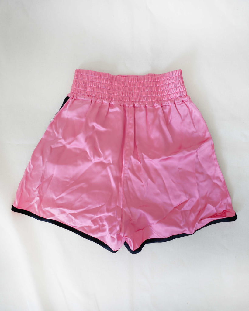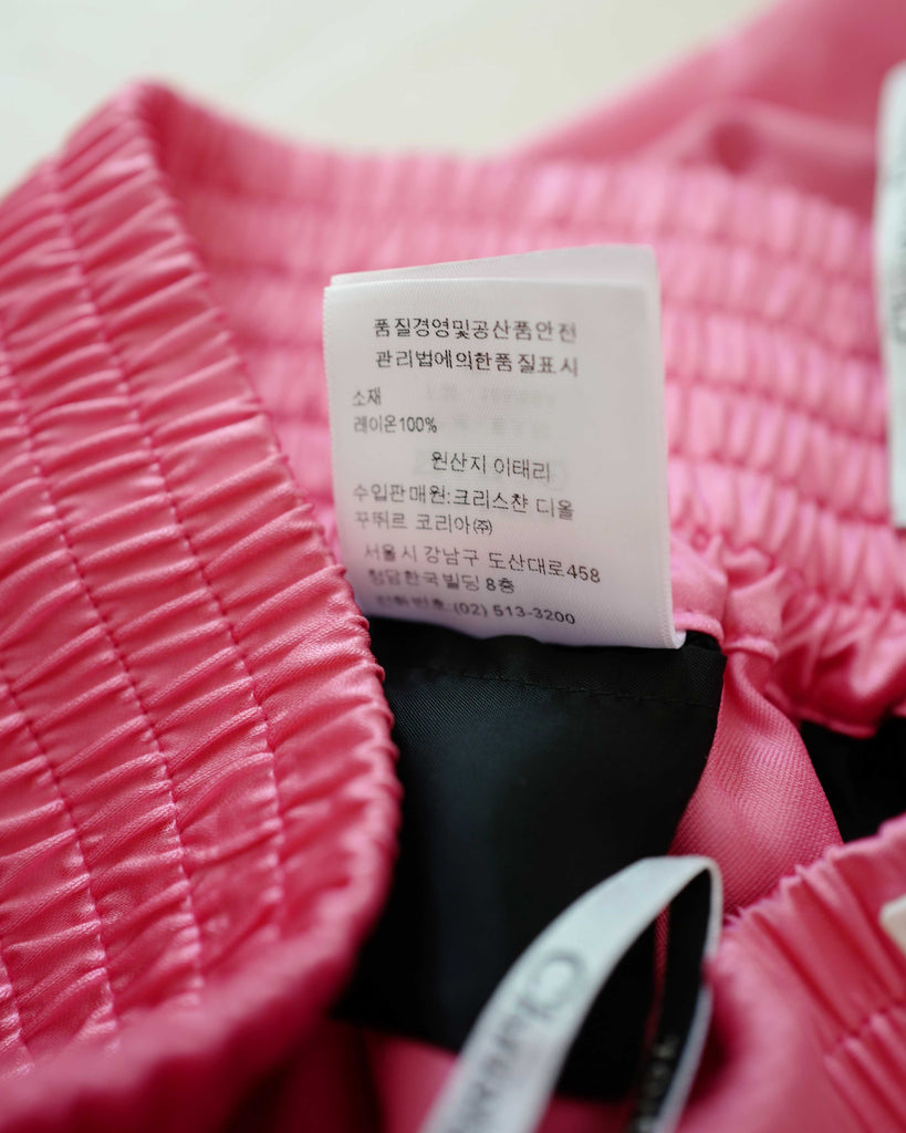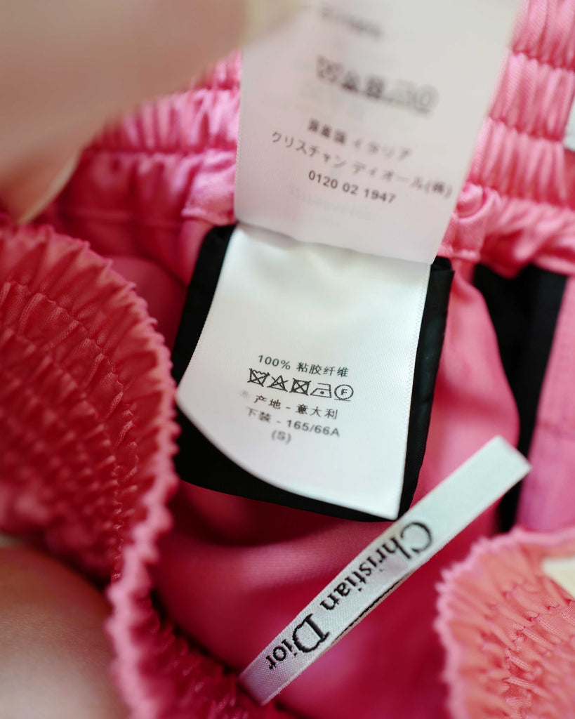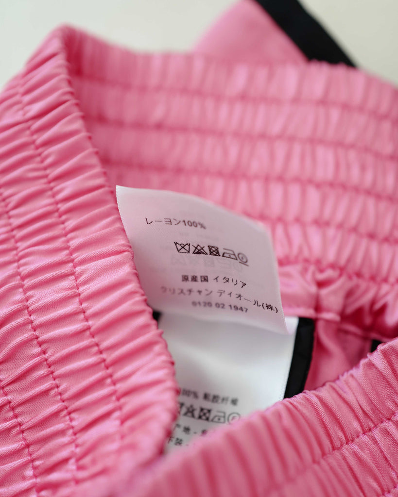 Barbie pink Dior silky boxer shorts from spring summer 2022, look 39. "DIOR-VIBE" on thick rubber application. The look was featured in five different colours on the runway.