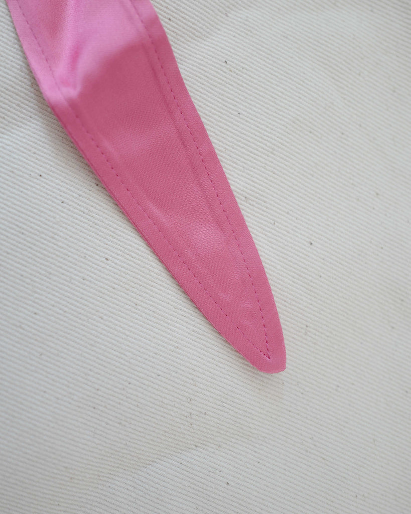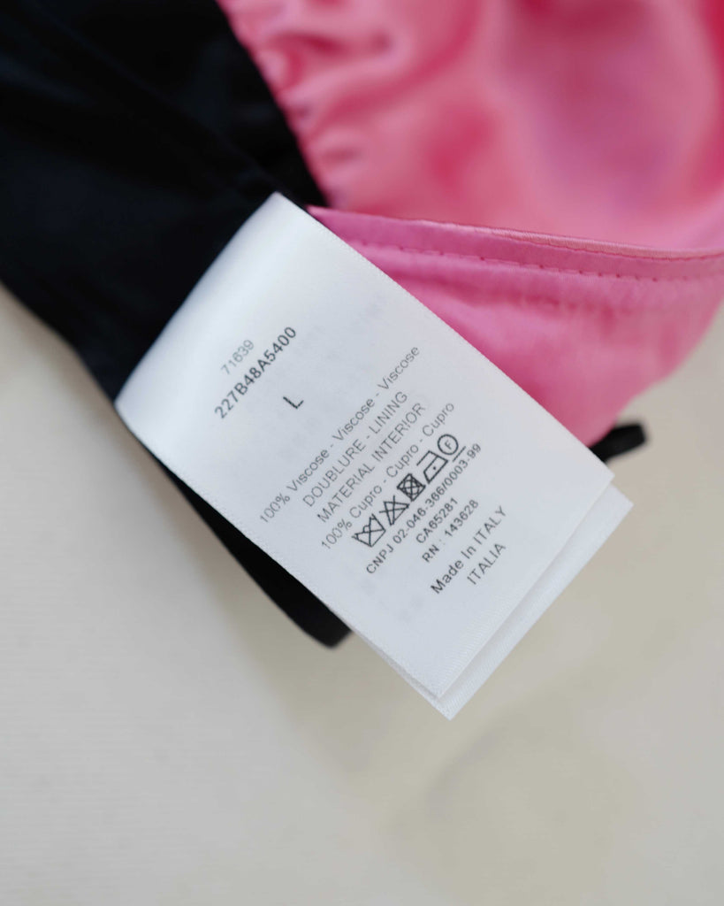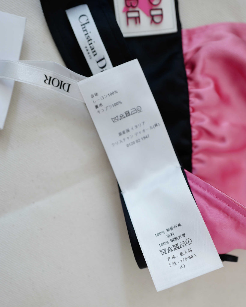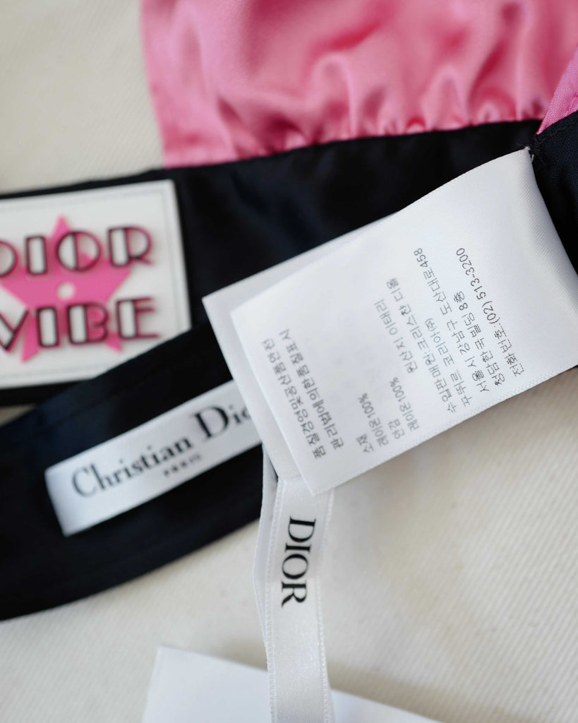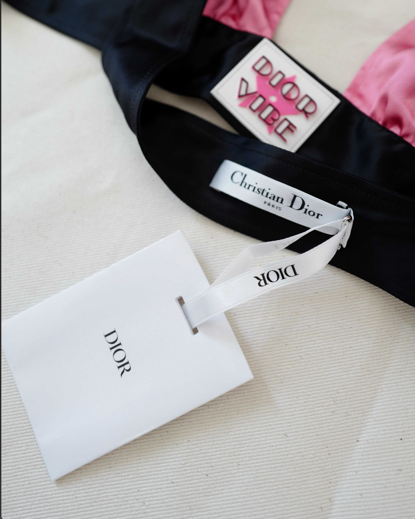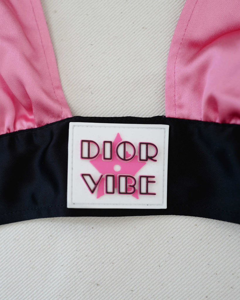 Dior silky tie-top from spring summer 2022, look 39. Top ties in back with black contrasting tie. "DIOR-VIBE" on thick rubber application. The look was featured in five different colours on the runway.