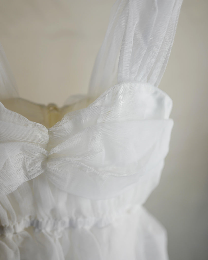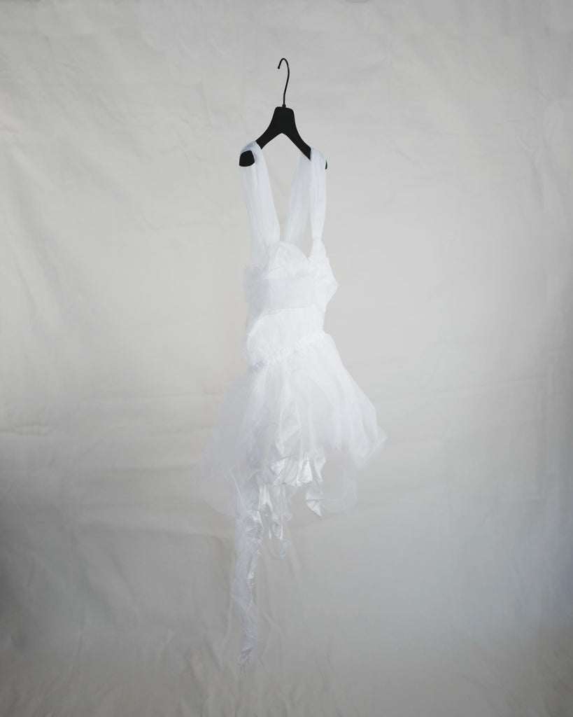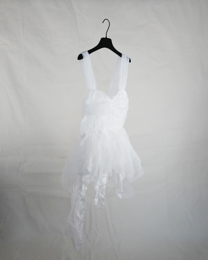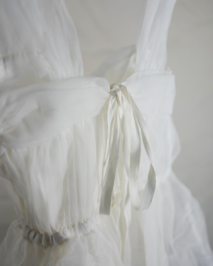 White MM6tulle ruffled top. Corset model, but no corset bones. Tie in back. Asymmetric cut in several layers an wide shoulder straps. Romantic fit with tulle fringes.