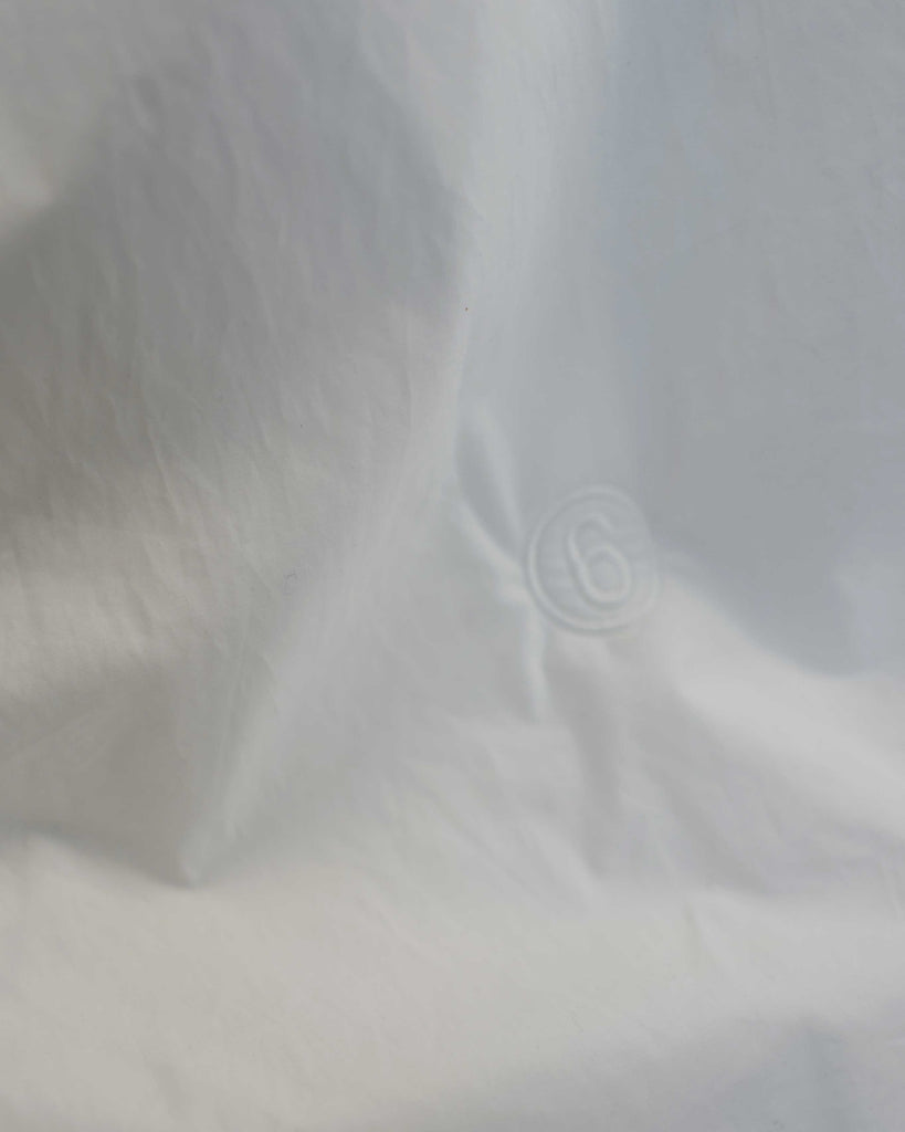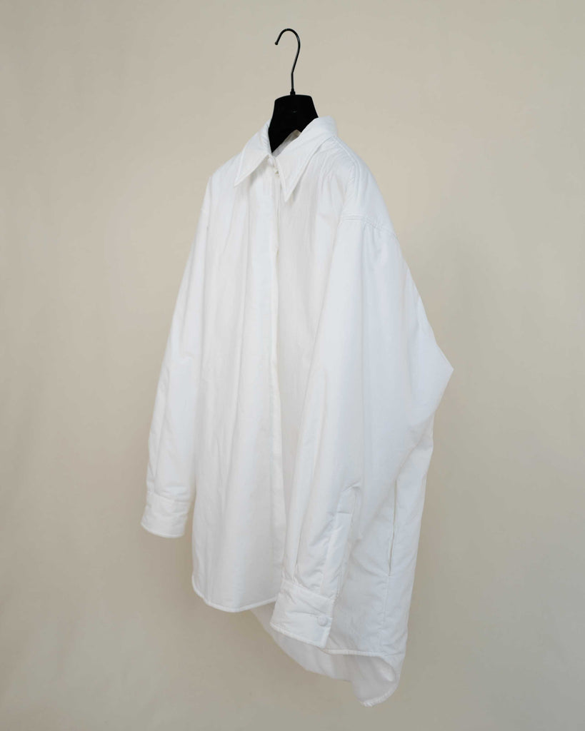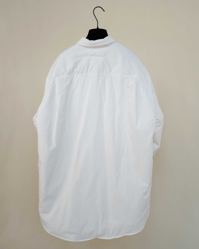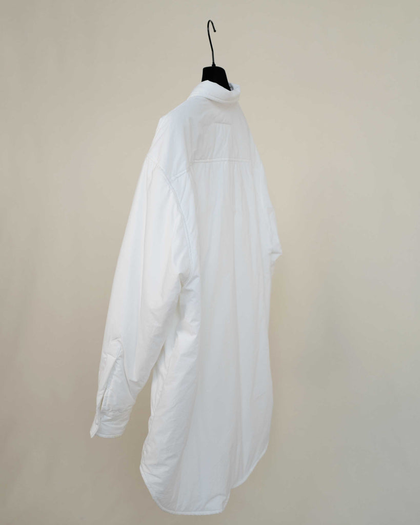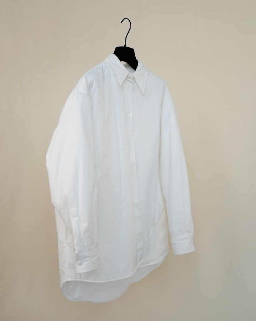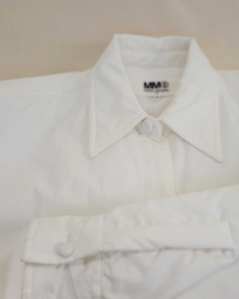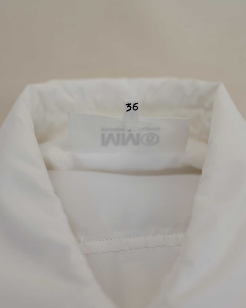 White light padded Margiela MM6 jacket in cotton. Peachy touch, covered top button and sleeve buttons. Pockets on each side.