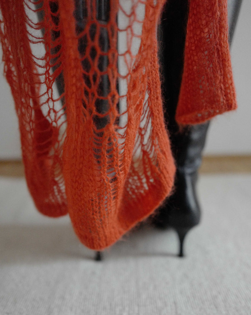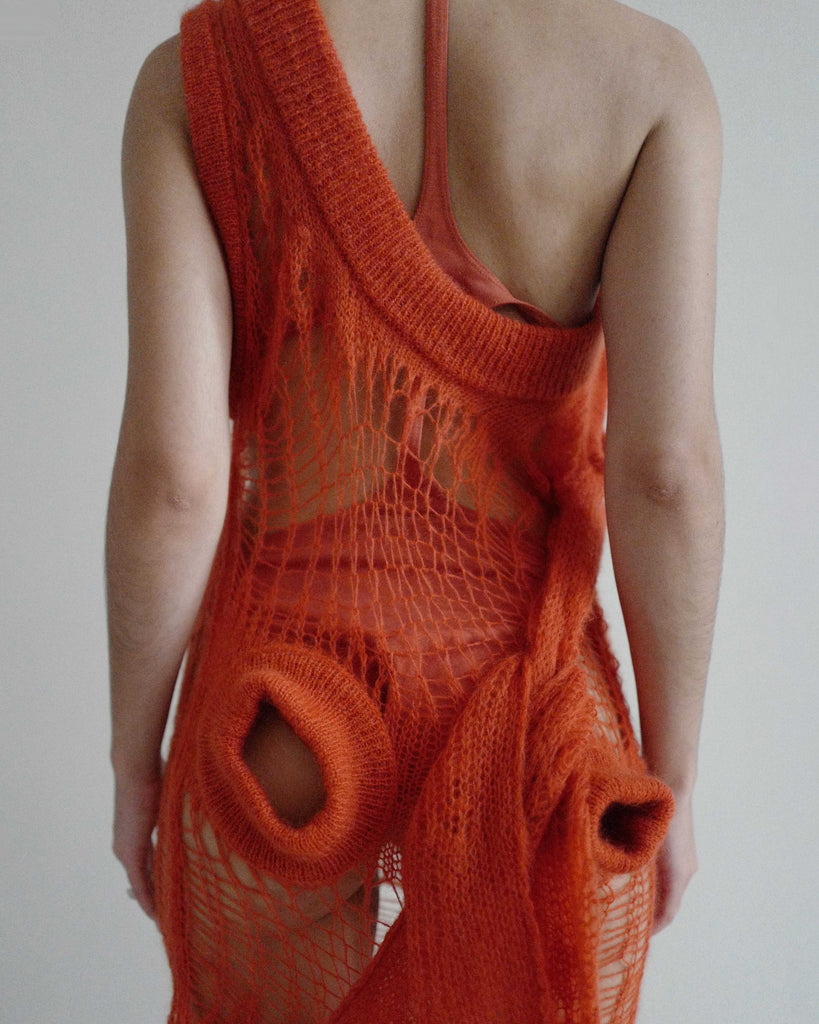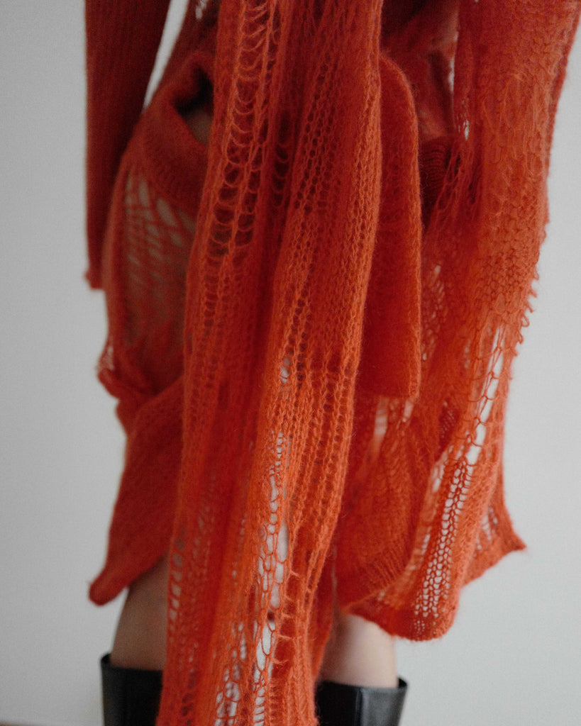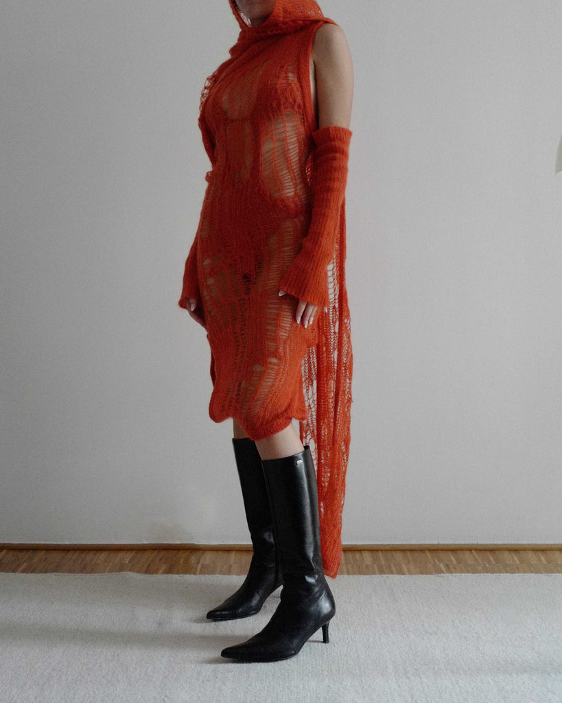 Rick Owens creative knit dress in okra. Multiple knit cuffs for styling.