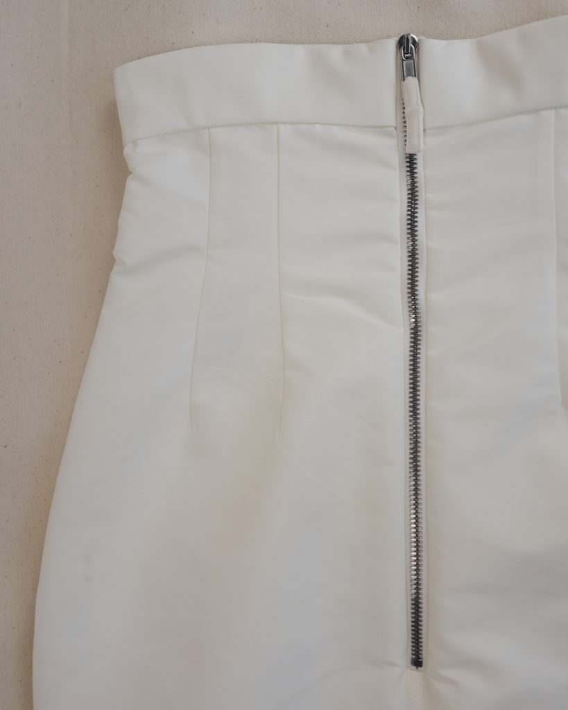 White mid-length pencil skirt. high waisted. Silver zipper in back. Thicker polyester.