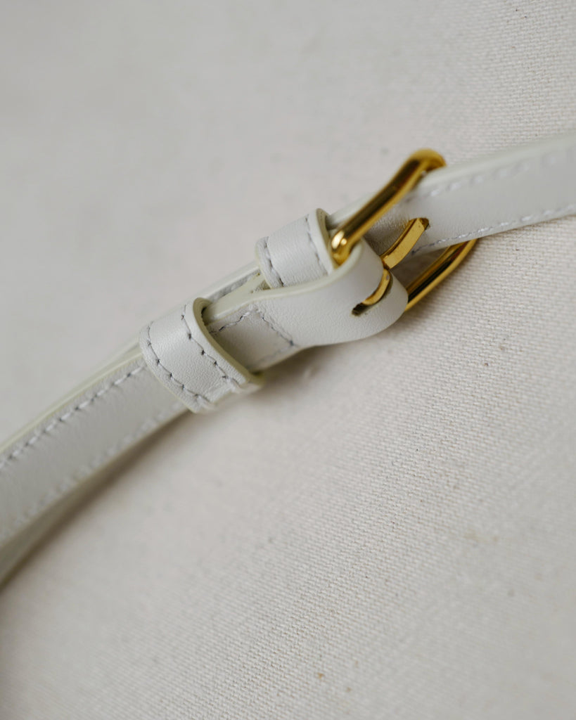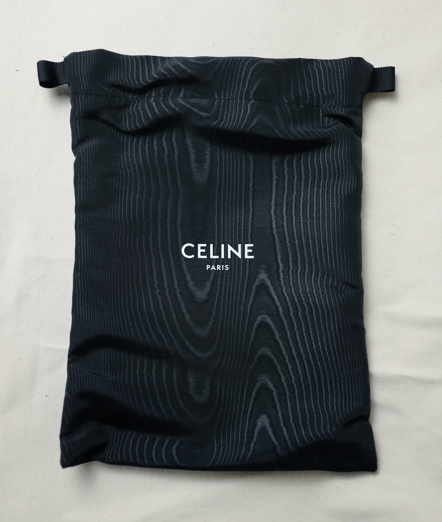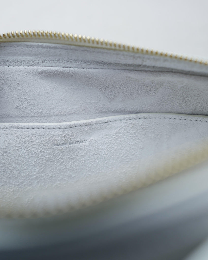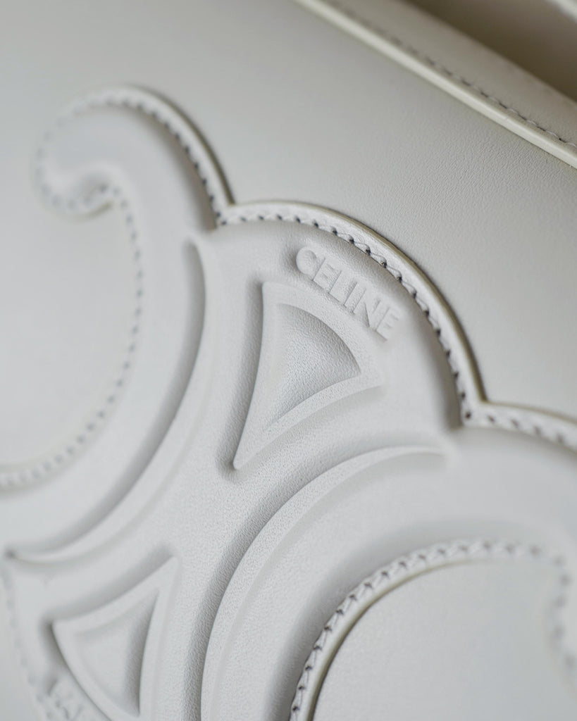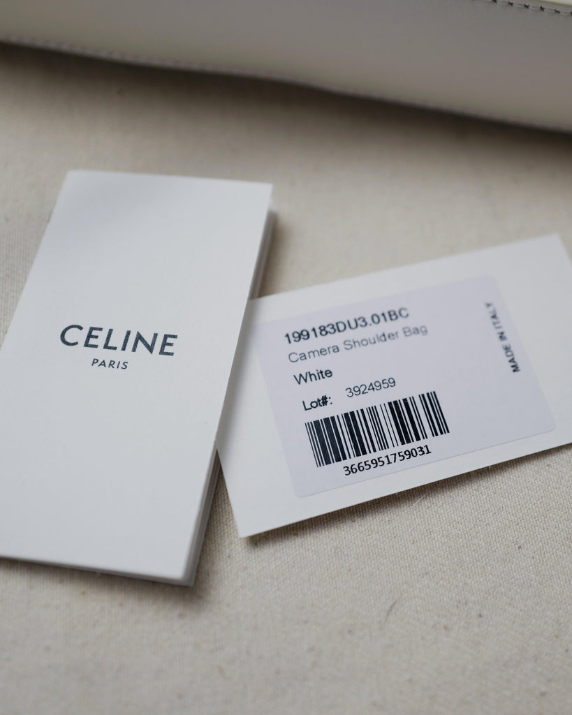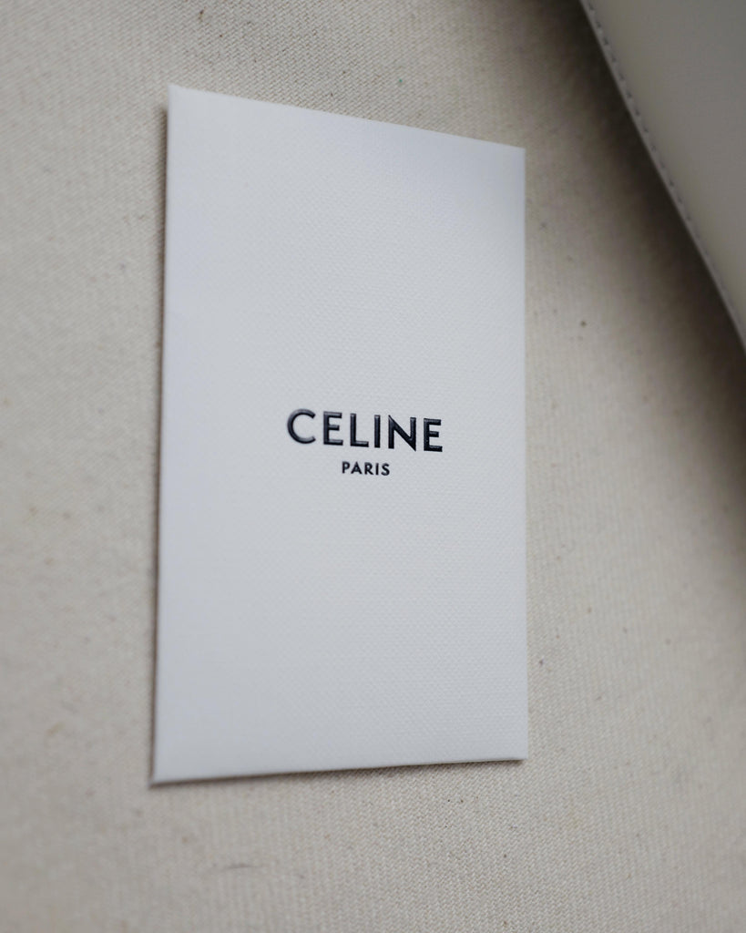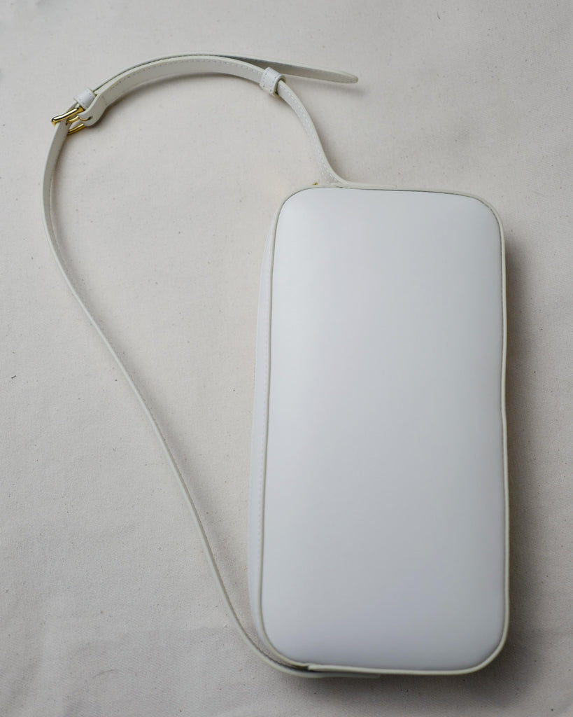 White rectangular Celine clutch bag with adjustable shoulder band. Gold coloured hardware. Closes with zipper.