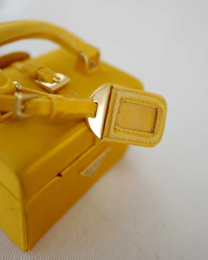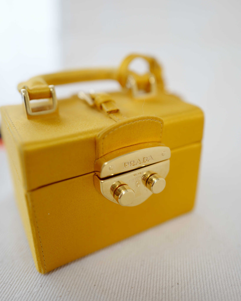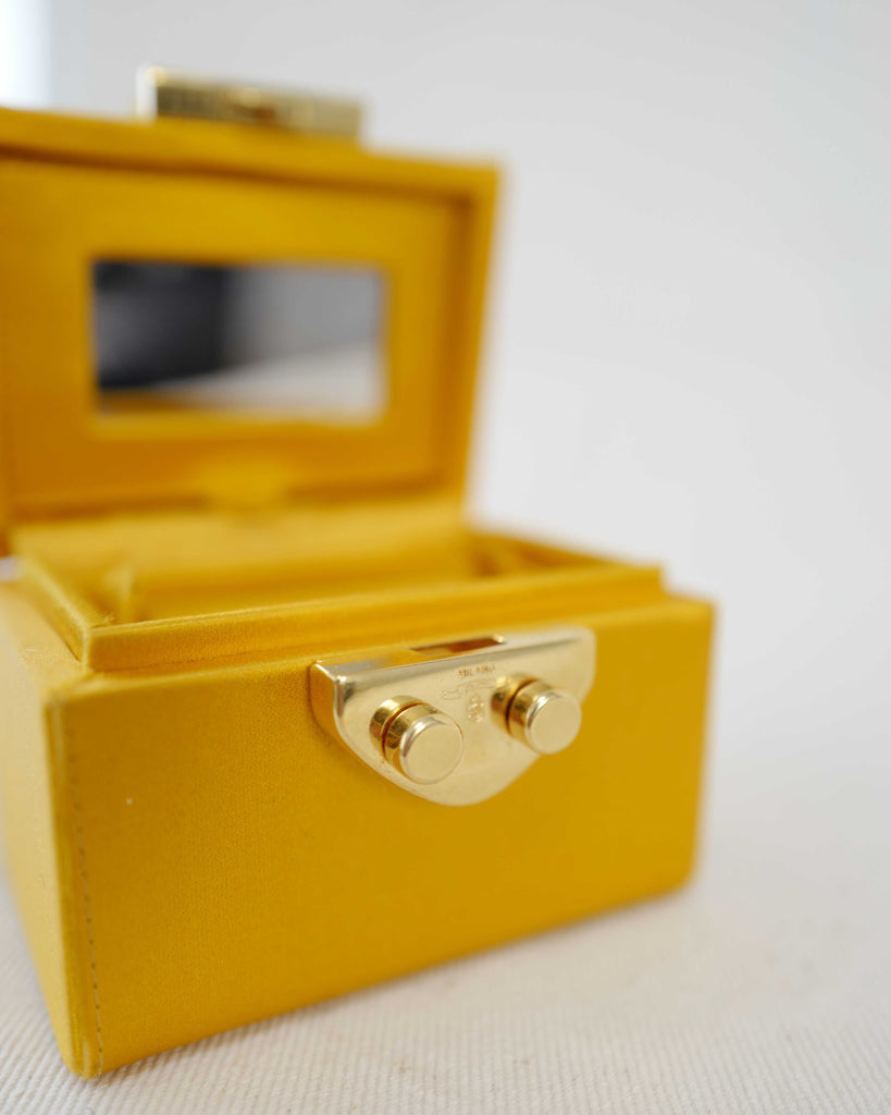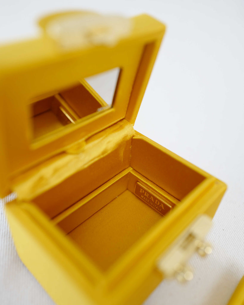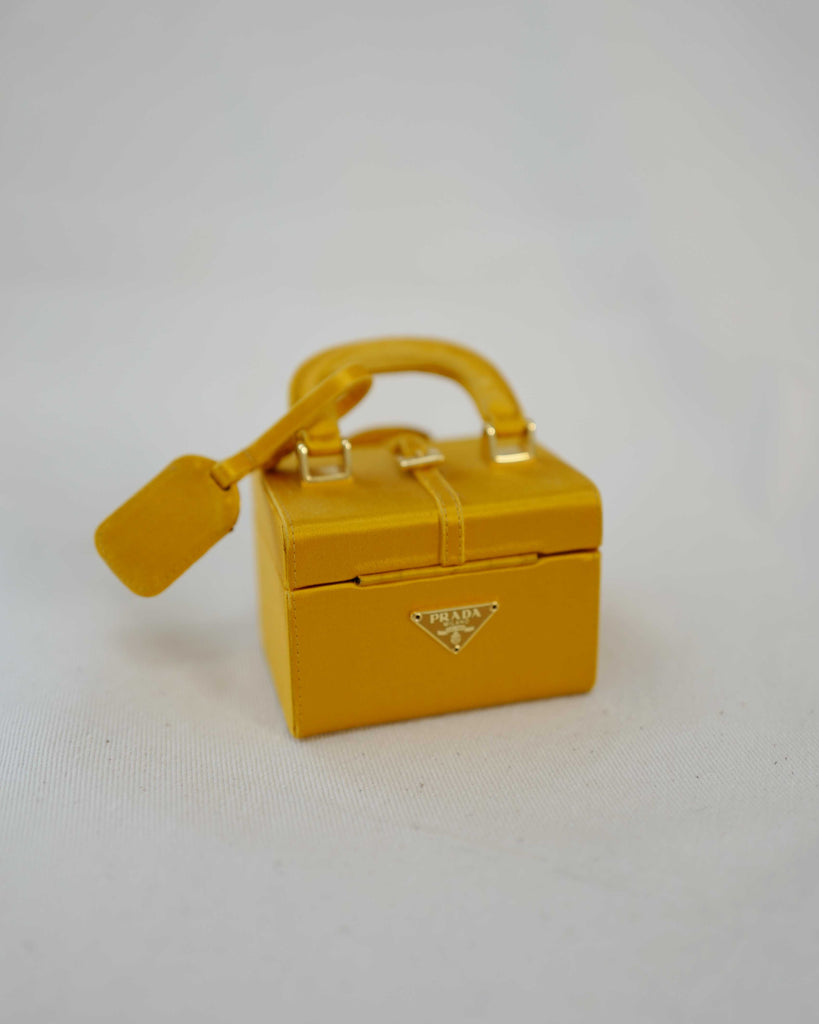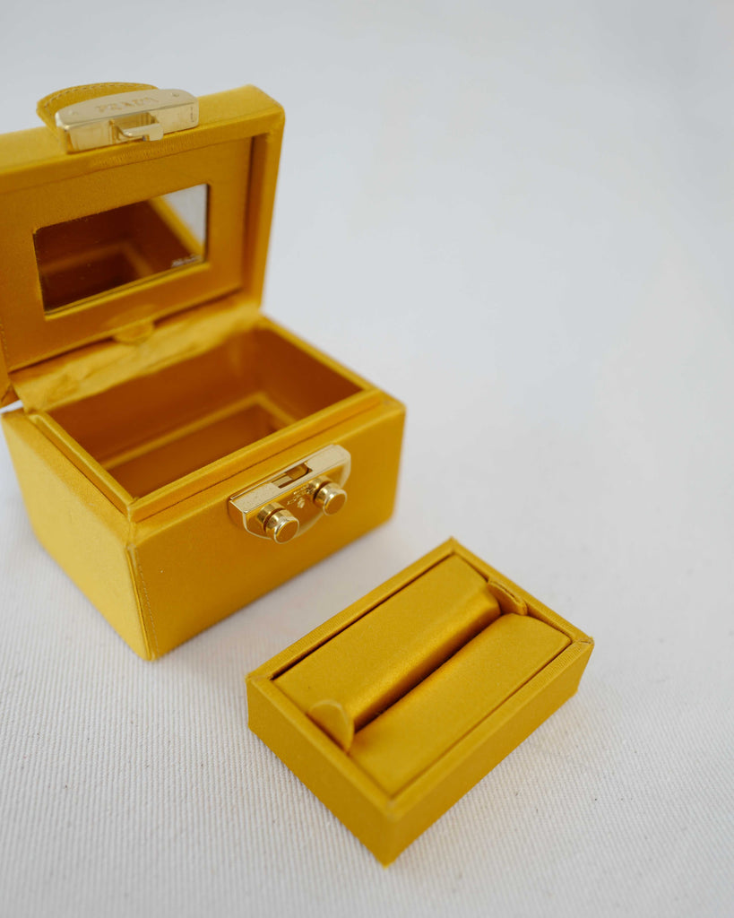 Rare gold-yellow satin Prada travel jewellery box with gold hard ware details. Removable adress tag. Hard handle. Mini mirror in top lock. Place for rings/earrings on top compartment and necklaces below.