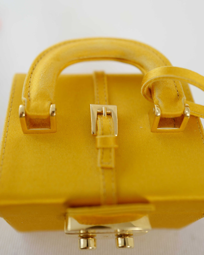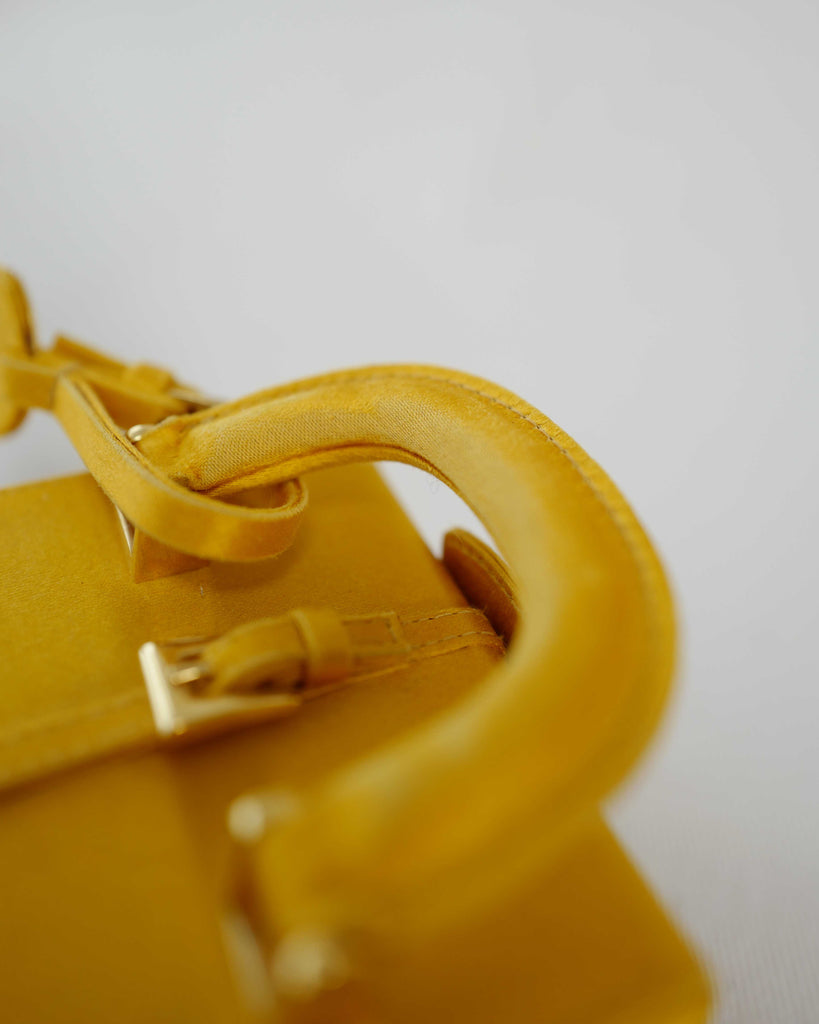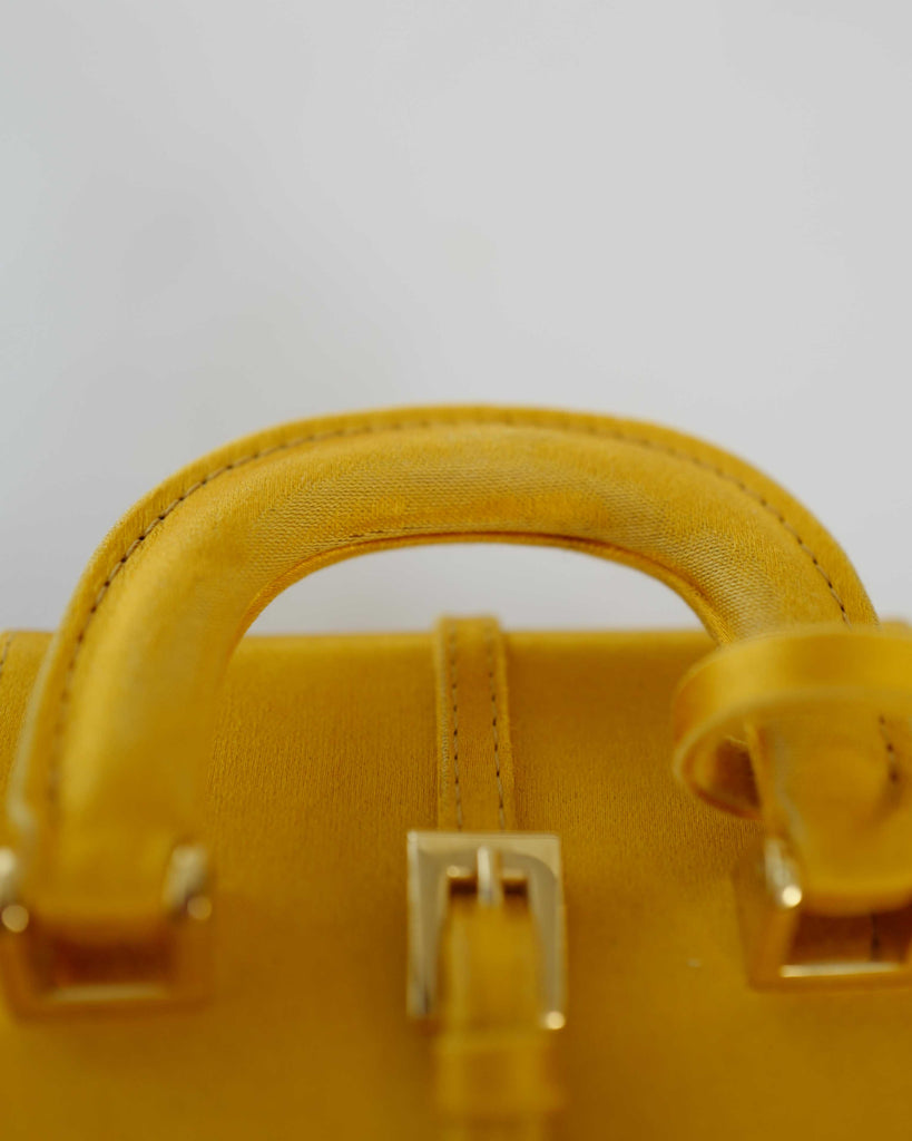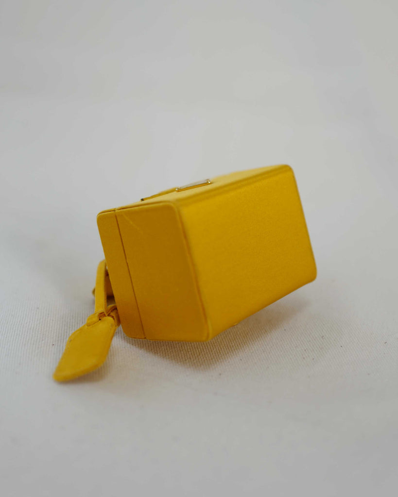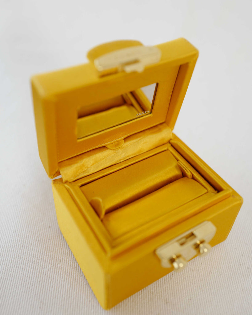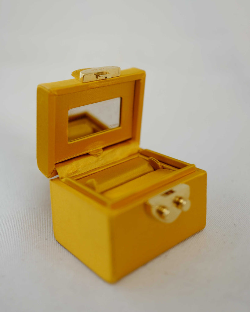 Rare gold-yellow satin Prada travel jewellery box with gold hard ware details. Removable adress tag. Hard handle. Mini mirror in top lock. Place for rings/earrings on top compartment and necklaces below.