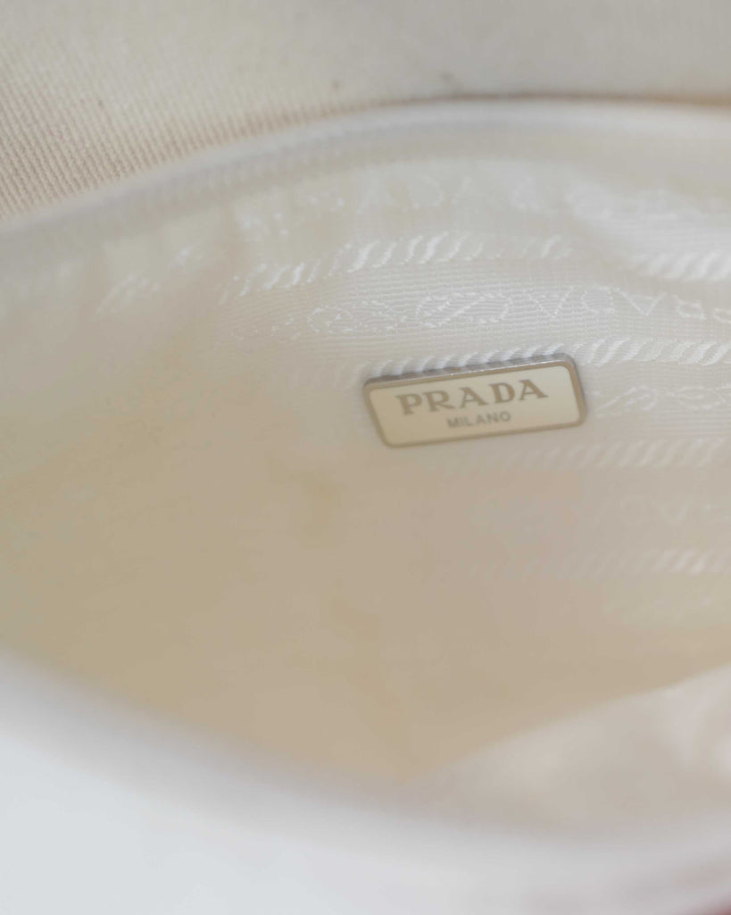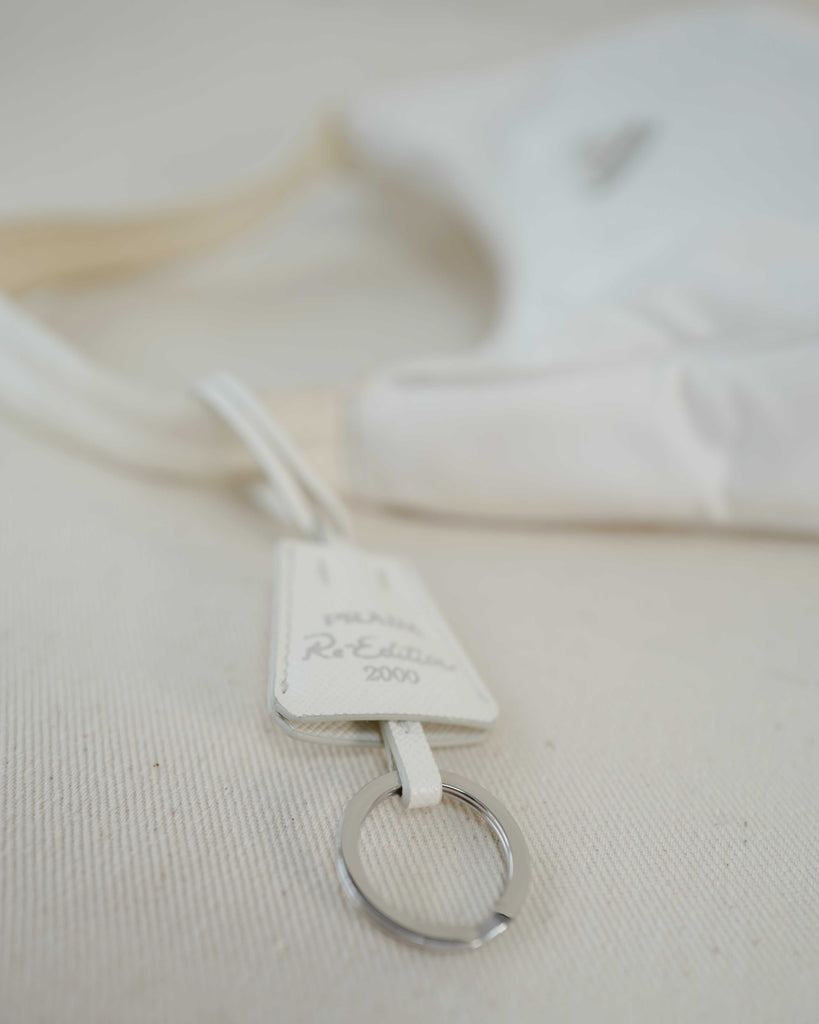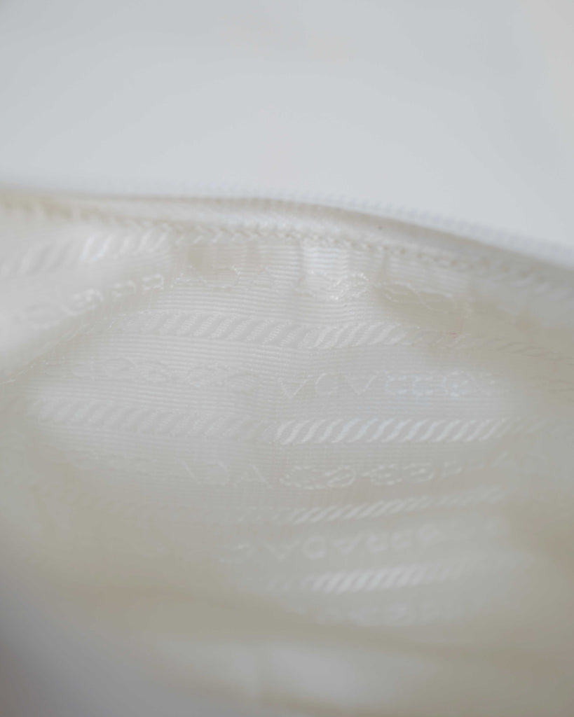 White Prada re-nylon re-edition 2000 bag with zipper closure. Enameled metal triangle logo. Woven tape handle and leather model tag. Removable Re-Nylon zipper pouch with Re-Edition keychain