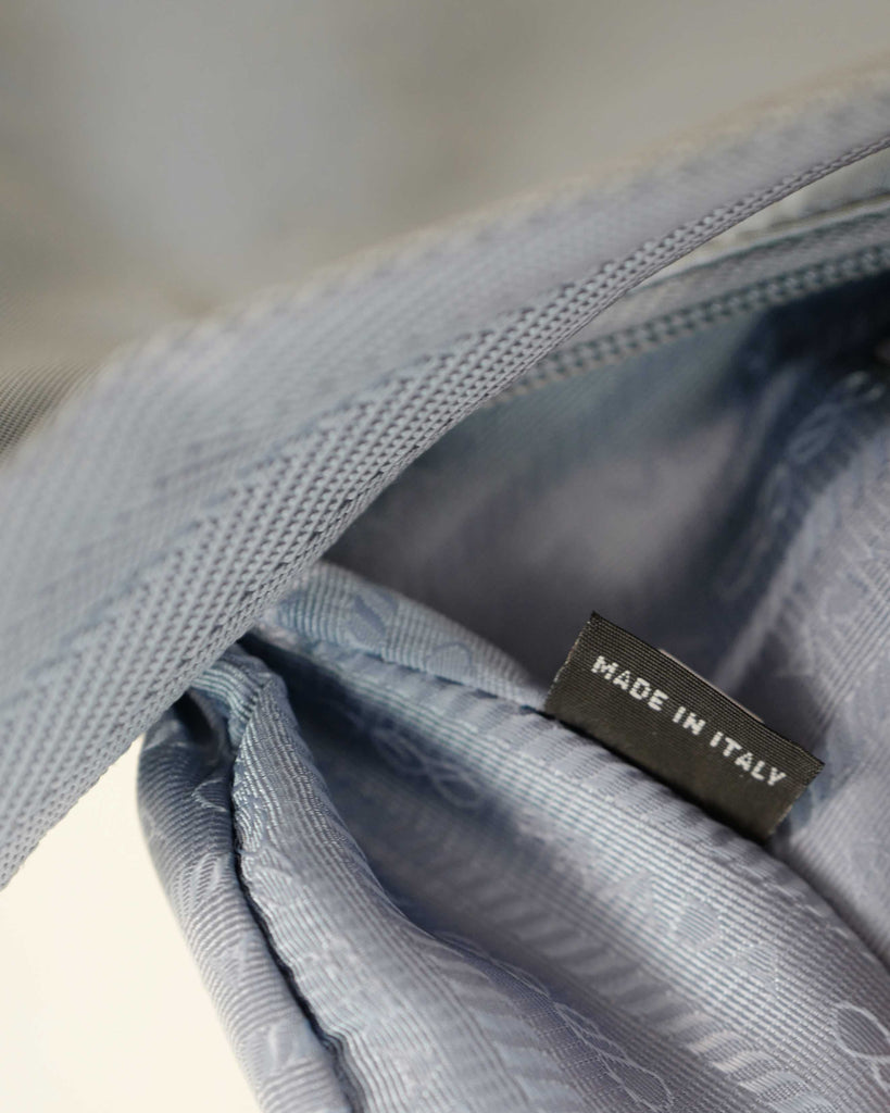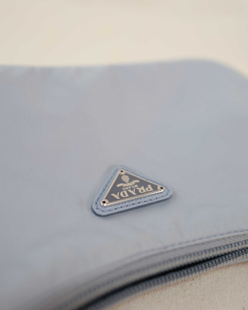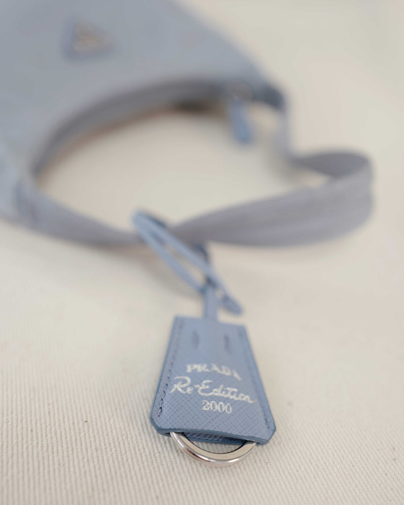 Light blue Prada nylon re-edition 2000 bag with zipper closure. Enameled metal triangle logo. Woven tape handle and leather model tag. Removable Re-Nylon zipper pouch with Re-Edition keychain.