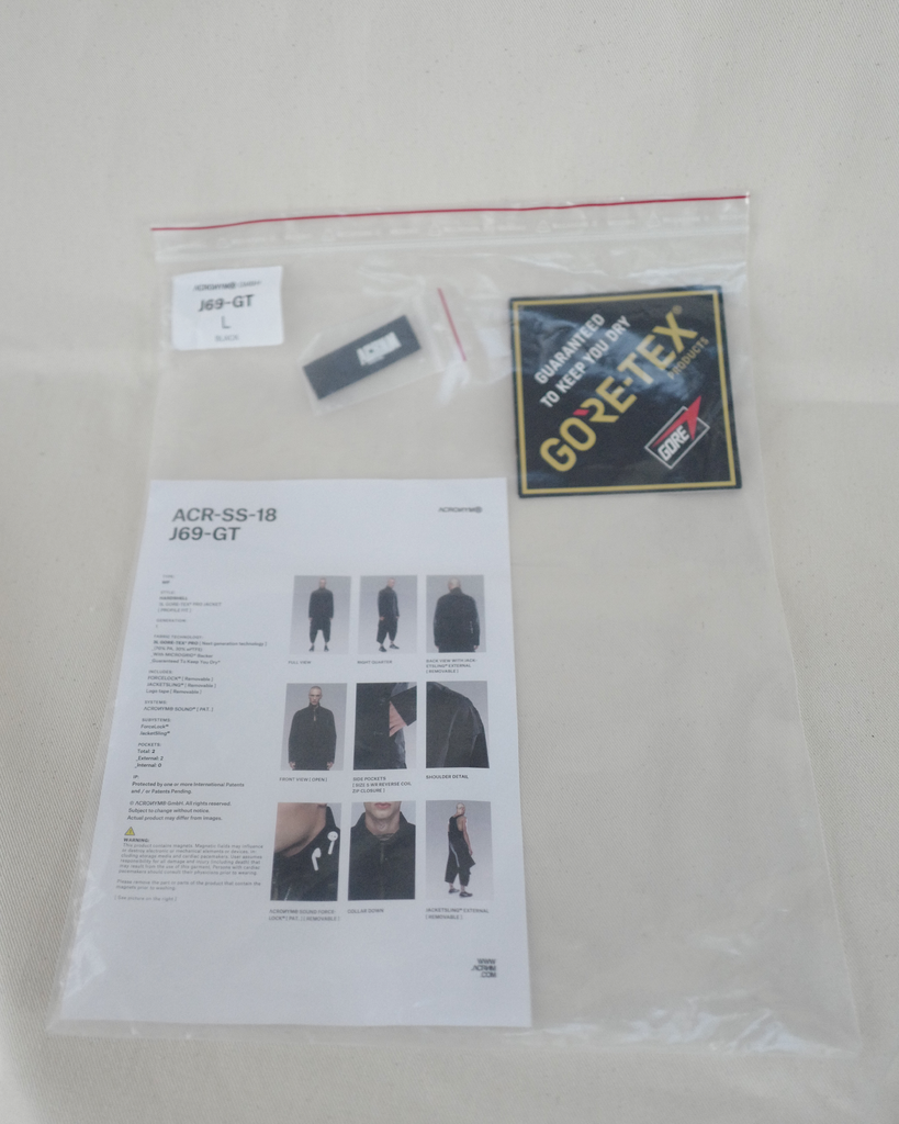 Black Gore-Tex jacket from Acronym style "HARDSHELL", generation 1 "J69-GT" fromm ACR-SS-18. Includes all removable parts such ass: forcelock, jacketsling, and logo tape. Two pockets in total. Comes with ziplock, paper documentation and tags.