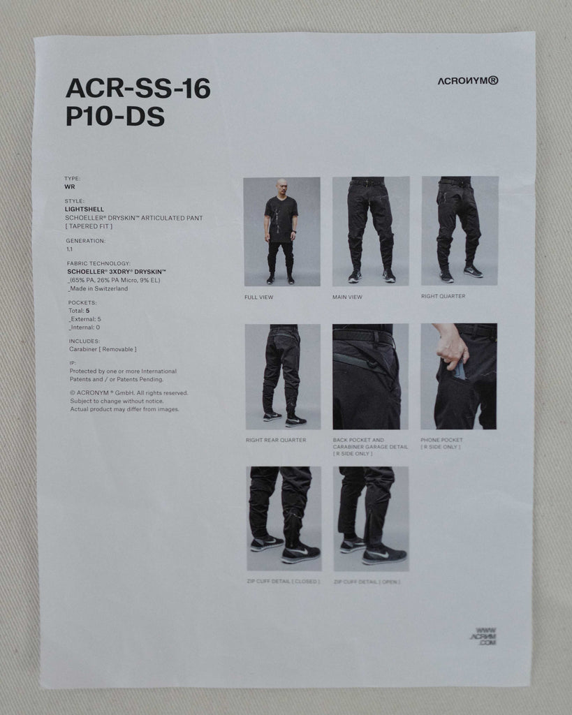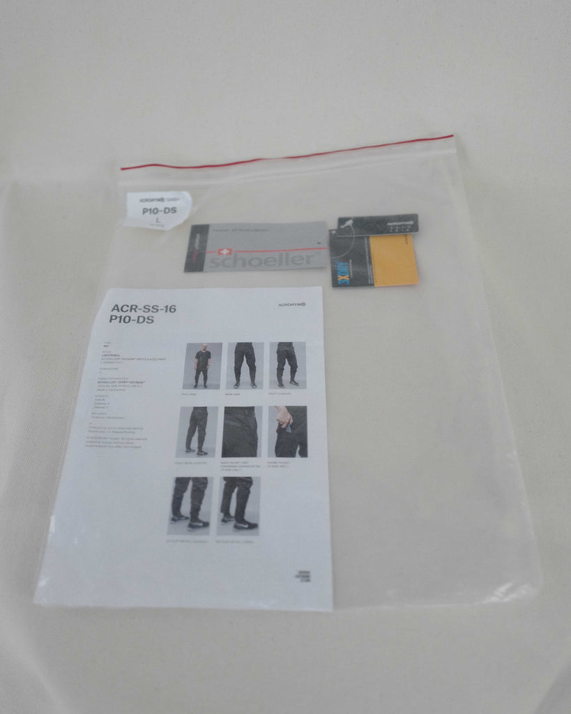 Acronym WR Lightshell pants from SS16. 5 pockets, generation 1.1. Including carbiner, coverpage, ziplock and tags.