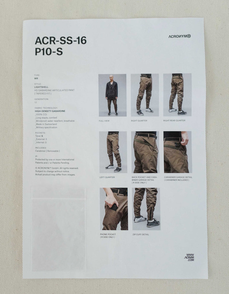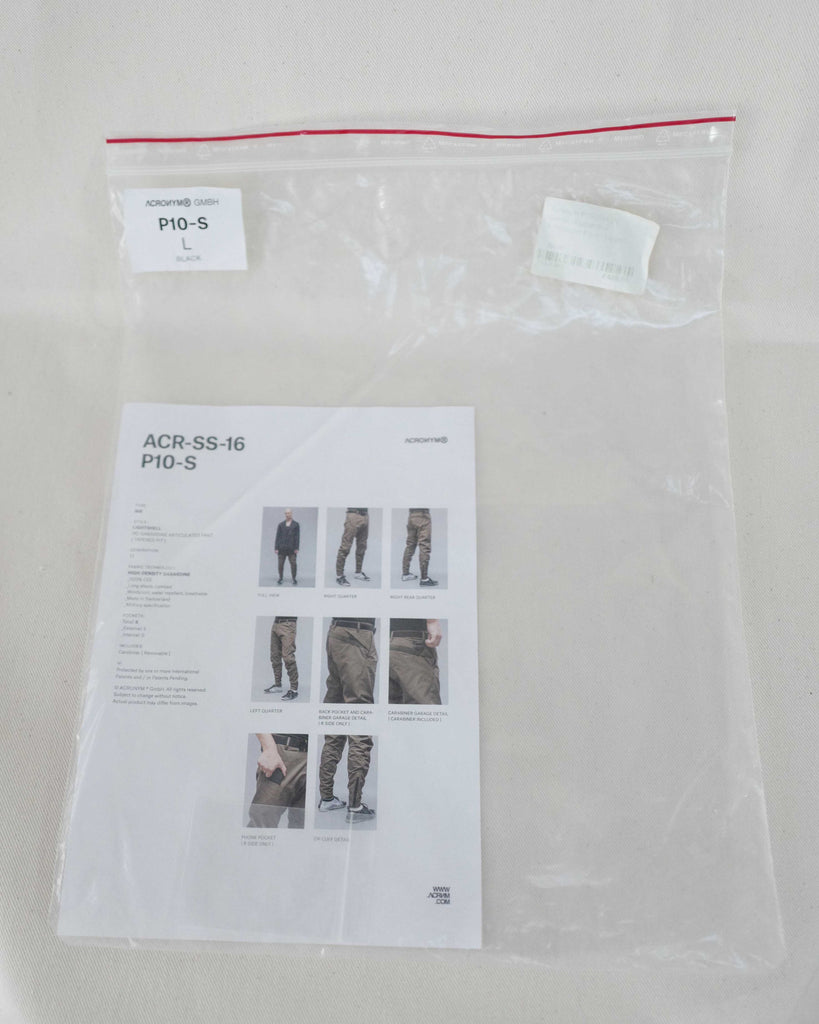 Acronym Mens Pants SS16 P10-S. Lightshell, generation 1.1, 5-pocket pants with carbin. Ziplock, cover page and tags included.