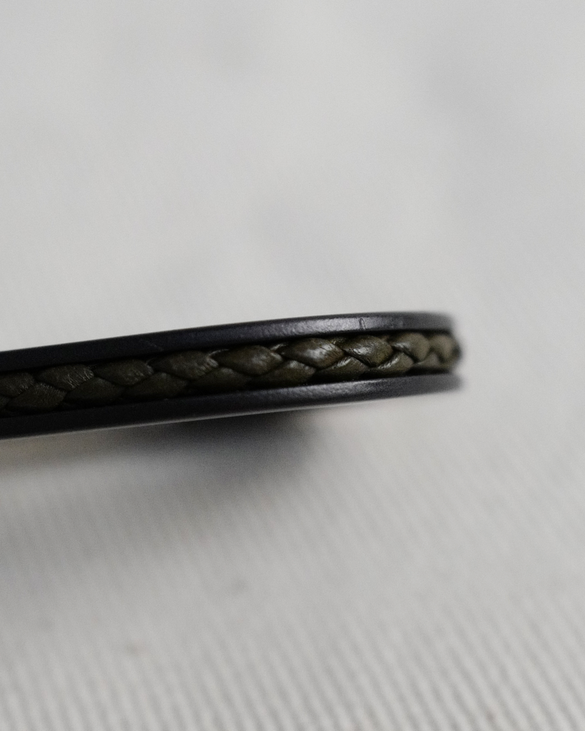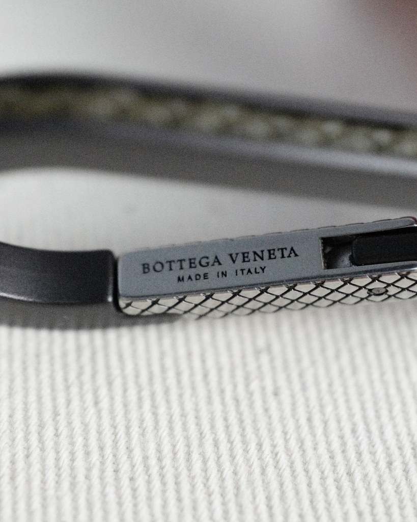 Bottega Veneta key chain hook in metal with olive green leather details and characteristic Bottega Veneta pattern on silver part.