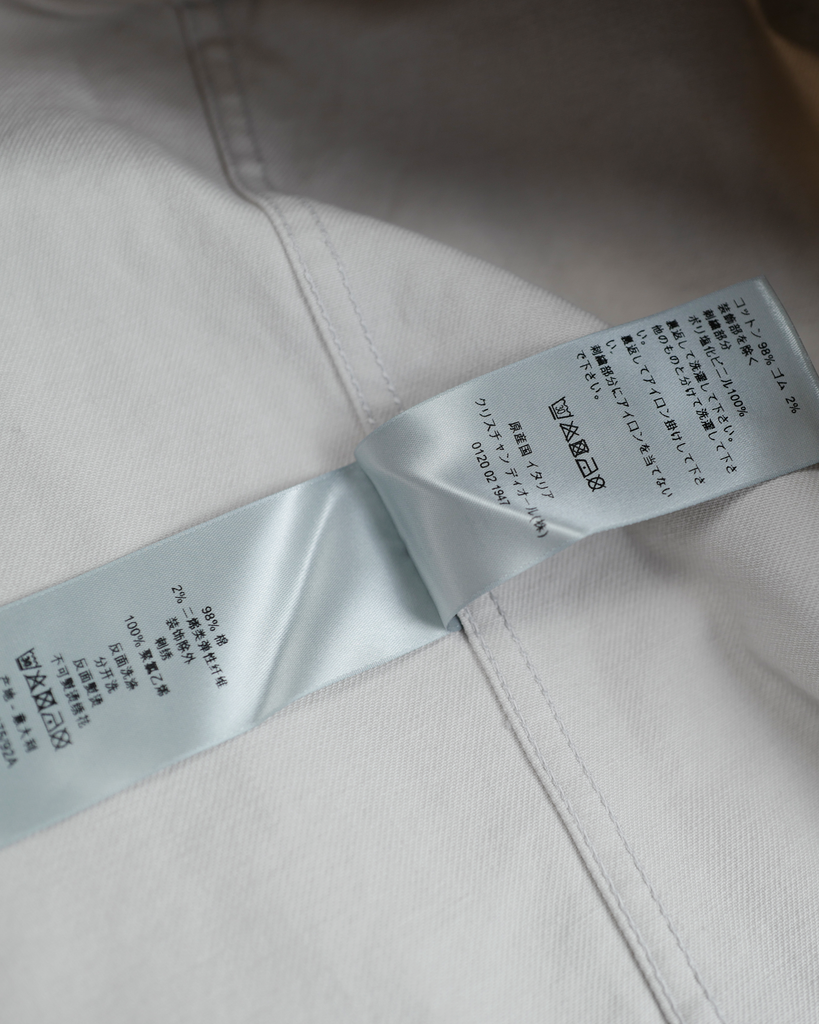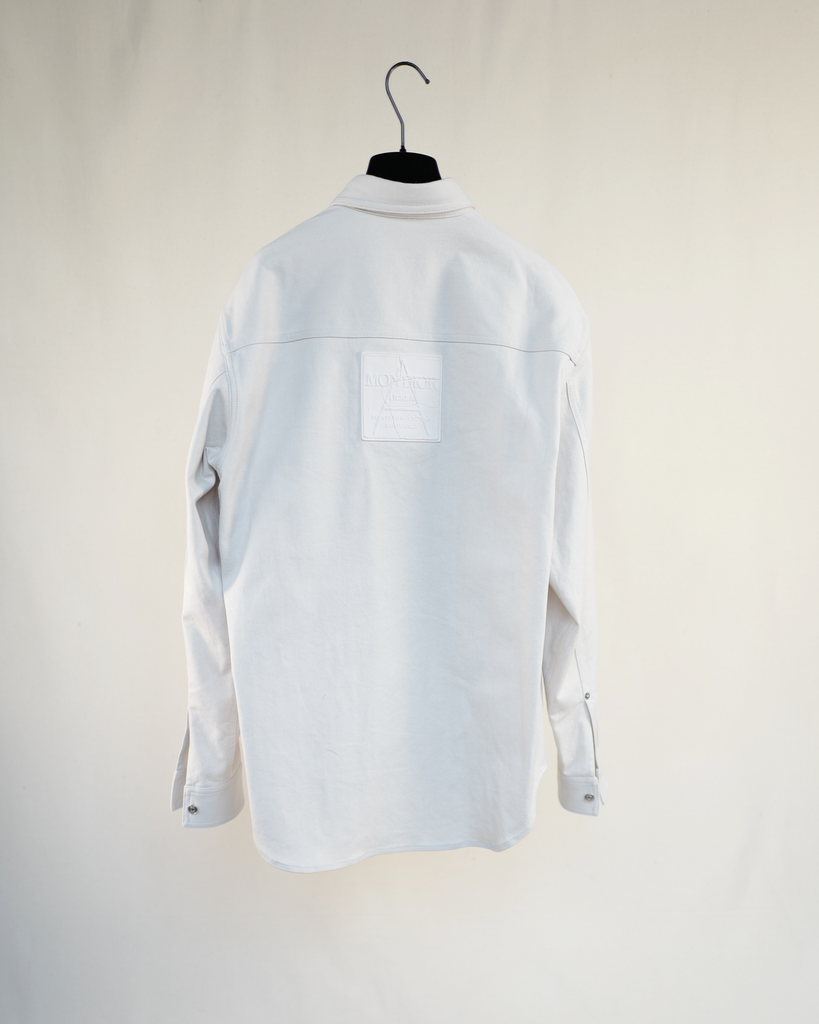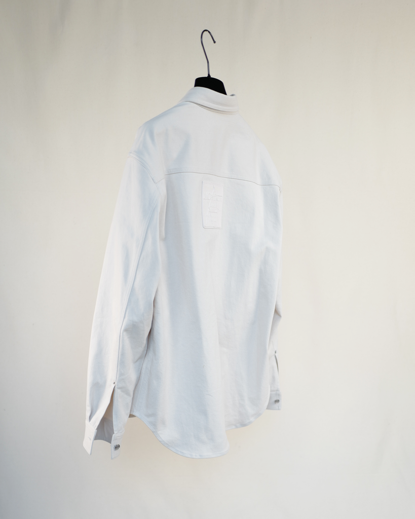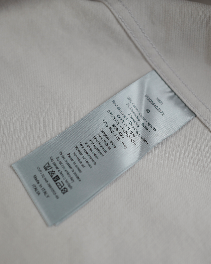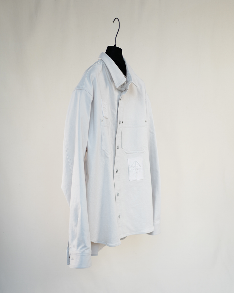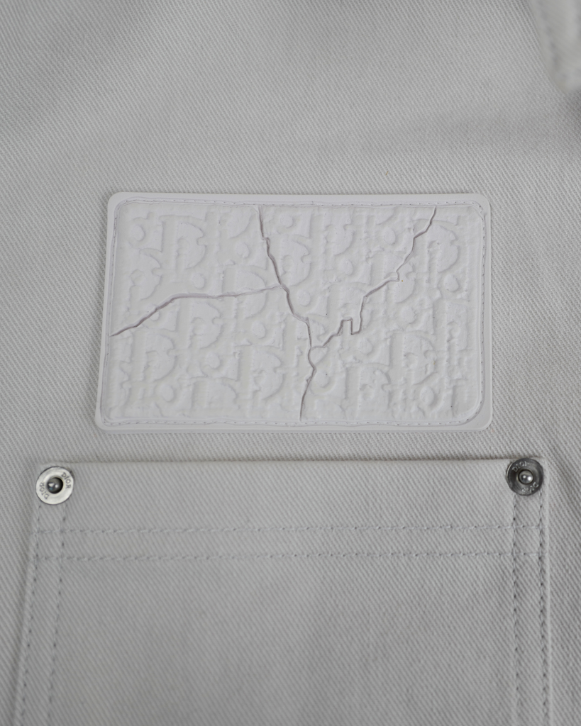 Over shirt or light jacket in beige jeans from Dior spring summer 2020 collaboration with artist Daniel Arsham. Matte silver details and embossed PVC decoration by the artist.
