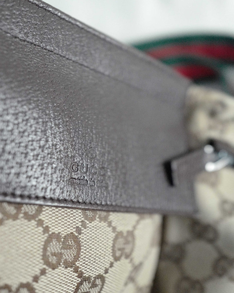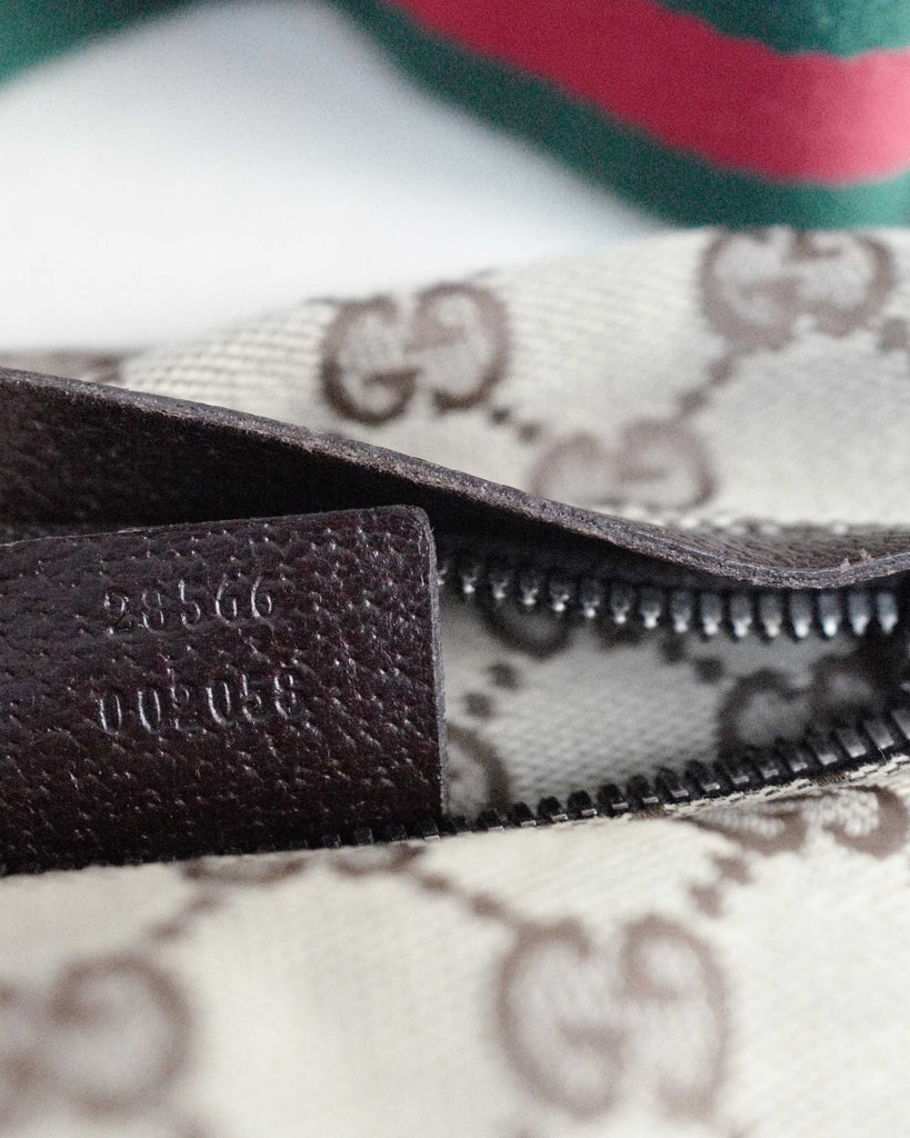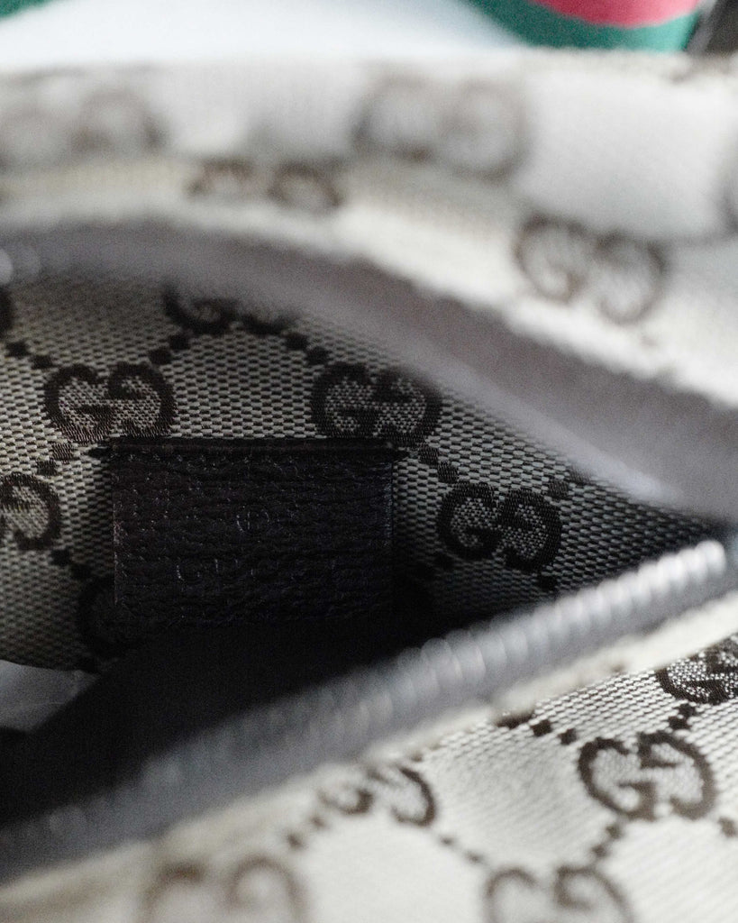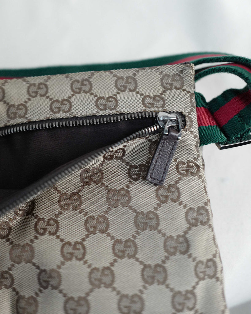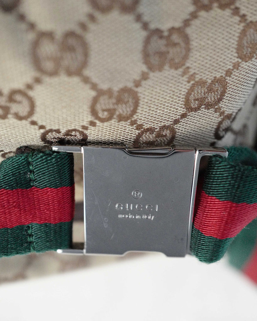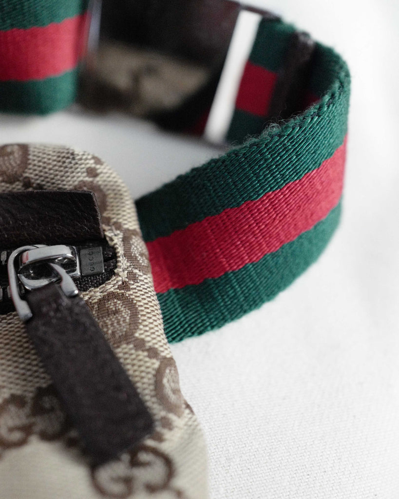 Classic Gucci two pocket belt bag in GG canvas. Red and green canvas shoulder string with silver details. Brown leather trims. First pocket closes with velcro, second with zipper. Backside with longer zipper pocket. Lined in Gucci brown canvas.