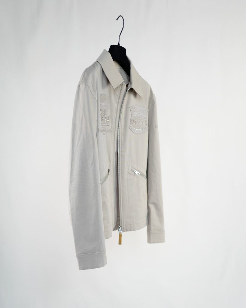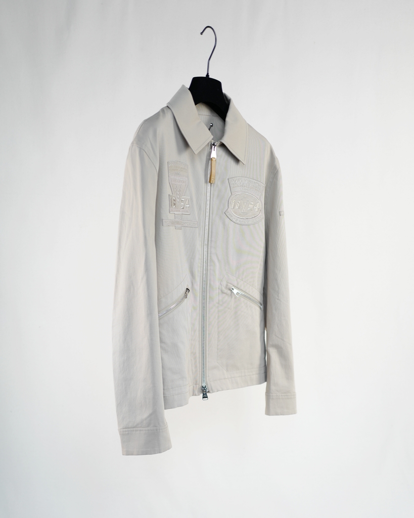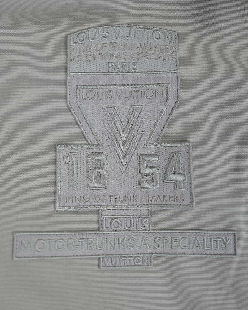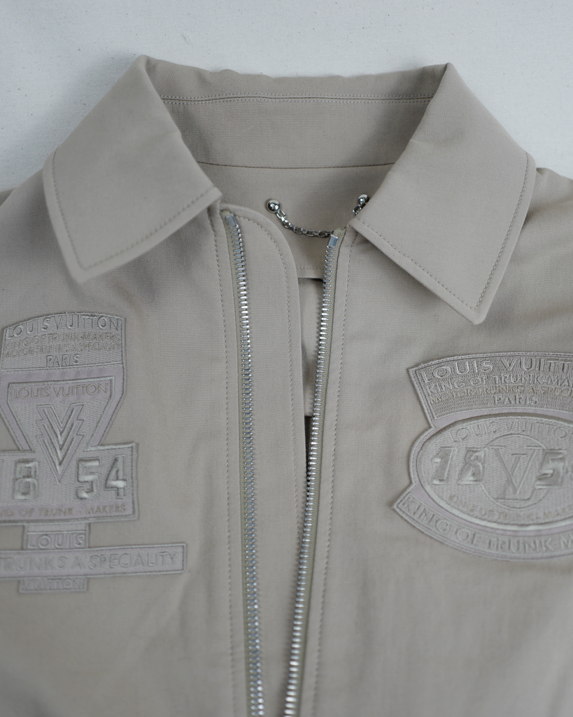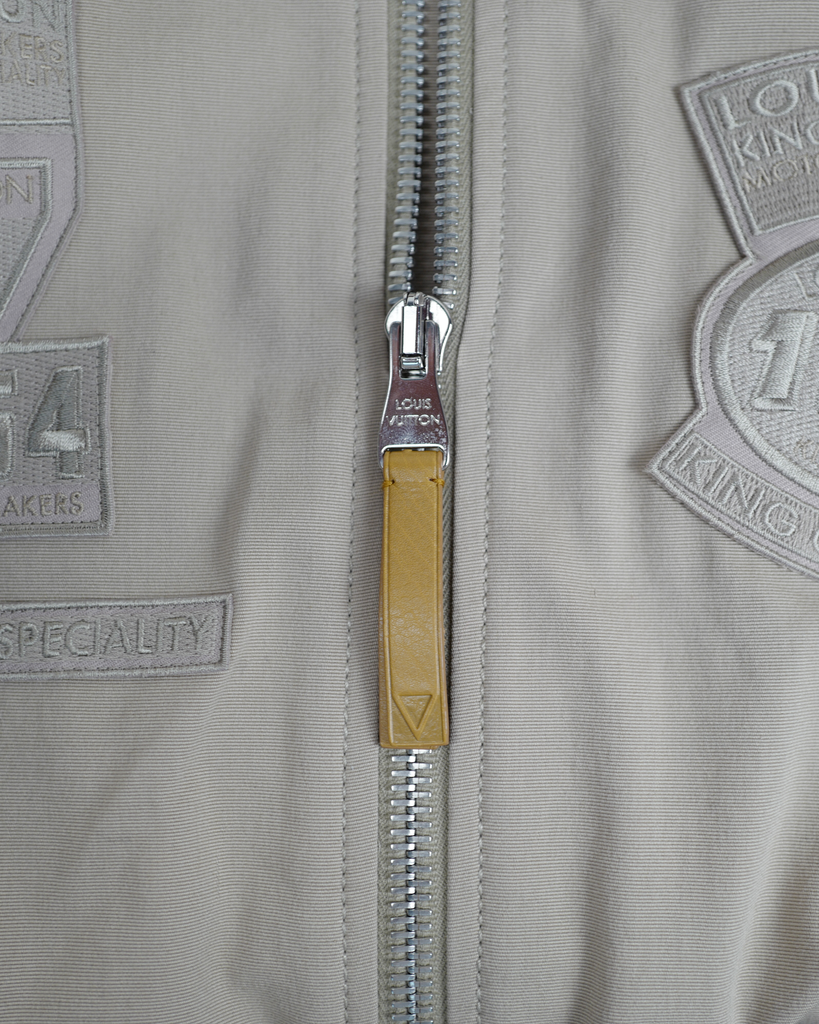 Beige/sand coloured Louis. Vuitton jacket in shorter model. Silver zipper with natural tanned leather strap to close, silver zippers on pockets. Two. pockets on front, one inner pocket. Silver chain hanger in neck. A mix of rubber and embroidery badges as decor with text and logos, please see photos.