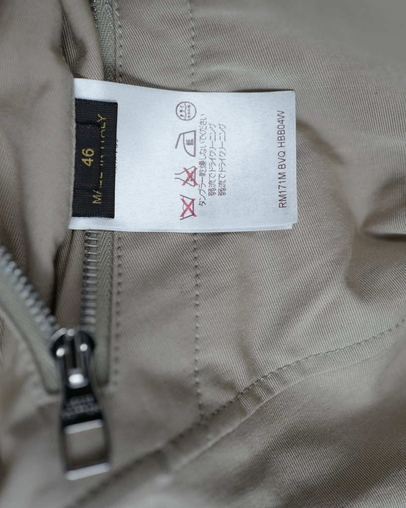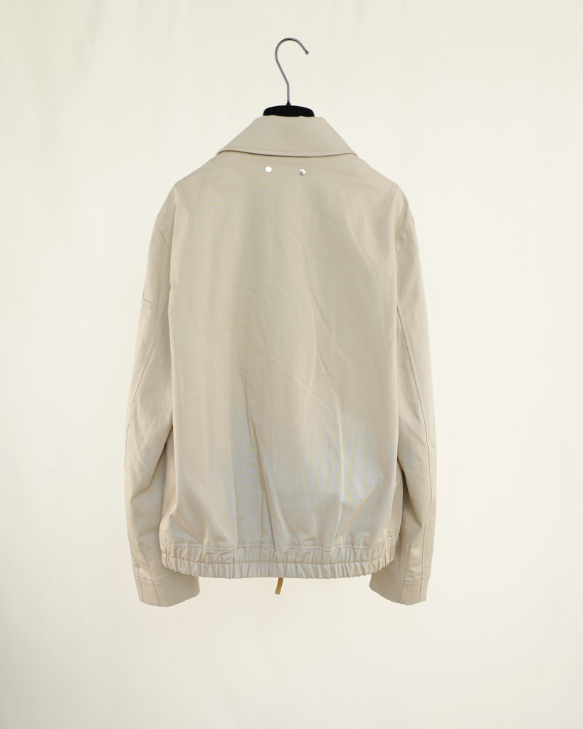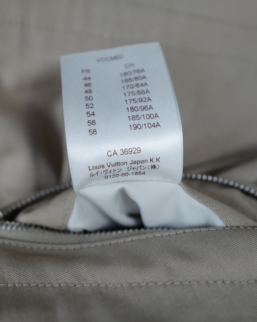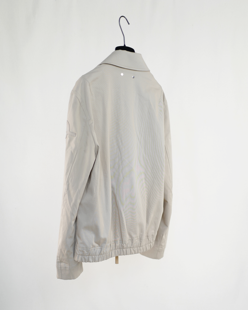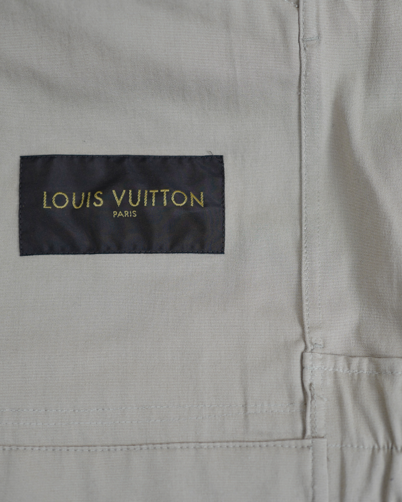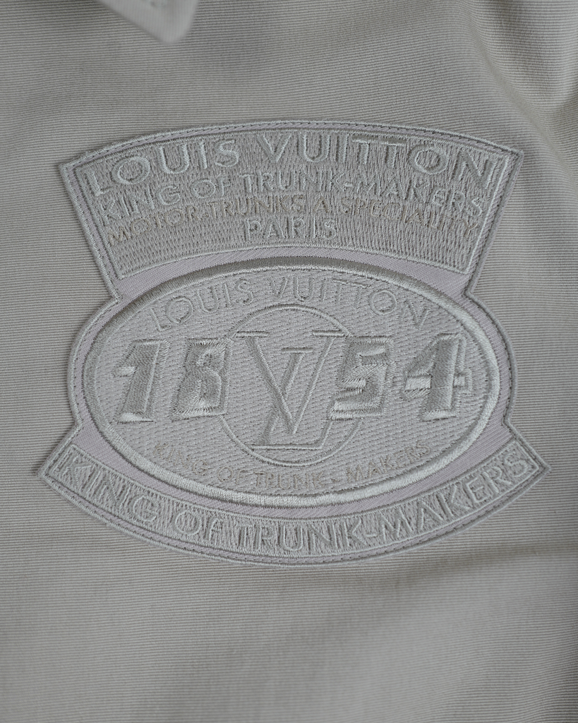 Beige/sand coloured Louis. Vuitton jacket in shorter model. Silver zipper with natural tanned leather strap to close, silver zippers on pockets. Two. pockets on front, one inner pocket. Silver chain hanger in neck. A mix of rubber and embroidery badges as decor with text and logos, please see photos.