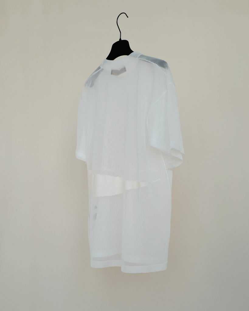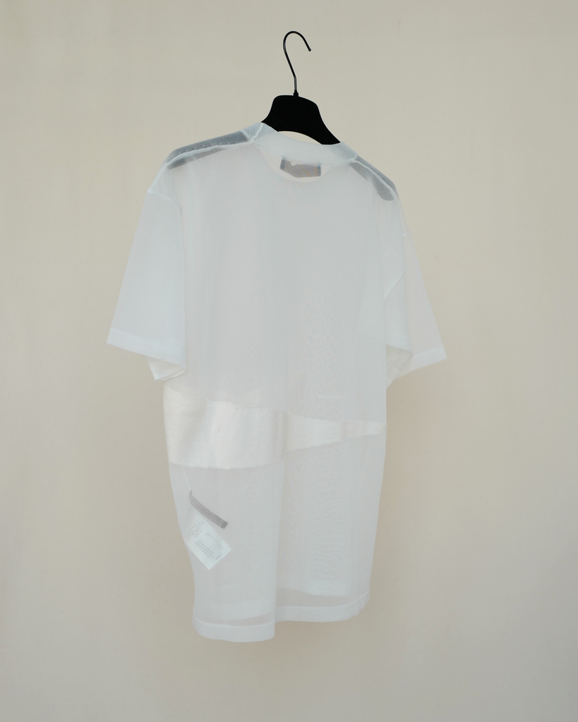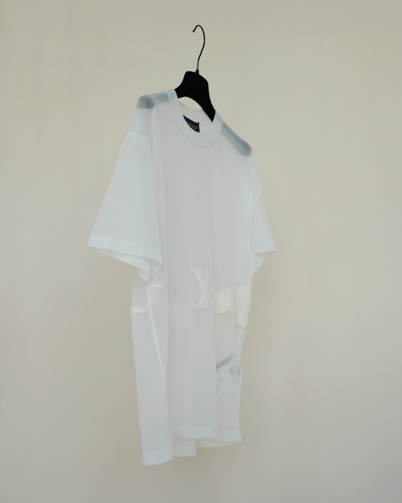 White sheer, light transparent Louis Vuitton knitted t-shirt. Non transparent knitdetails on front. forming LV.
