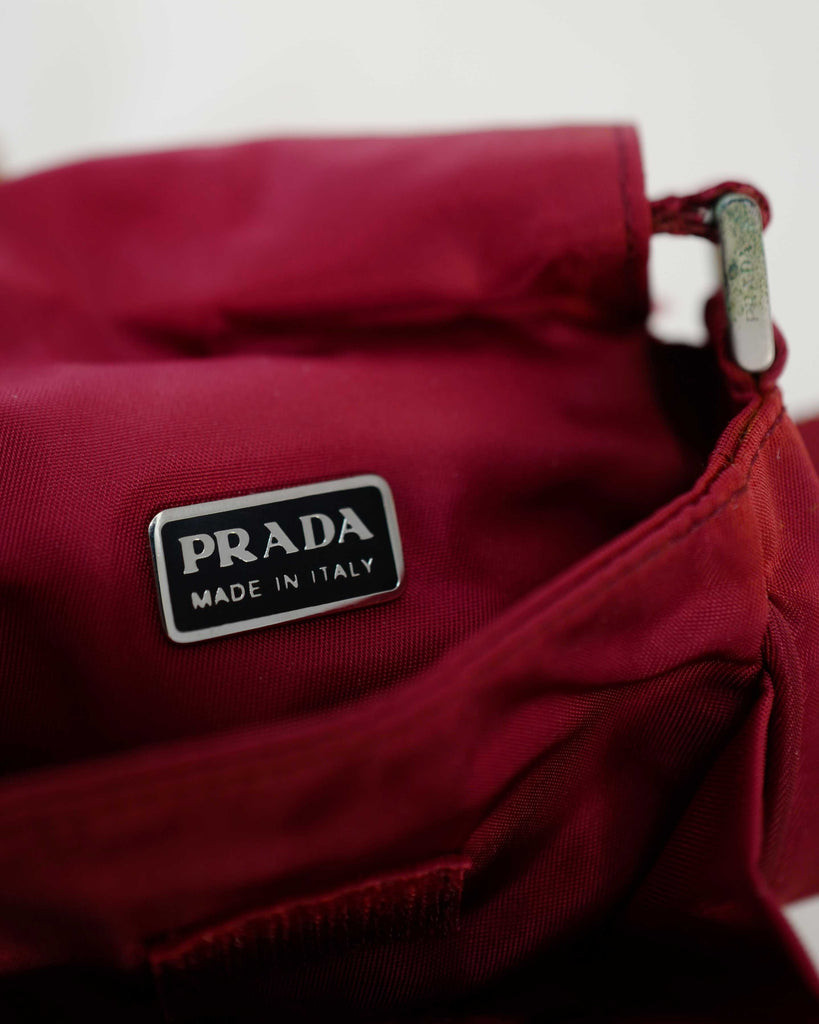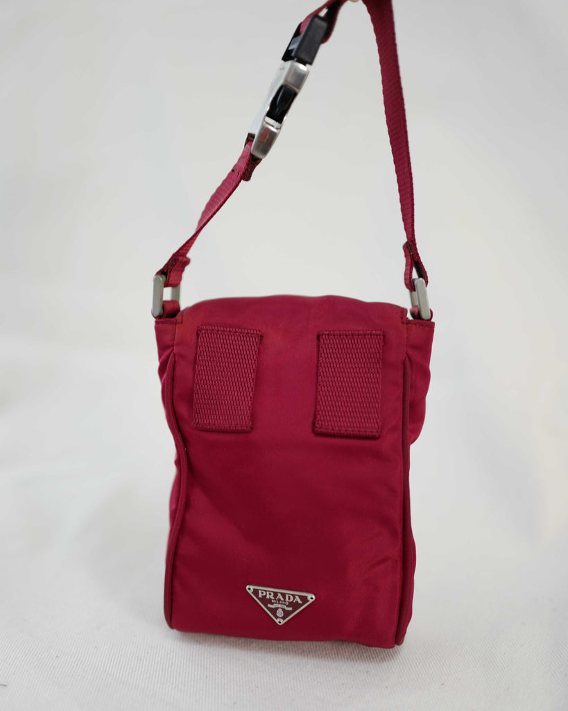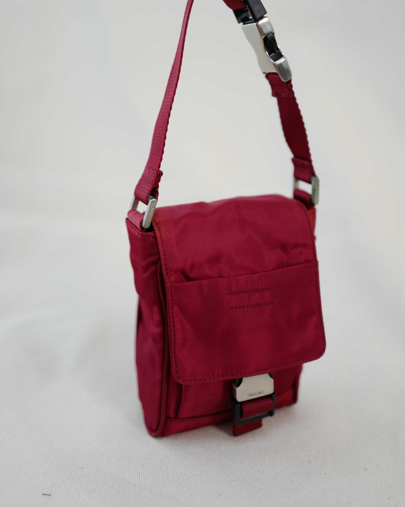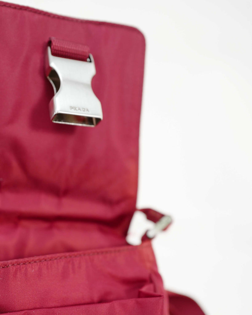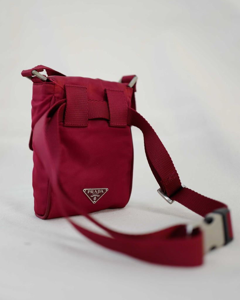 Red smaller crossbody/hip bag with adjustable strap and silver/black details. Flap with velcro enclosure. Prada triangle logo on the back. Prada metall plate on inside. Prada logo on all hardware parts. Can be worn as mini handbag, cross bodybag or hip bag. double pockets.