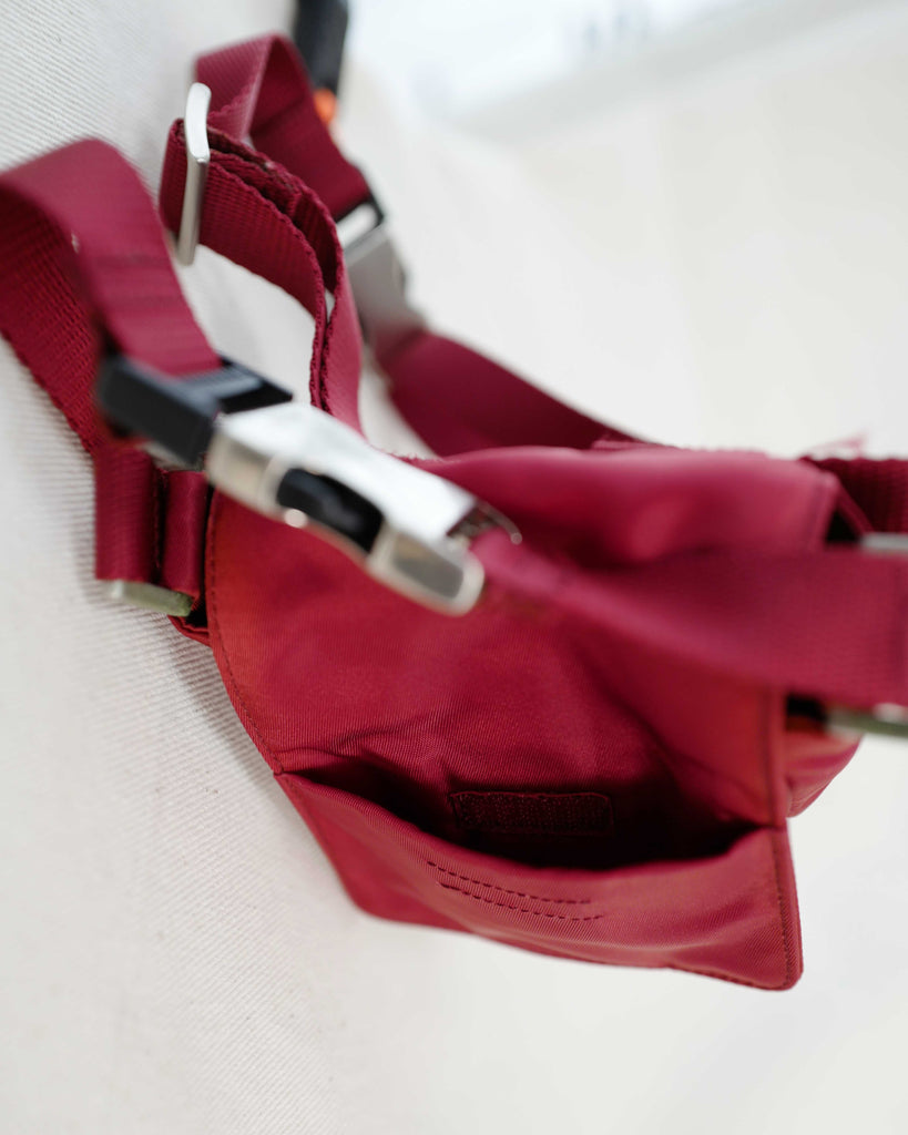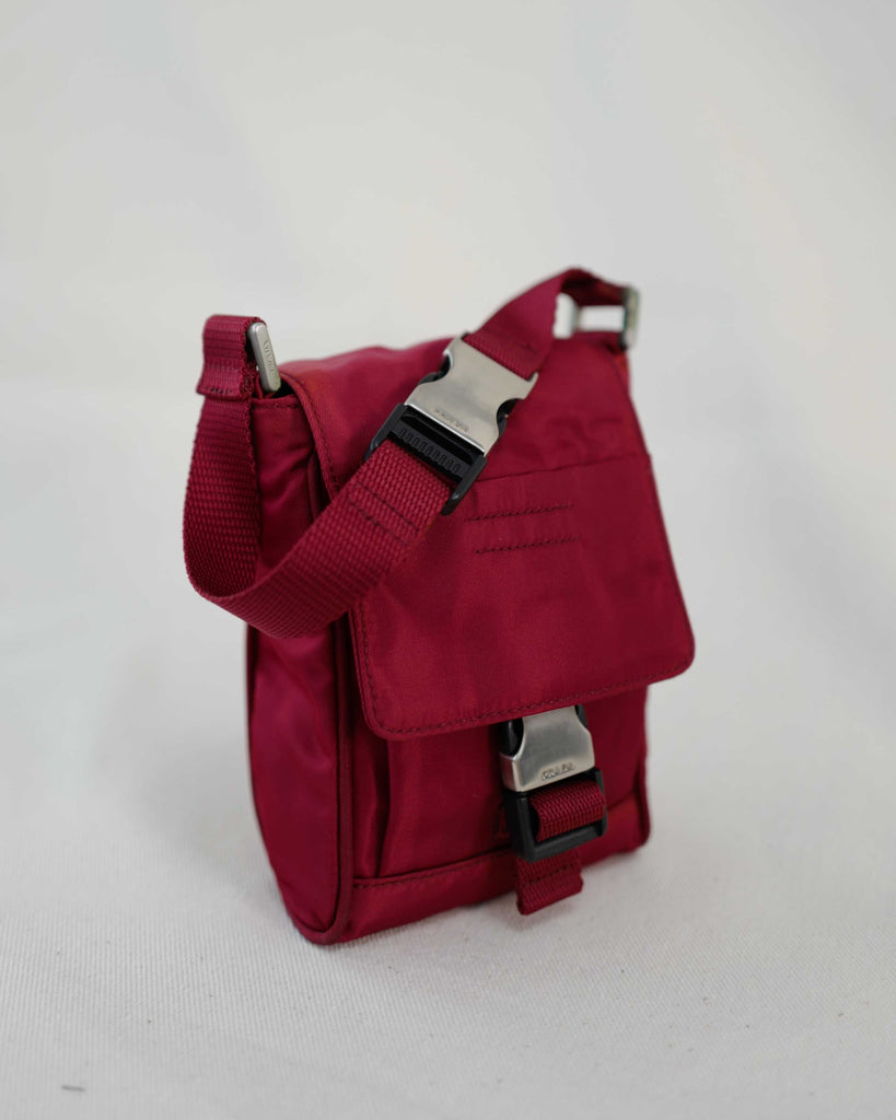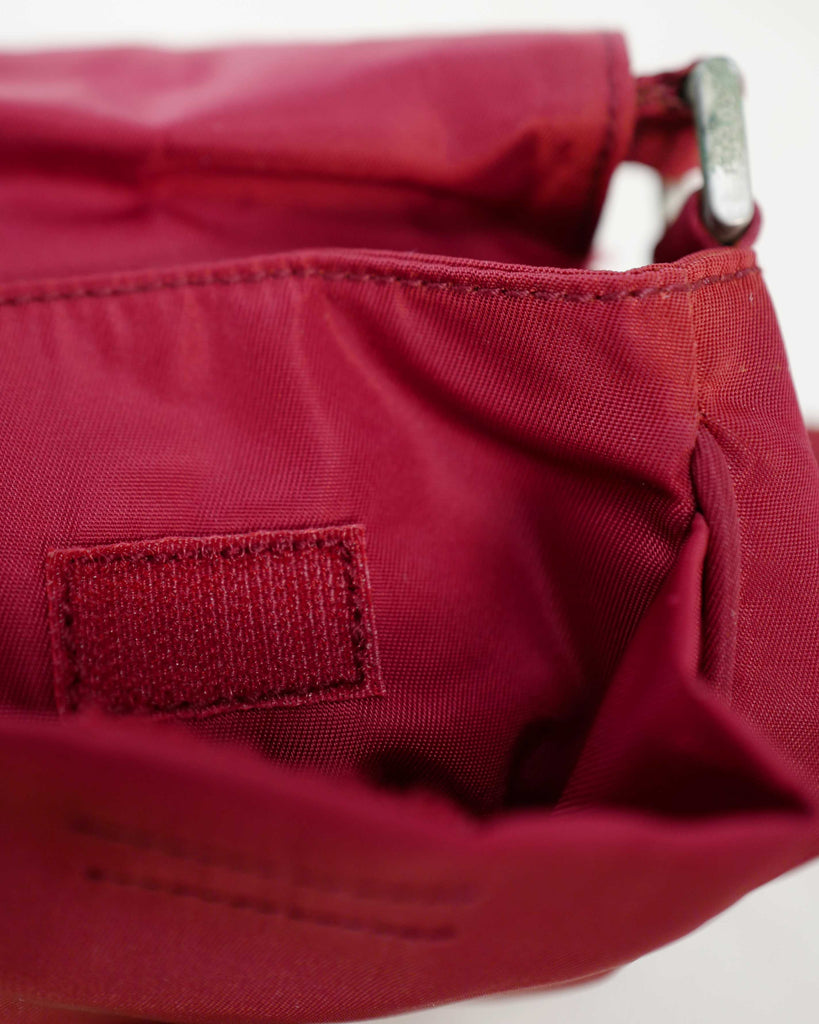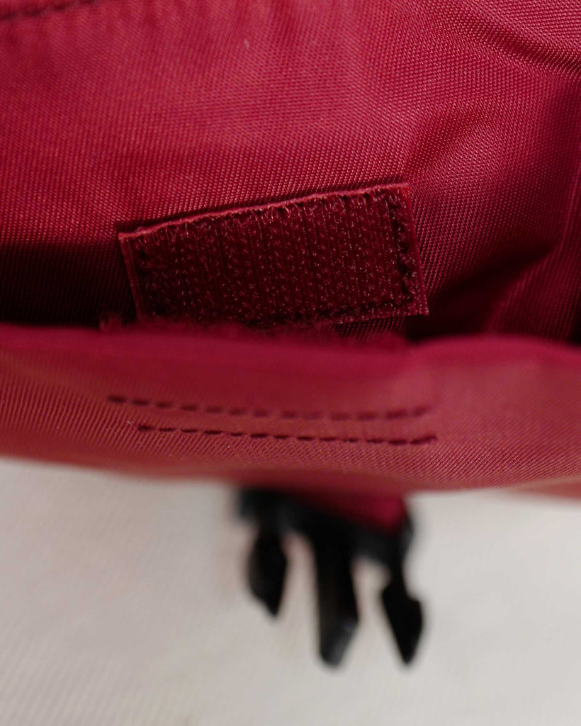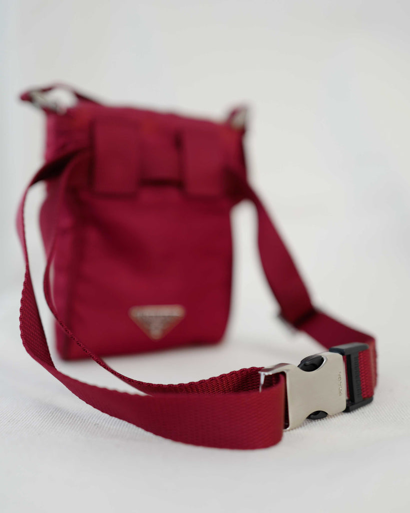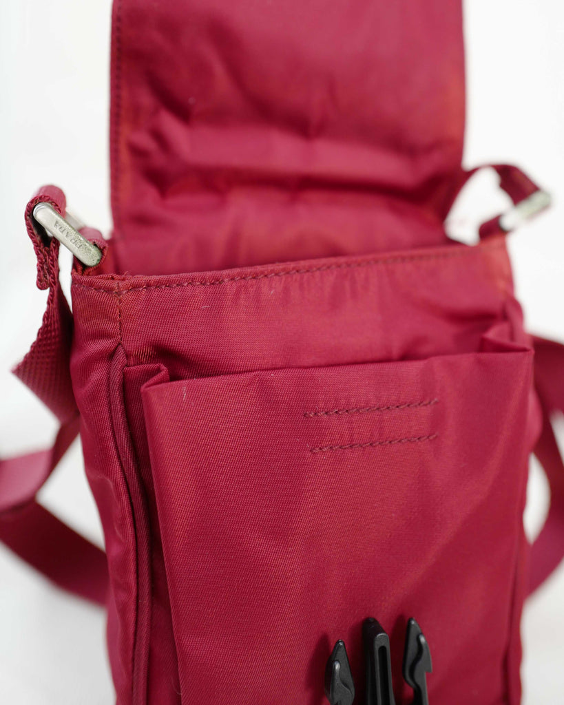 Red smaller crossbody/hip bag with adjustable strap and silver/black details. Flap with velcro enclosure. Prada triangle logo on the back. Prada metall plate on inside. Prada logo on all hardware parts. Can be worn as mini handbag, cross bodybag or hip bag. double pockets.