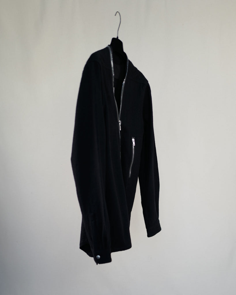 Wool/cotton over-shirt with silver and kaki accent zippers from Rick Owens fall winter 2021. collection. Unlined, french seams.