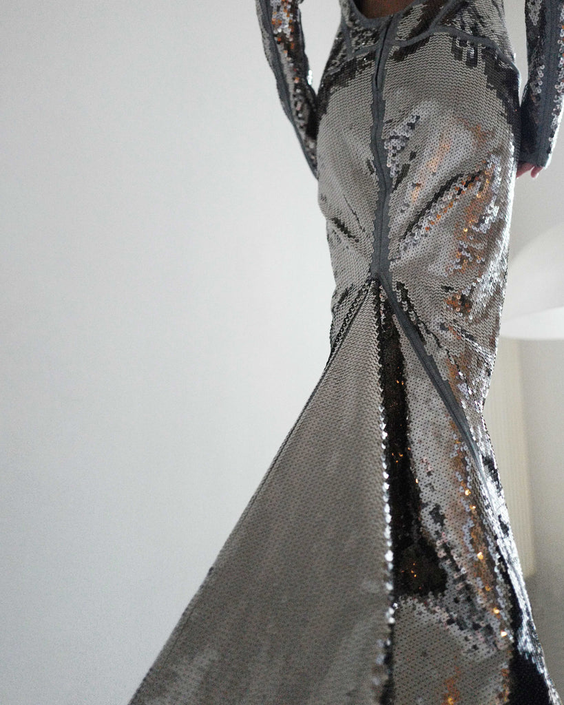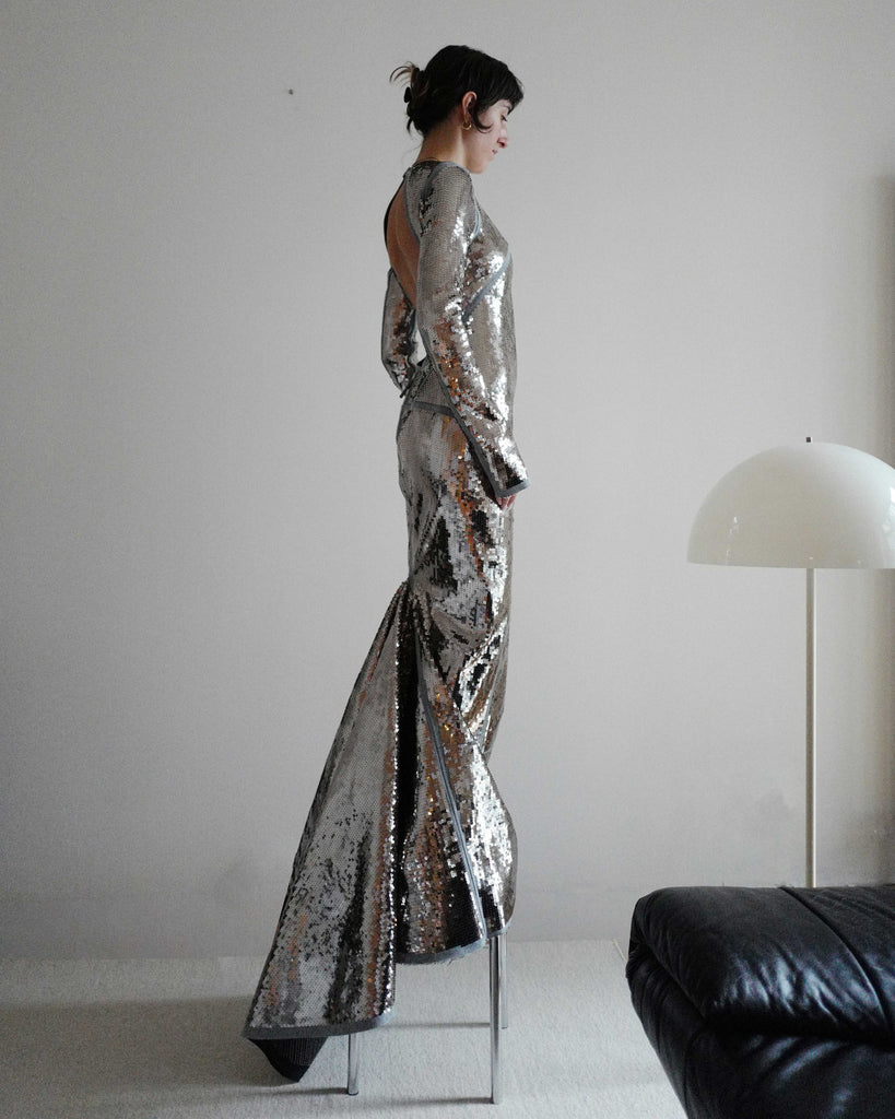 Silver sequin mermaid dress by Rick Owens Fall/winter 2022. Woven non-stretch base in blue with raw edges for a fitted look. Open back with a trail.