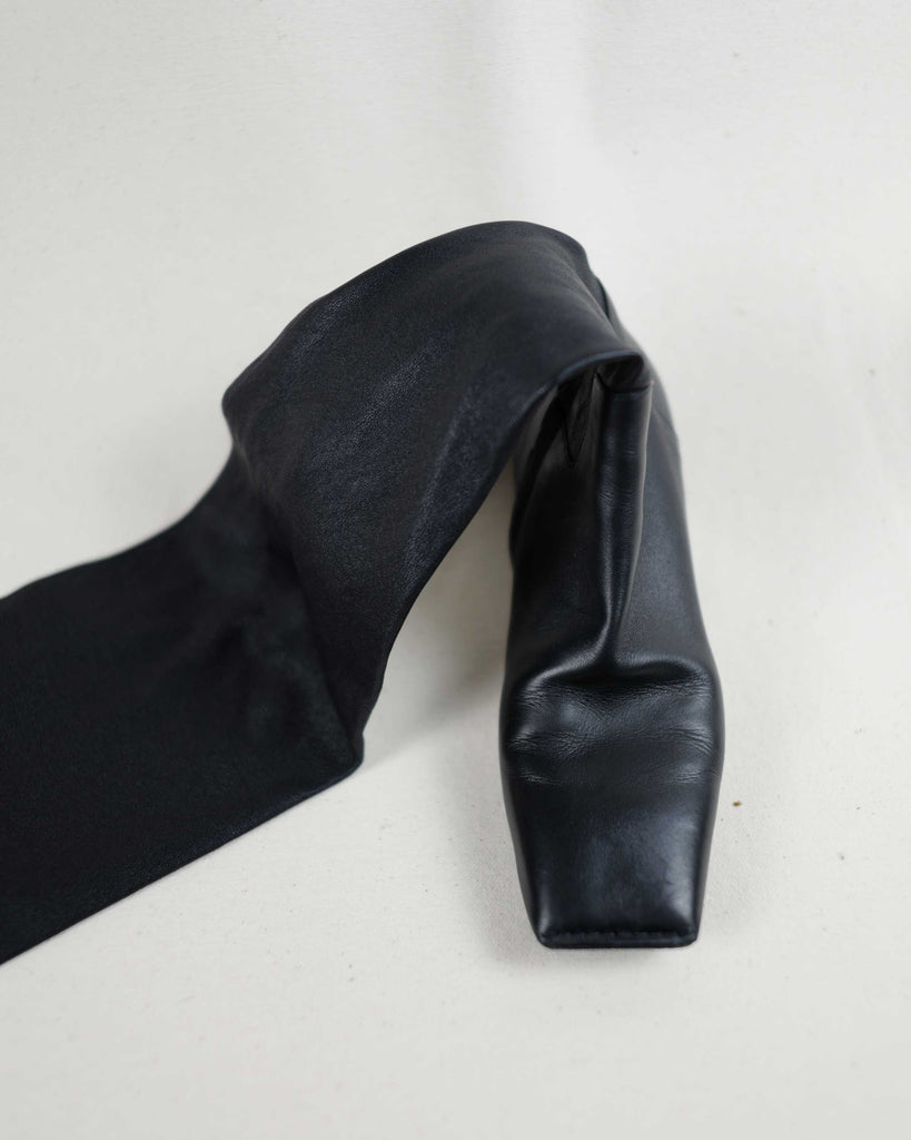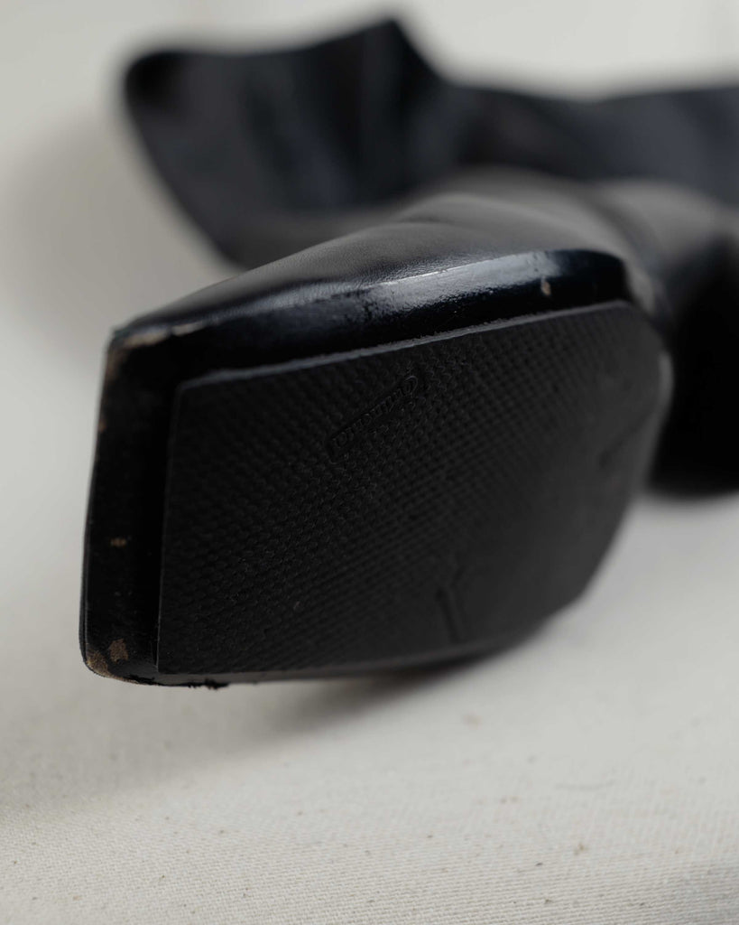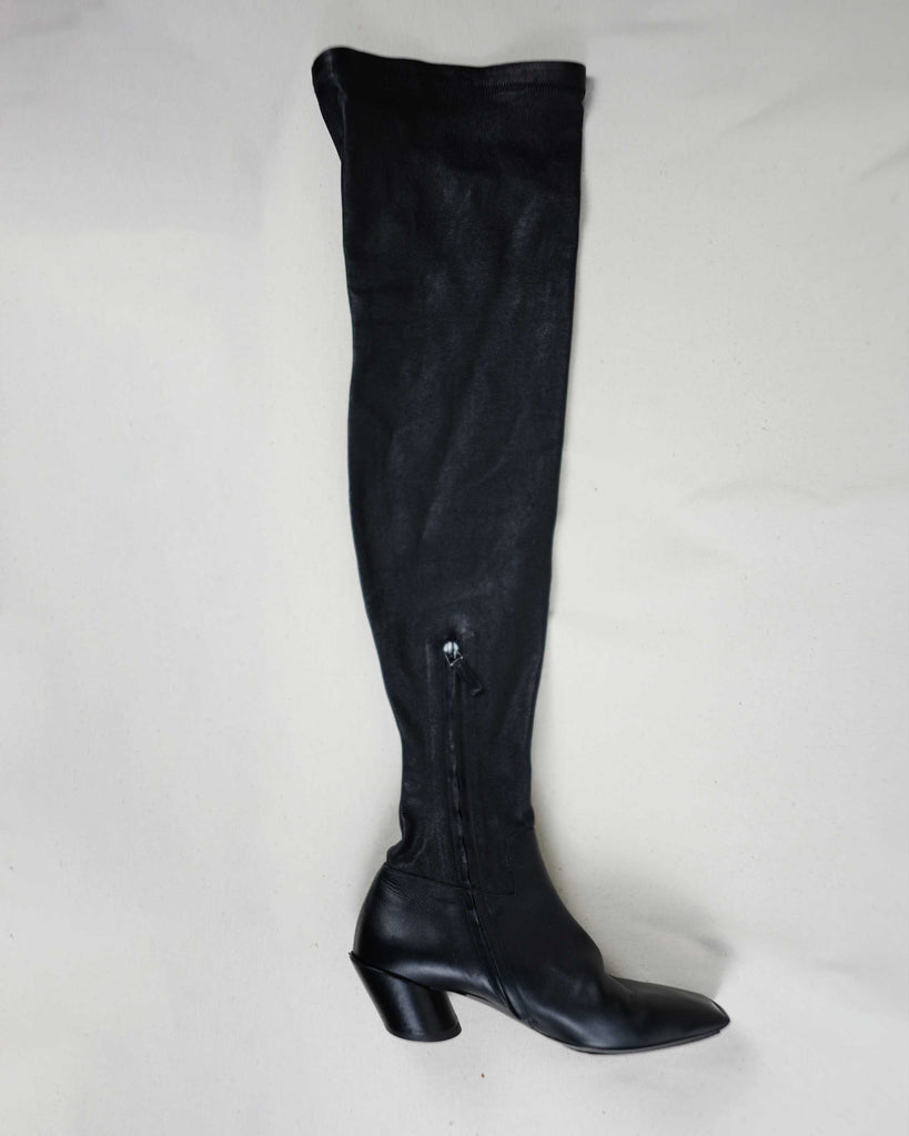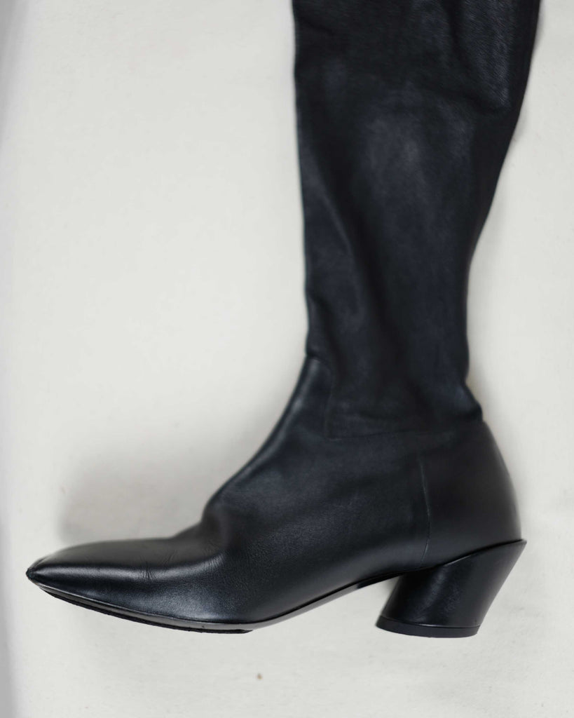 Black over knee Balenciaga boots in leather with iconic squared toe. Lower, angeled heel. Tight fit on shaft.