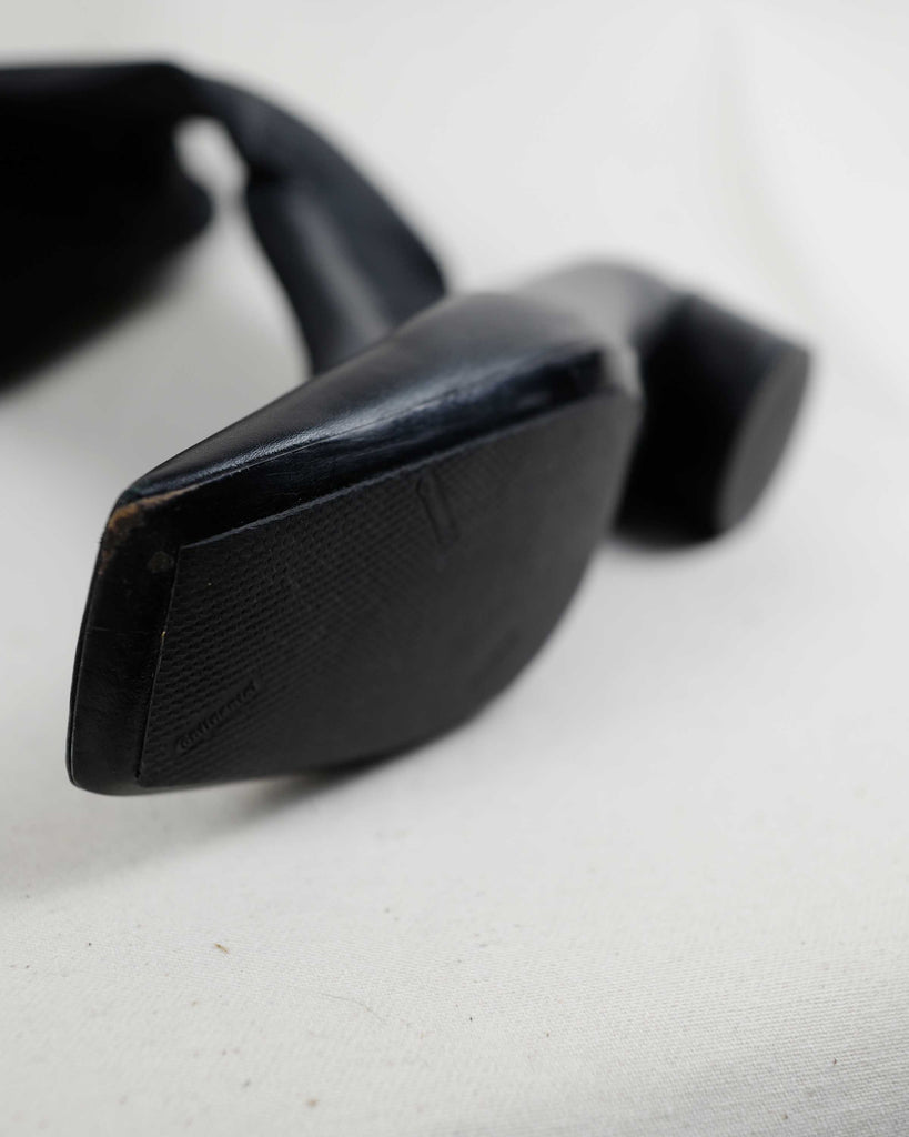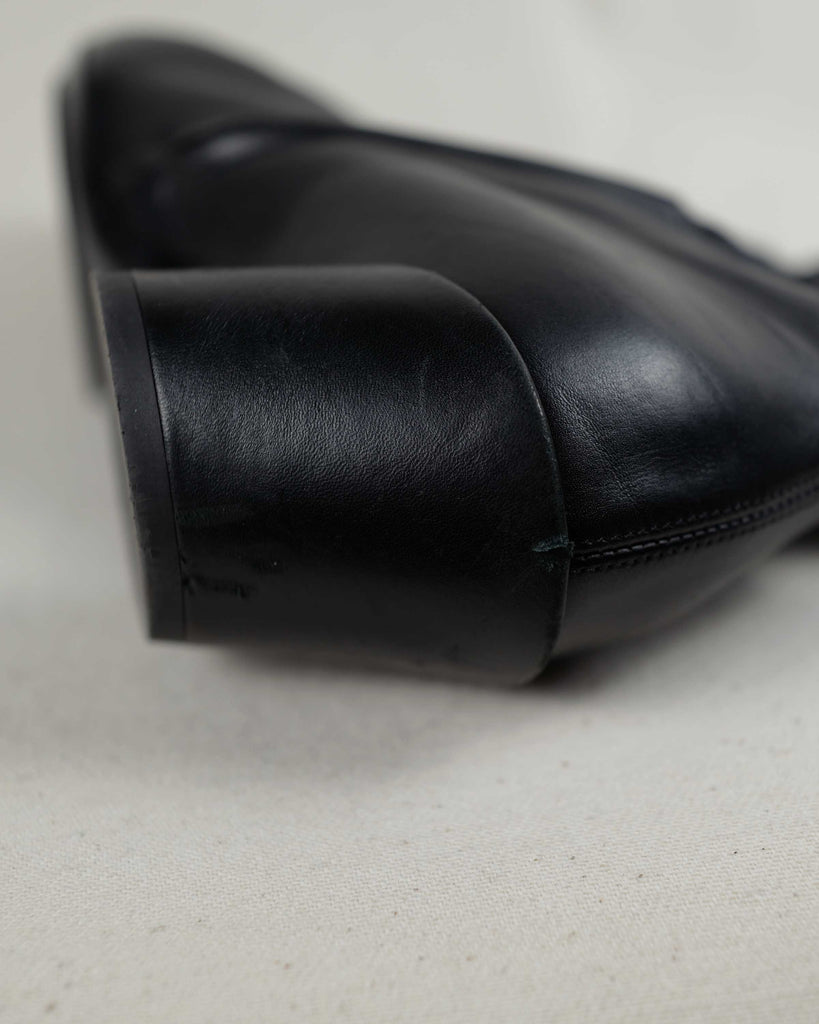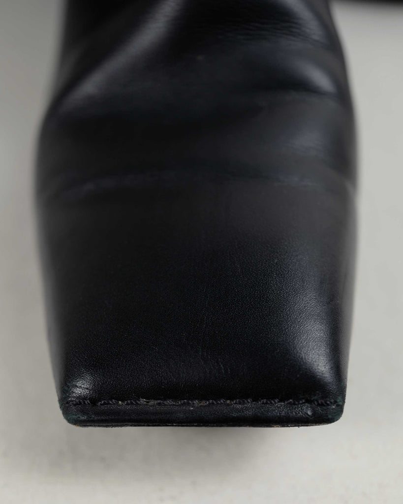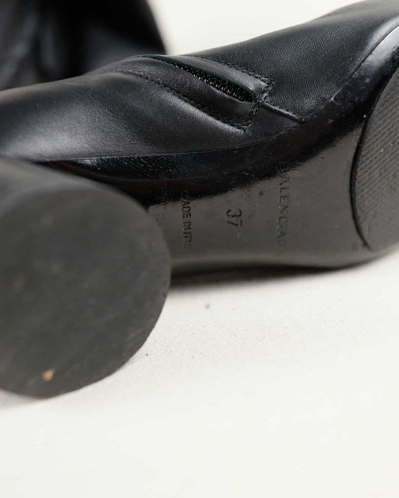 Black over knee Balenciaga boots in leather with iconic squared toe. Lower, angeled heel. Tight fit on shaft.