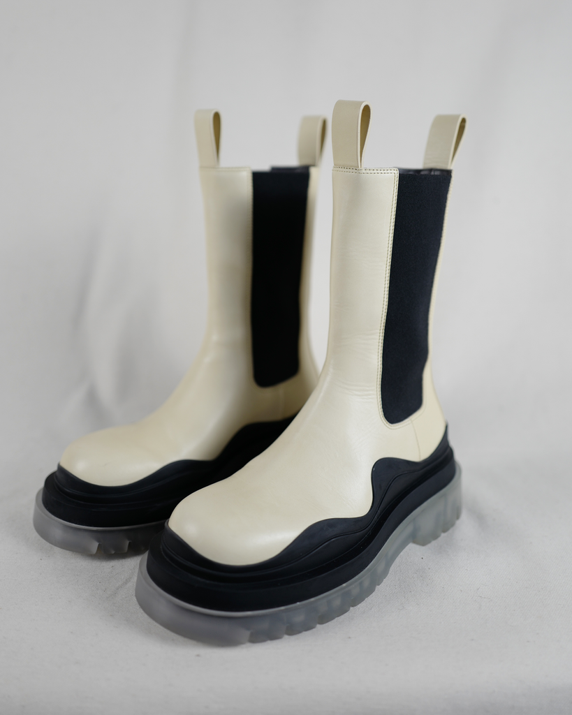 Bottega Veneta Tire Chelsea boots with high shoe shaft in colour sesalt/black/transparent. Still available at Bottega Veneta for retail price 1 200€