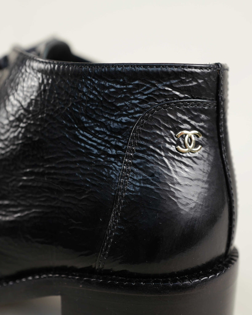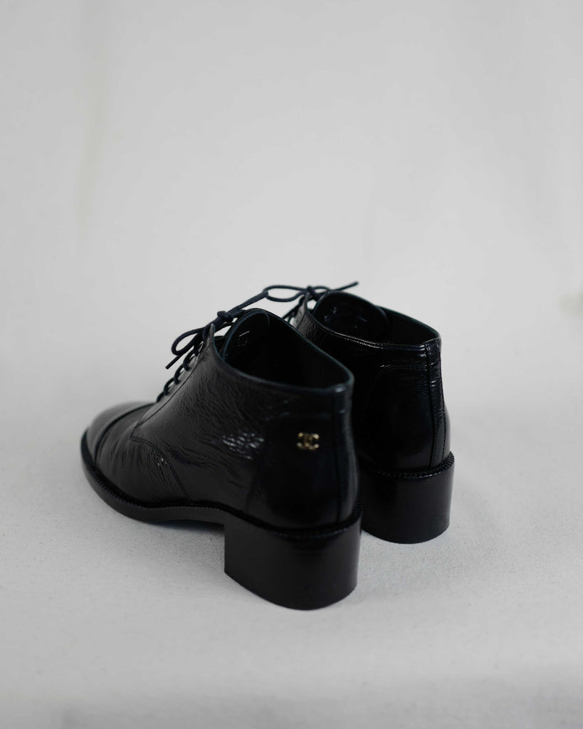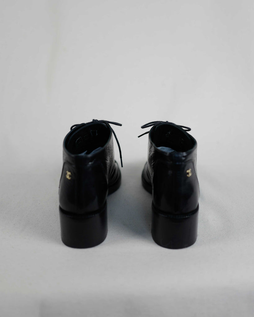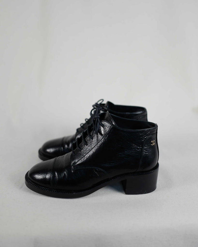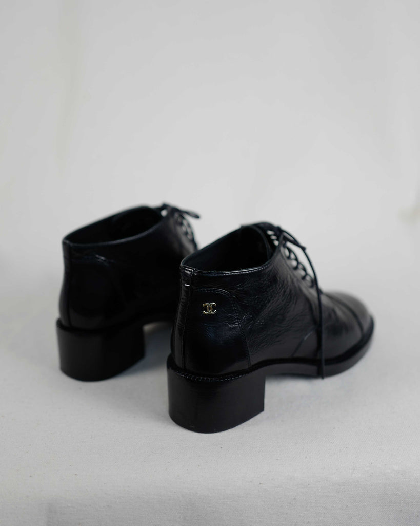 Ankle high lack leather Chanel shoes in black. Silver CC logo on heel. Thin laces, lower modest height.