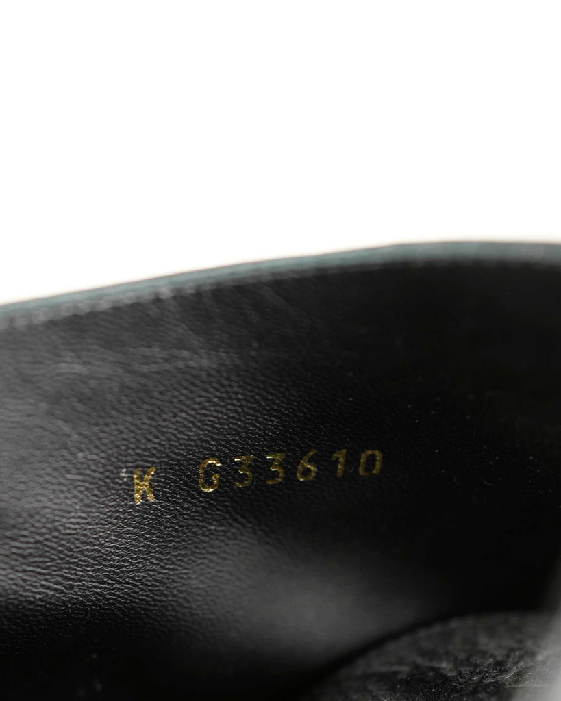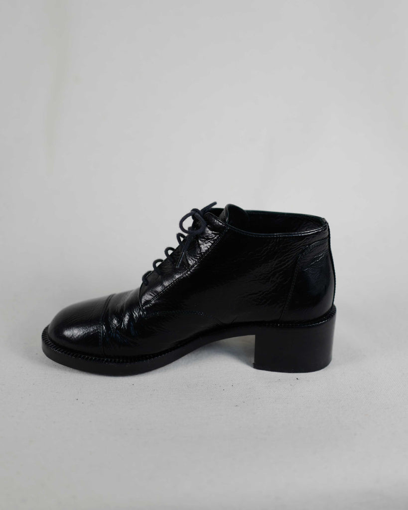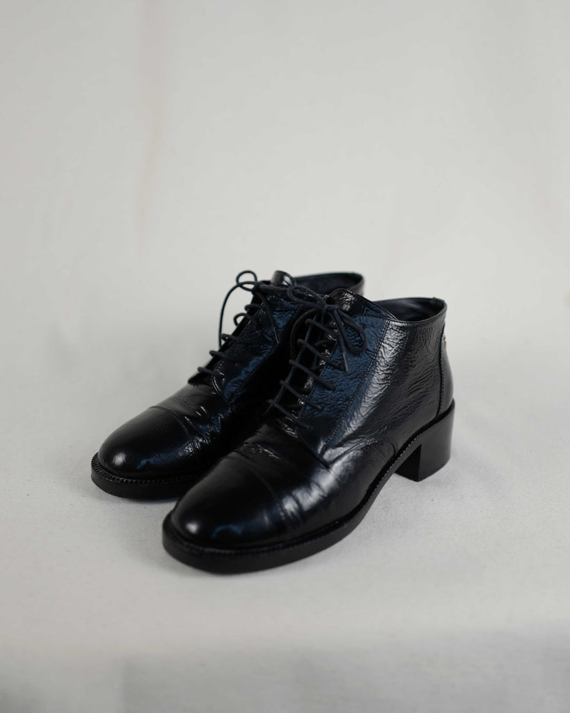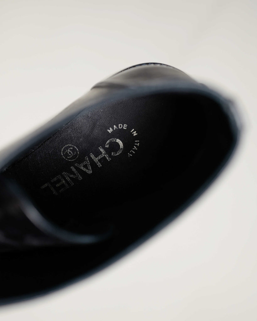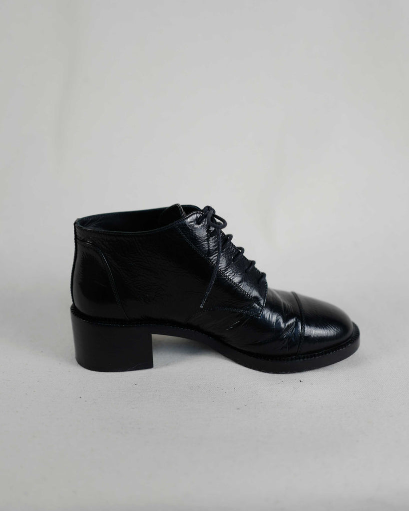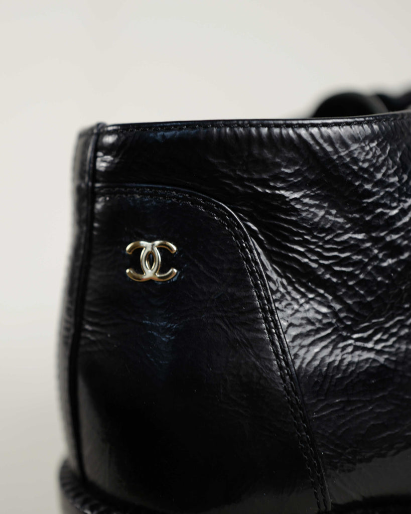 Ankle high lack leather Chanel shoes in black. Silver CC logo on heel. Thin laces, lower modest height.