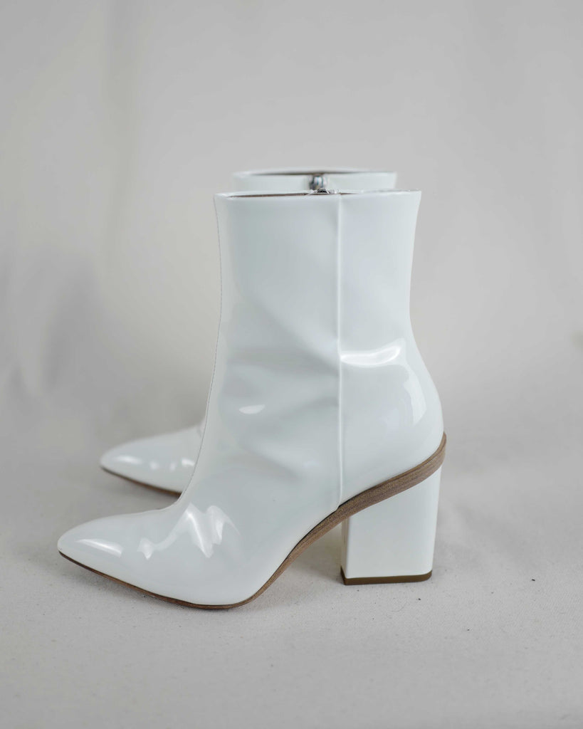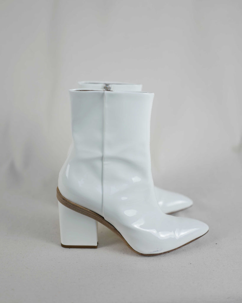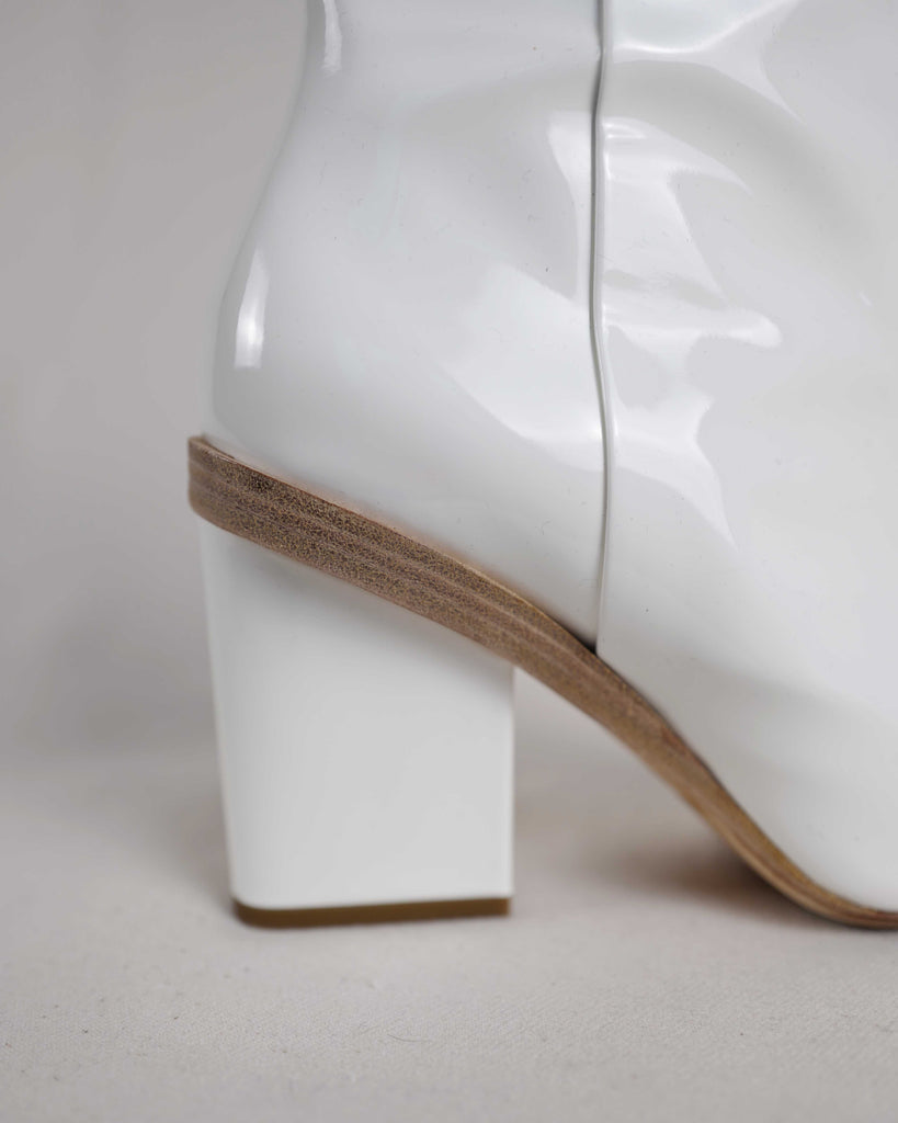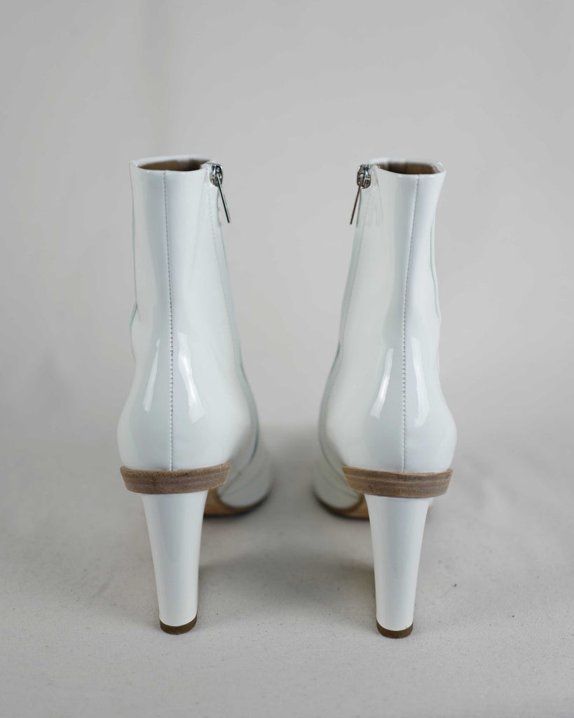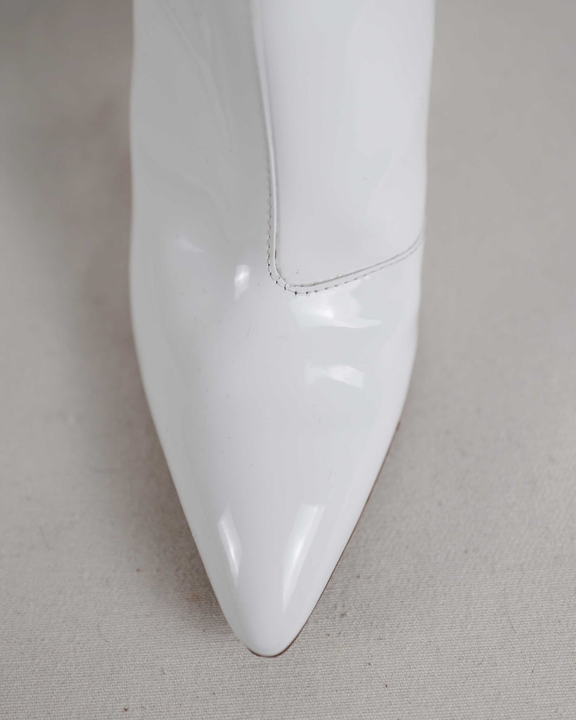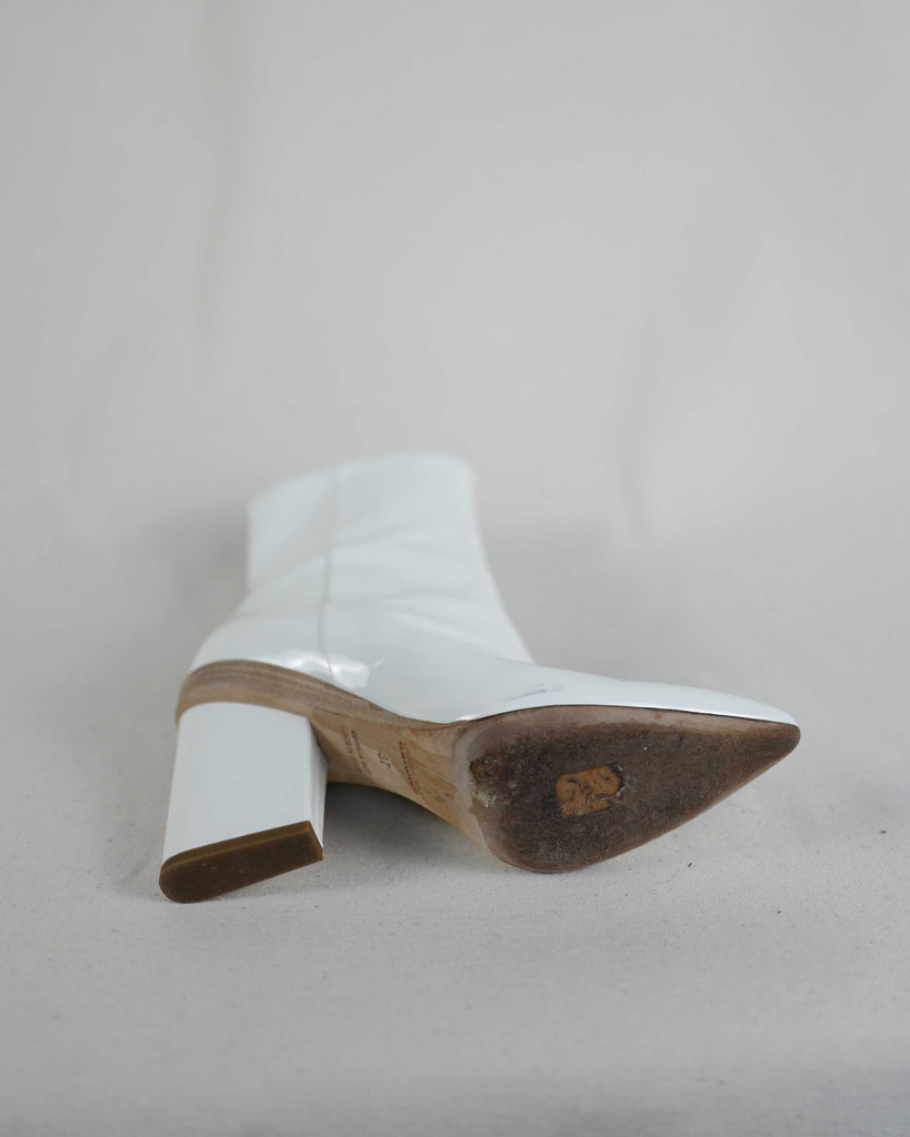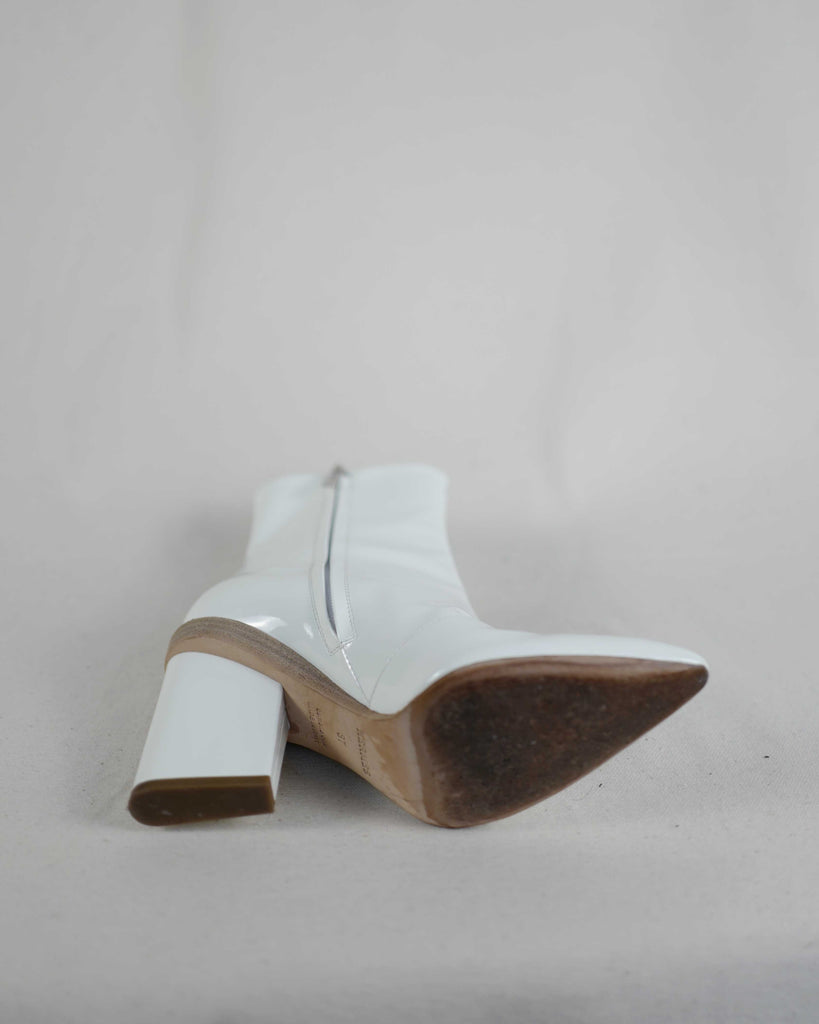 White patent leather boots with pointy toe from Hermès. Purchased in Hermès flagship store in Paris. Modest, comfortable heel. Contrasting beige sued sole. Silver Zipper on inside. Minimalistic seem detail on toe.