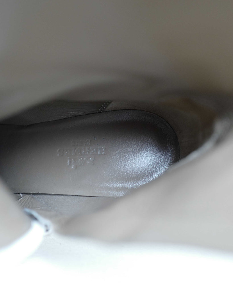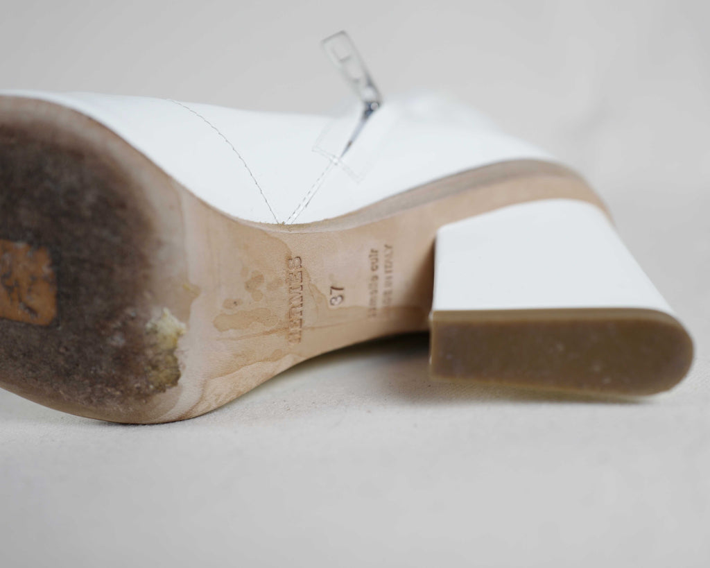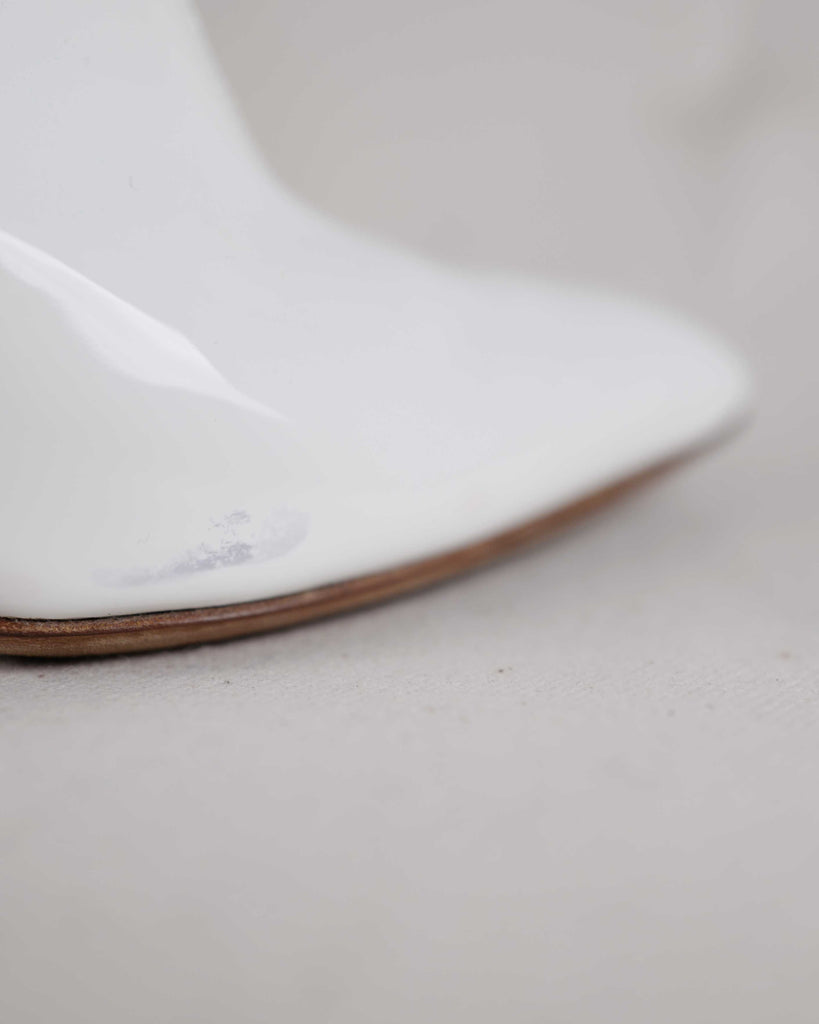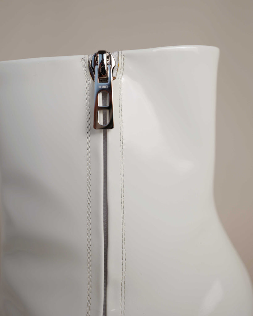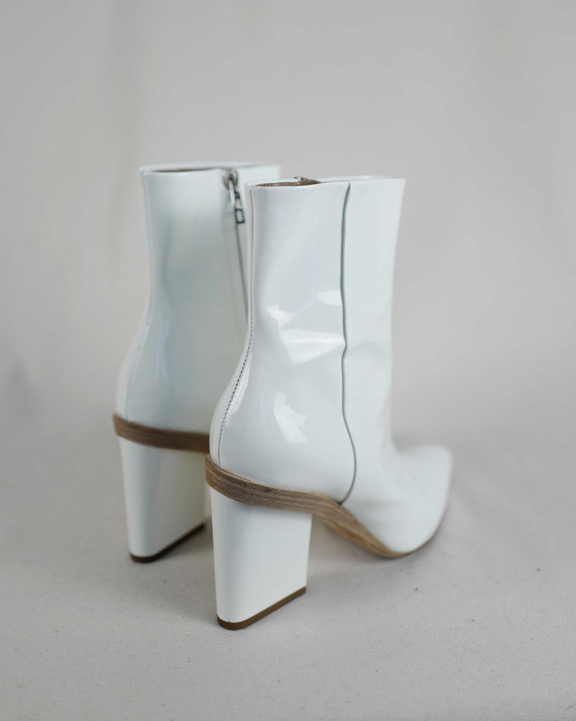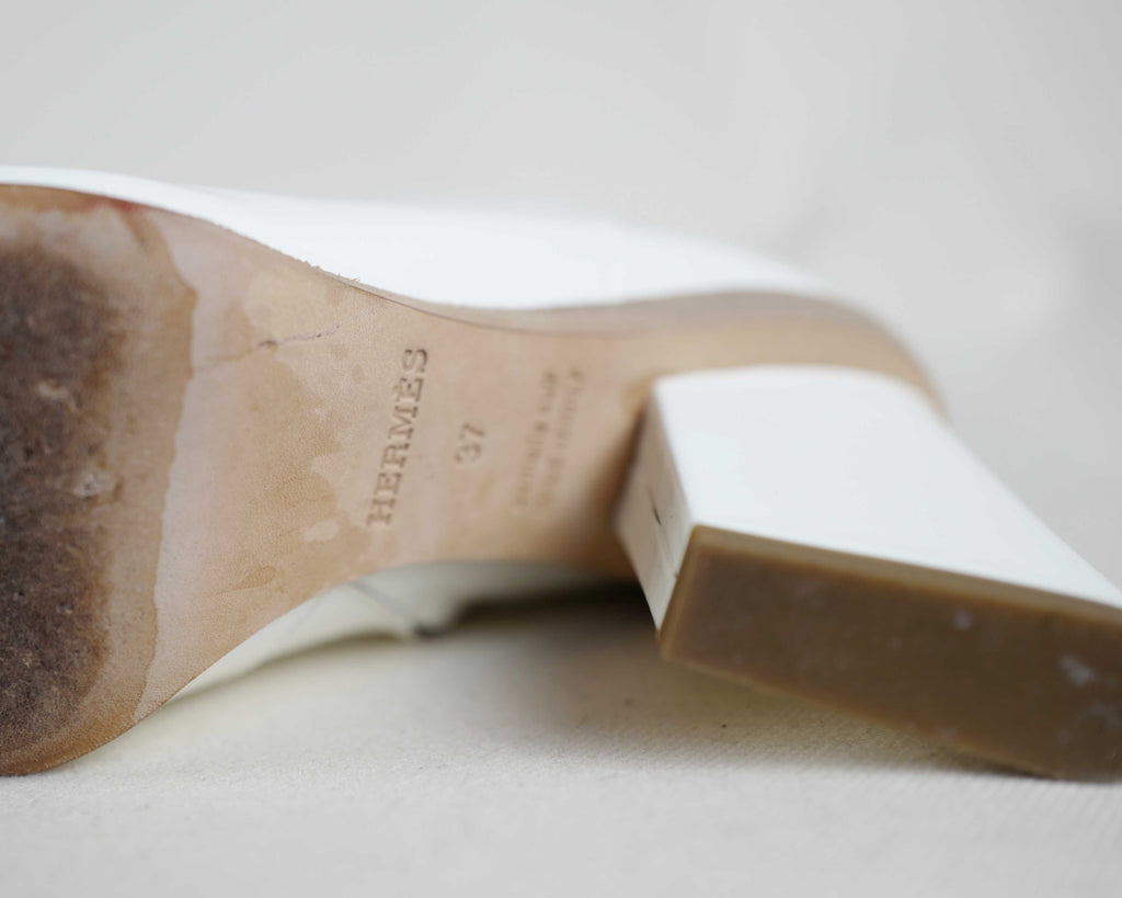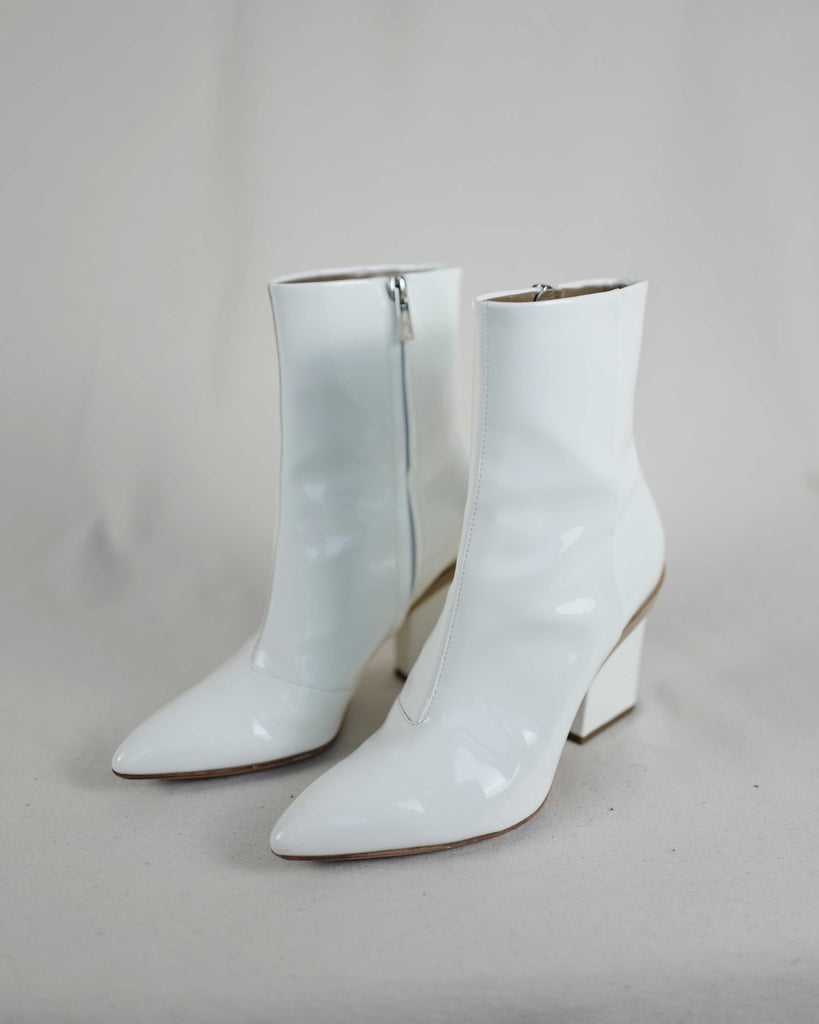 White patent leather boots with pointy toe from Hermès. Purchased in Hermès flagship store in Paris. Modest, comfortable heel. Contrasting beige sued sole. Silver Zipper on inside. Minimalistic seem detail on toe.