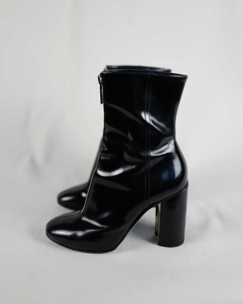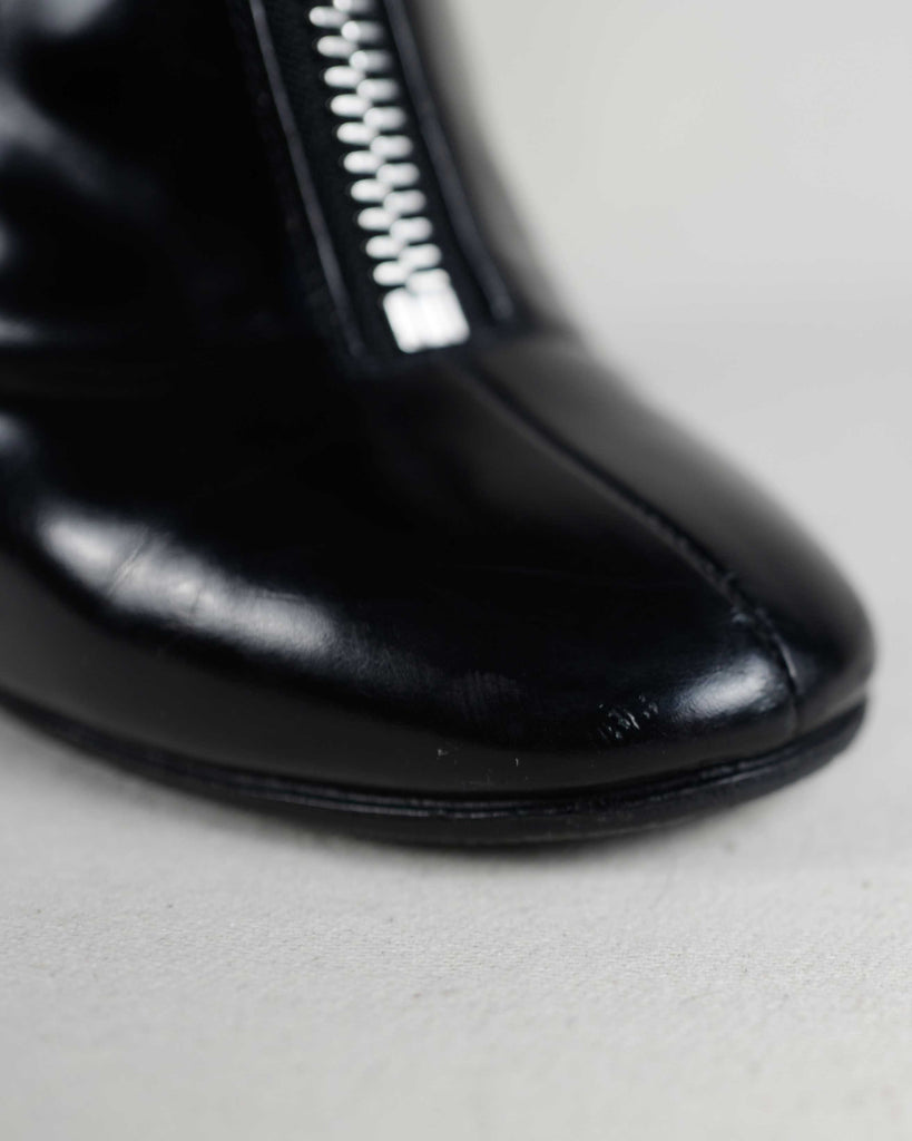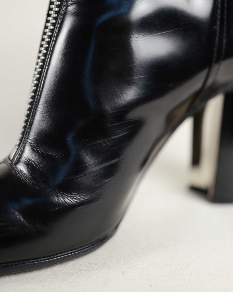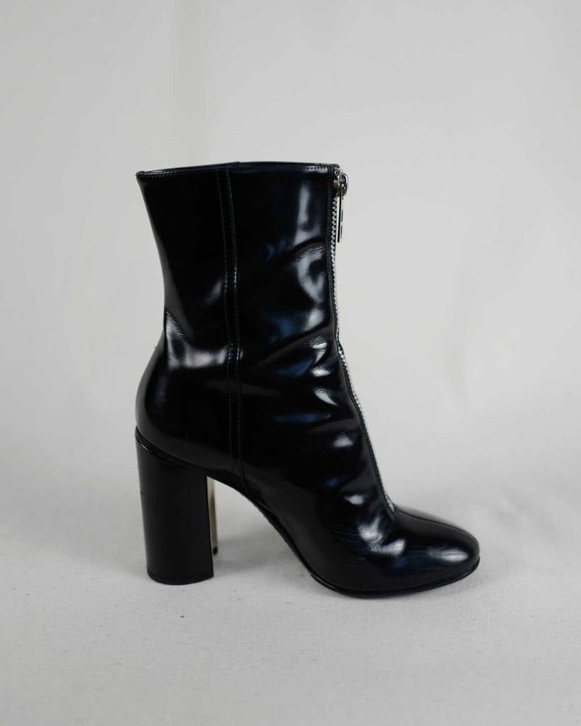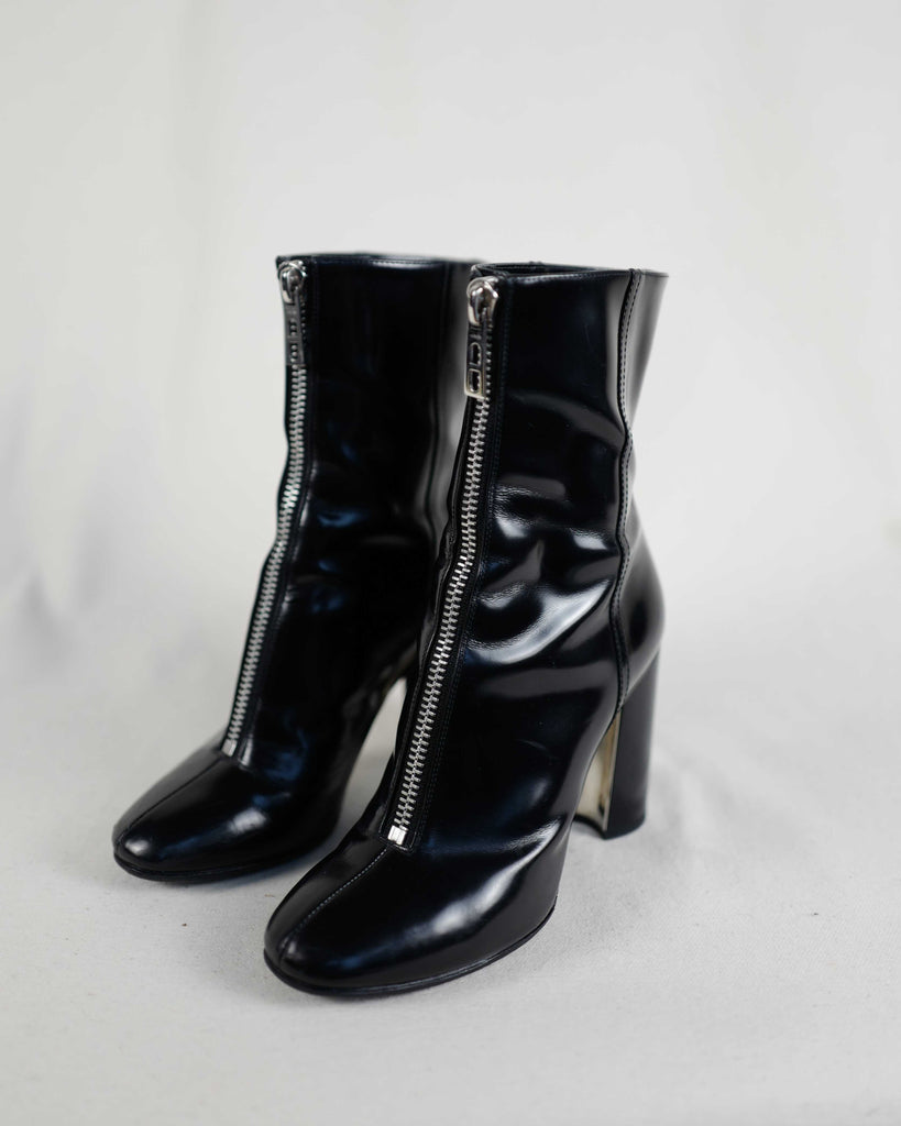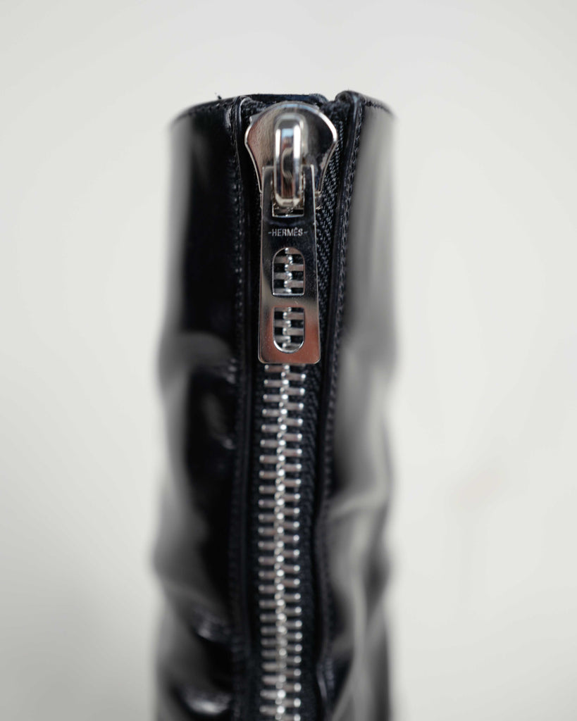 Patent glossy leather mid calf heels from Hermès. Silver zipper on full front with Hermès logo. Silver metal mirror detail on inside of the heels.