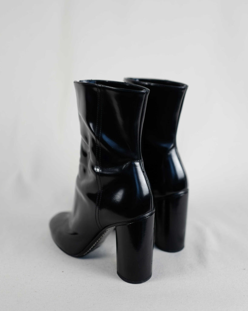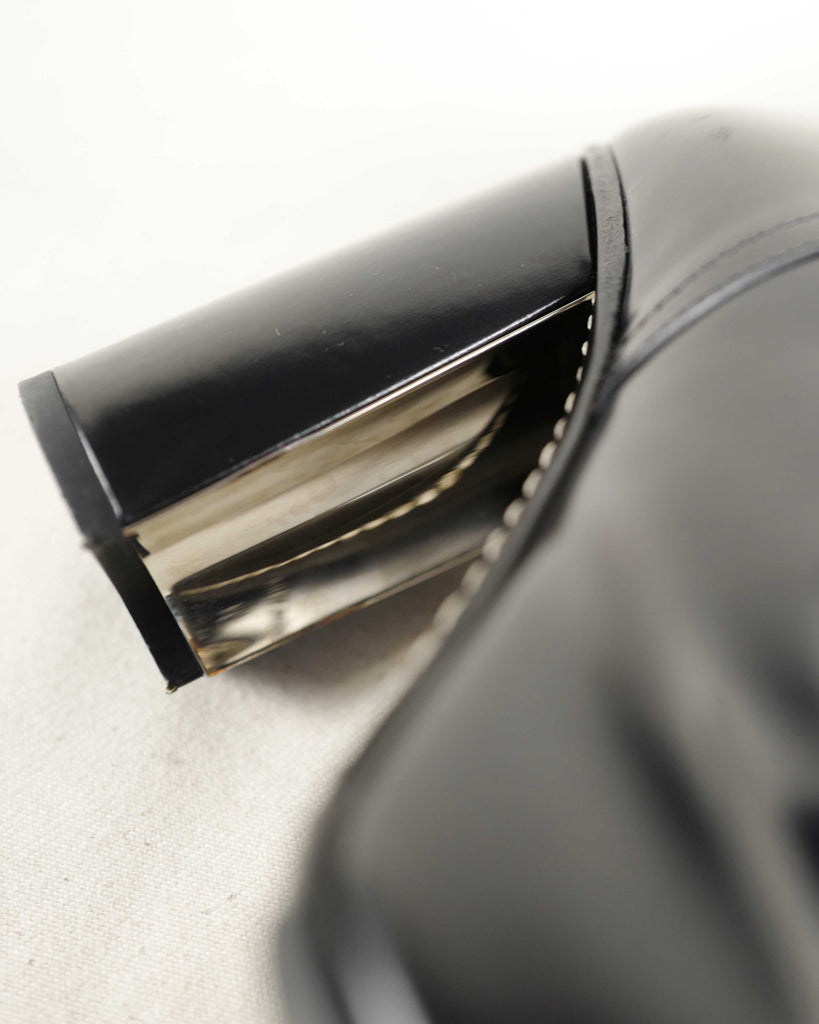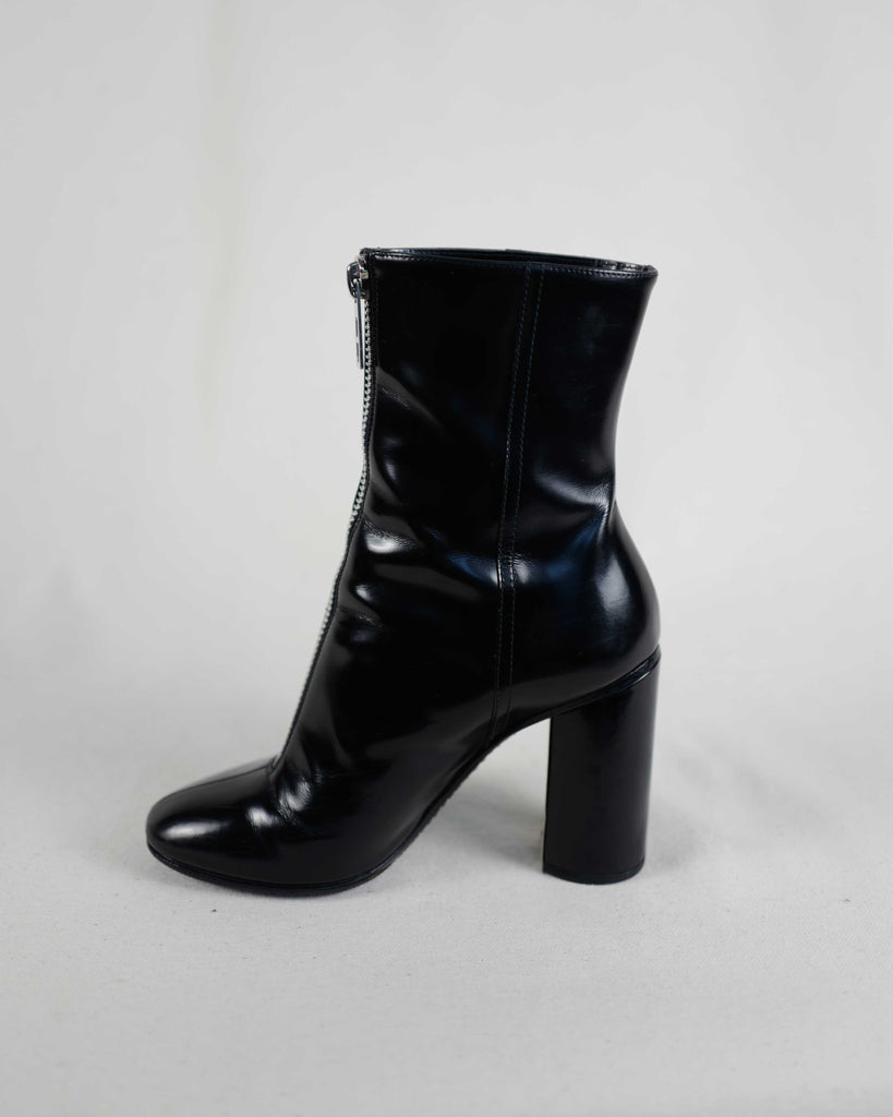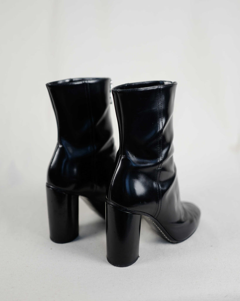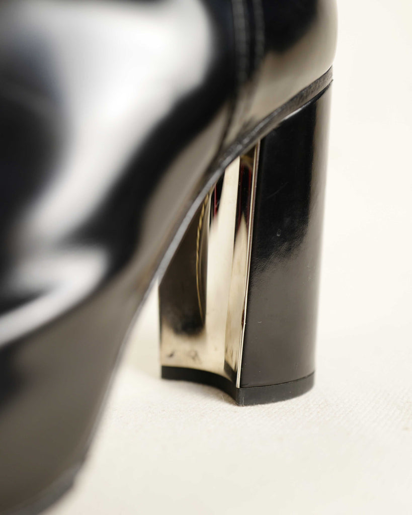 Patent glossy leather mid calf heels from Hermès. Silver zipper on full front with Hermès logo. Silver metal mirror detail on inside of the heels.