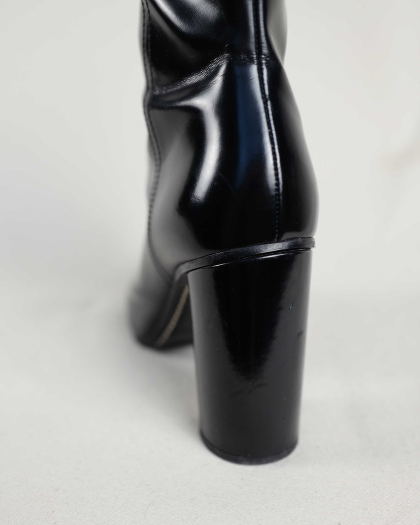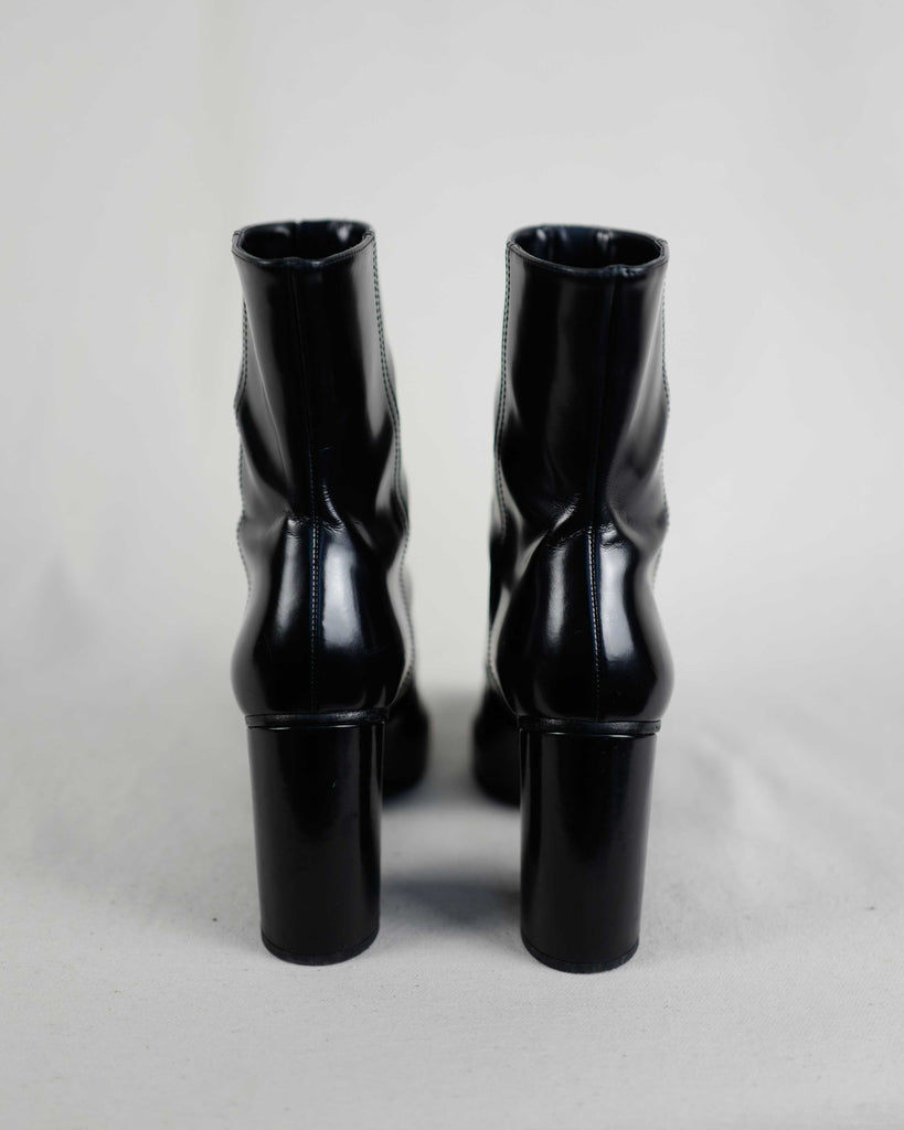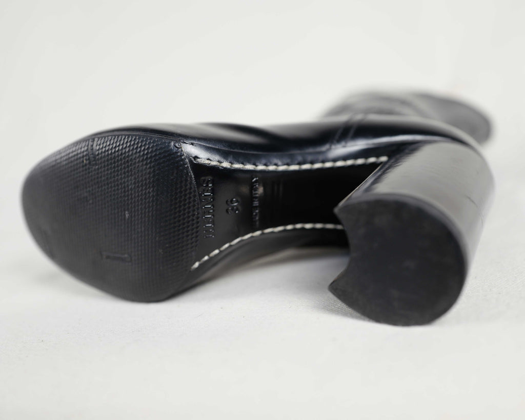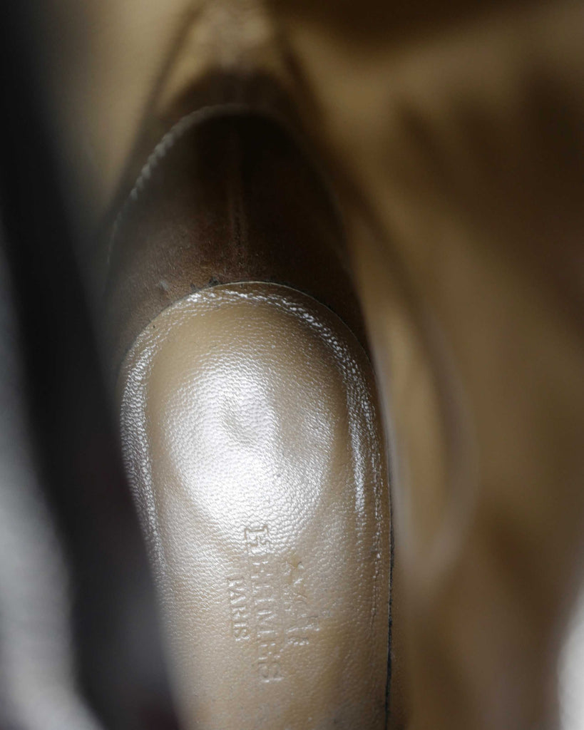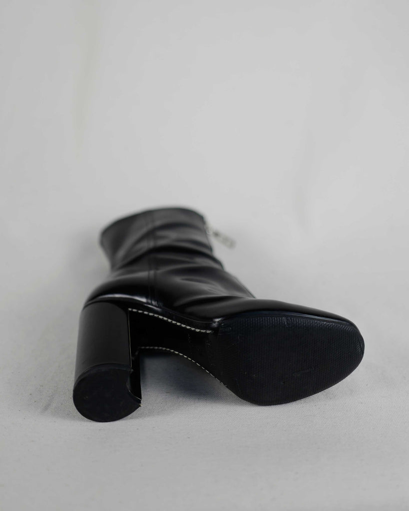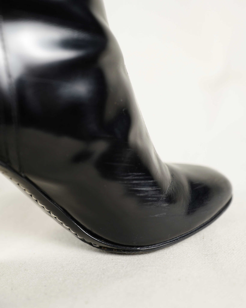 Patent glossy leather mid calf heels from Hermès. Silver zipper on full front with Hermès logo. Silver metal mirror detail on inside of the heels.