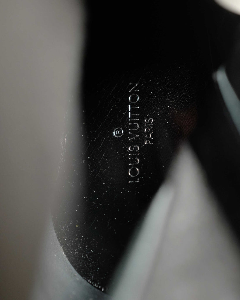 Thigh high, over knee Louis Vuitton gloss leather boots with iconic four edged heel like the monogram. Figure fitted shaft. Black zipper on inside over ankle and up to ca knee.