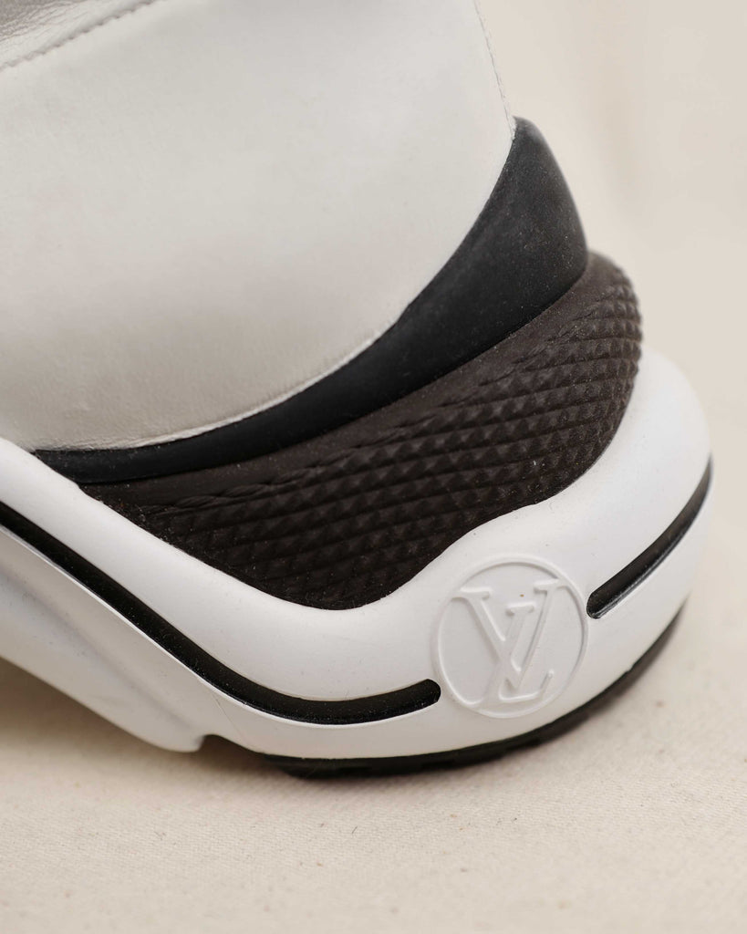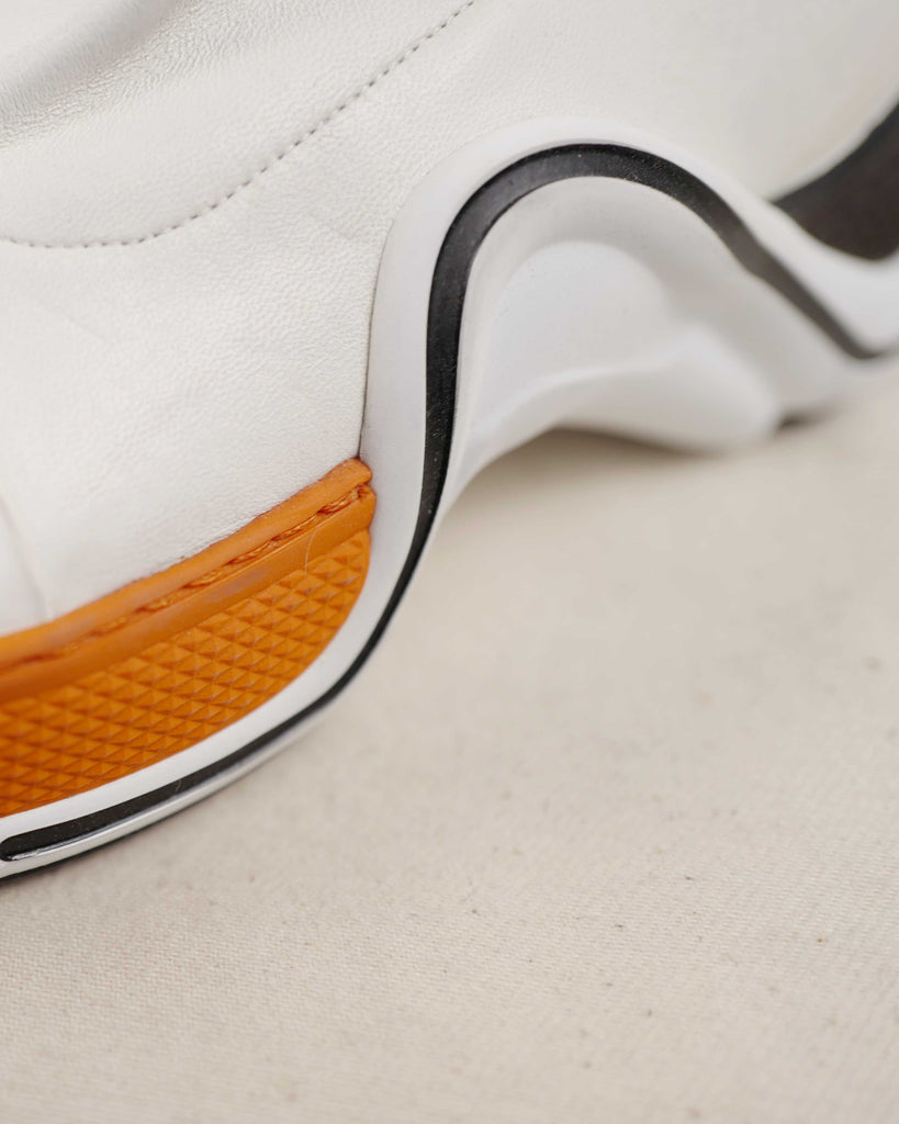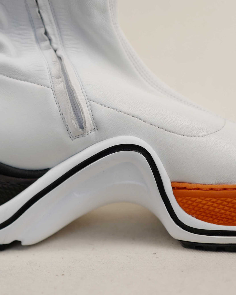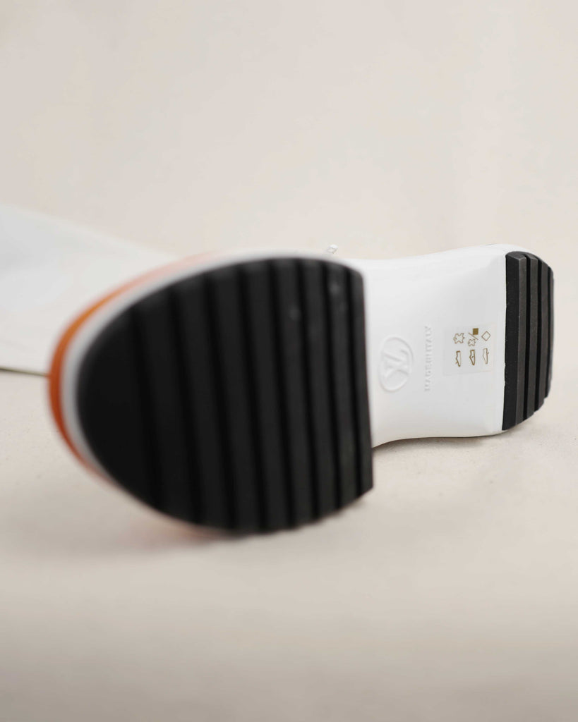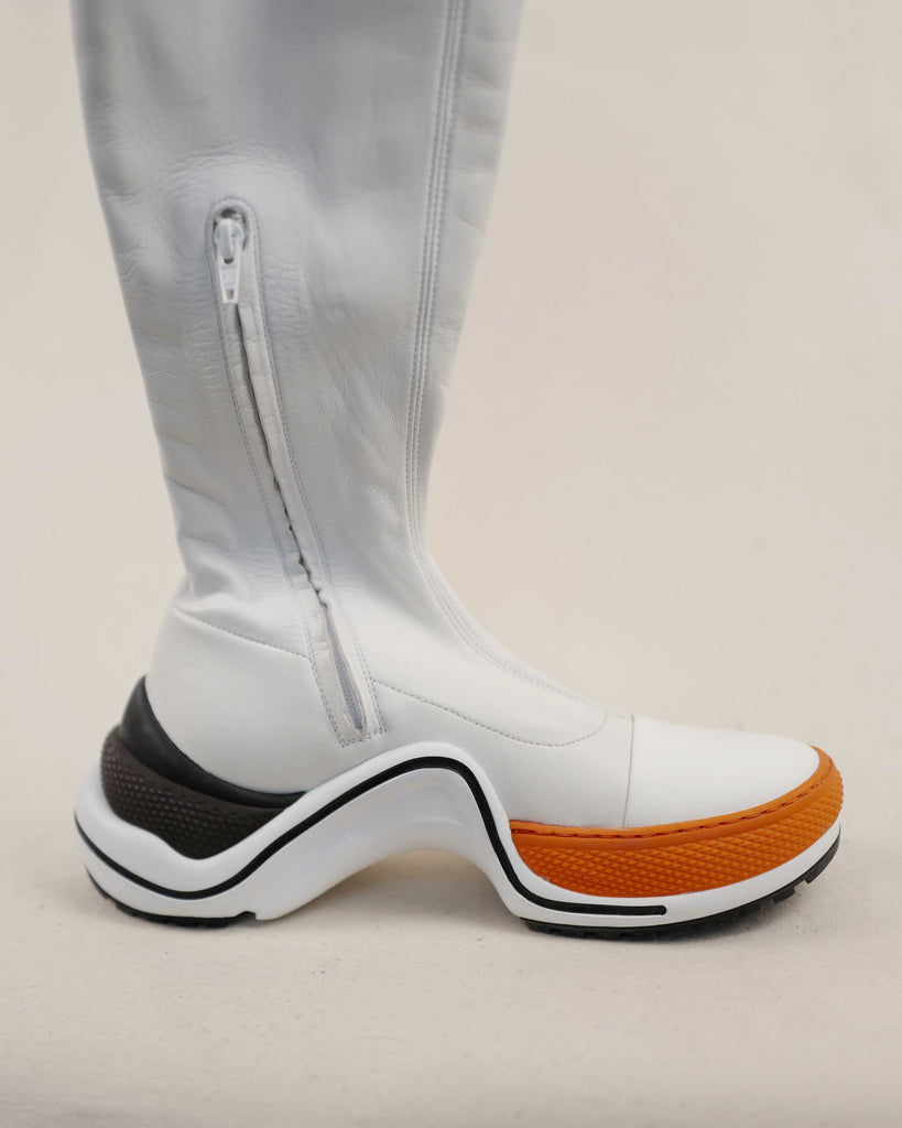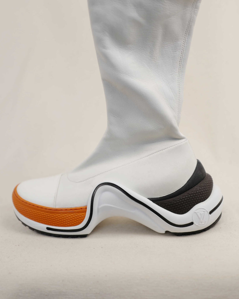 White lamb leather thigh high futuristic Louis Vuitton shoes with modes platform for extra length. Sole in contrasting black and orange with embossed LV logo in the iconic LV. shoe shape. White zipper on the inside. Fitted shape.