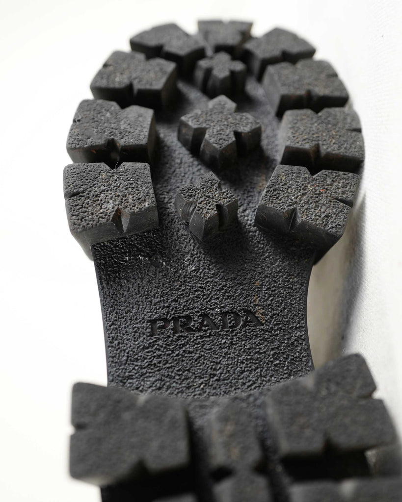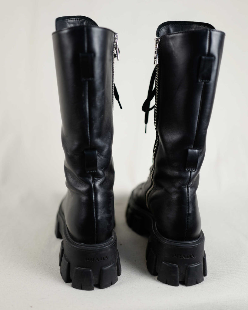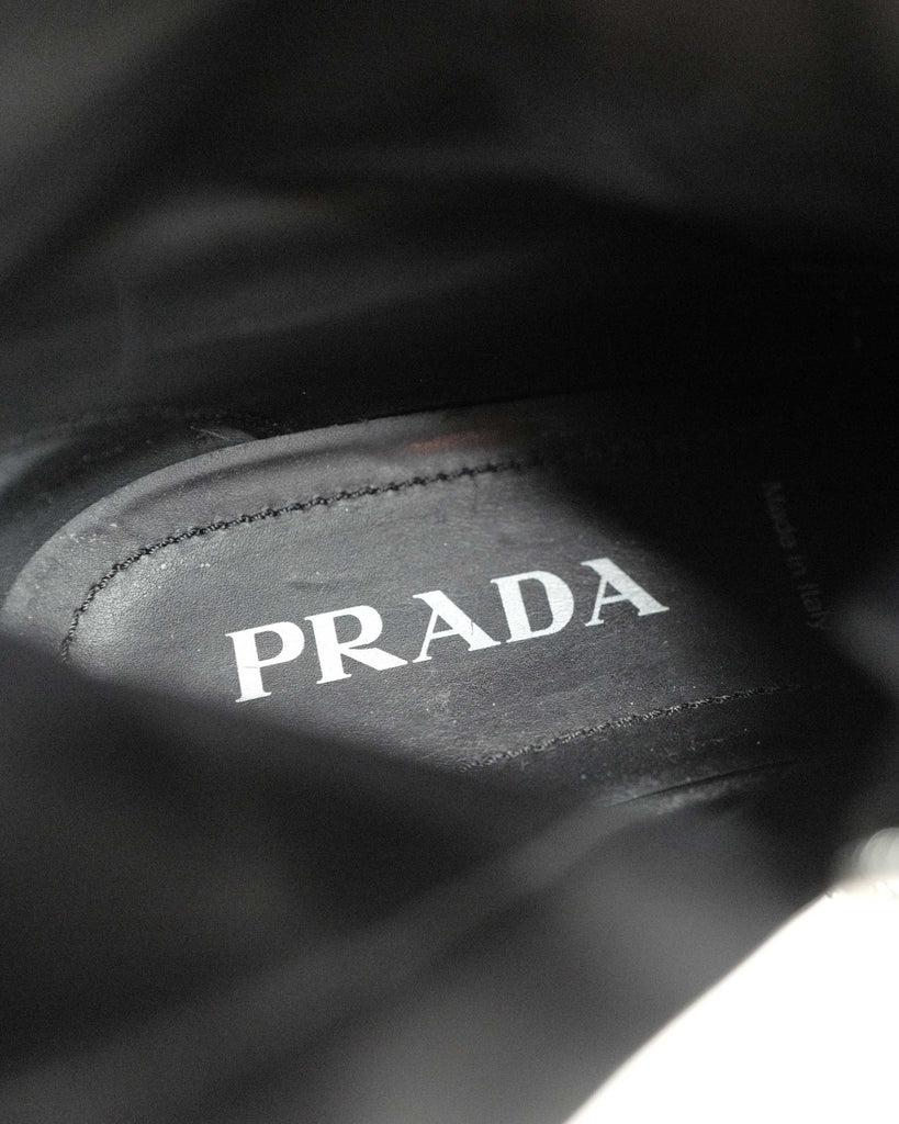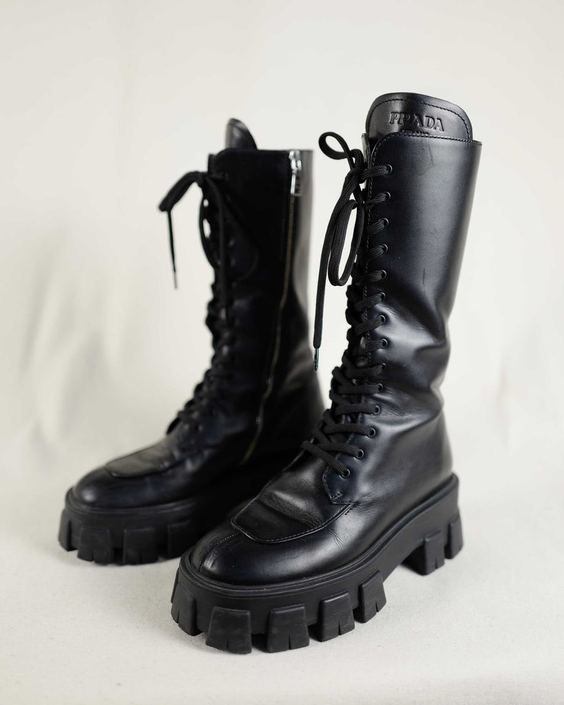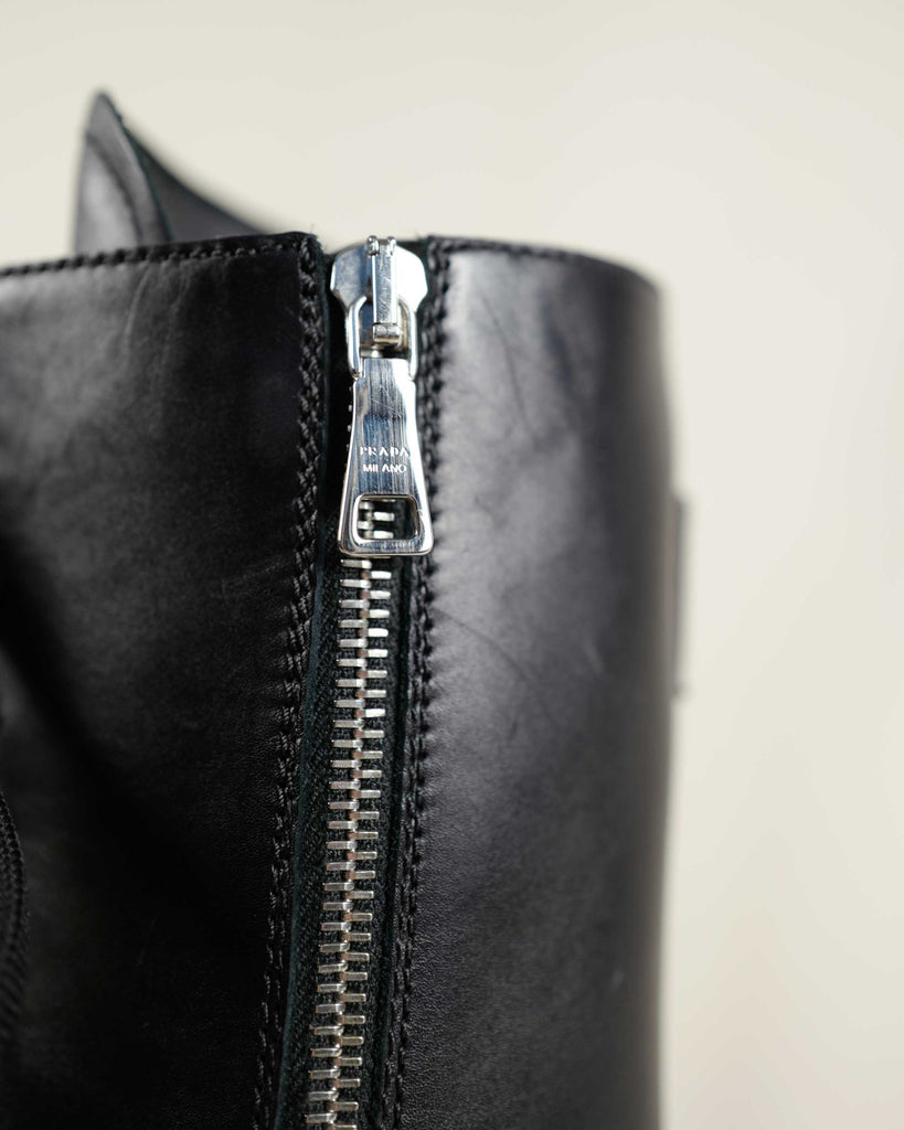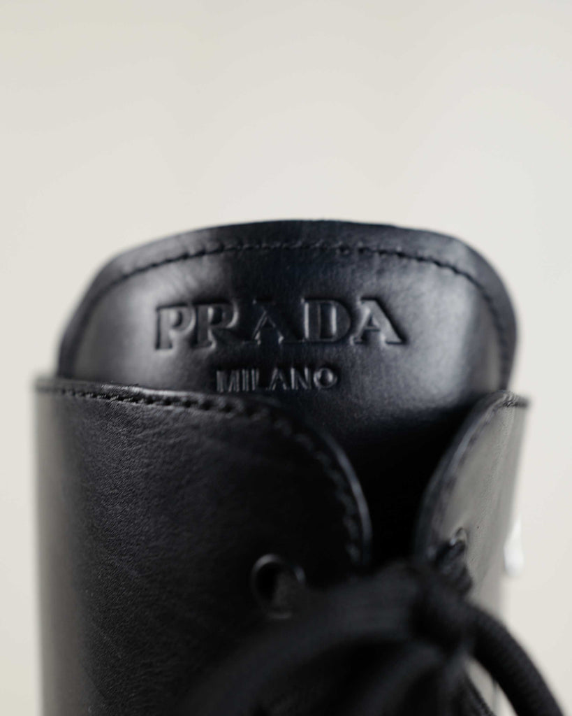 Prada's modern classic combat boots in brushed leather. closes with zipper on the side, as well as full laces. Embossed Prada logo on tongue, silver zipper and on rubber sole.