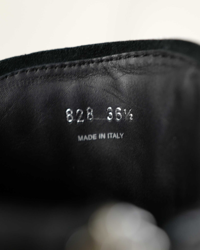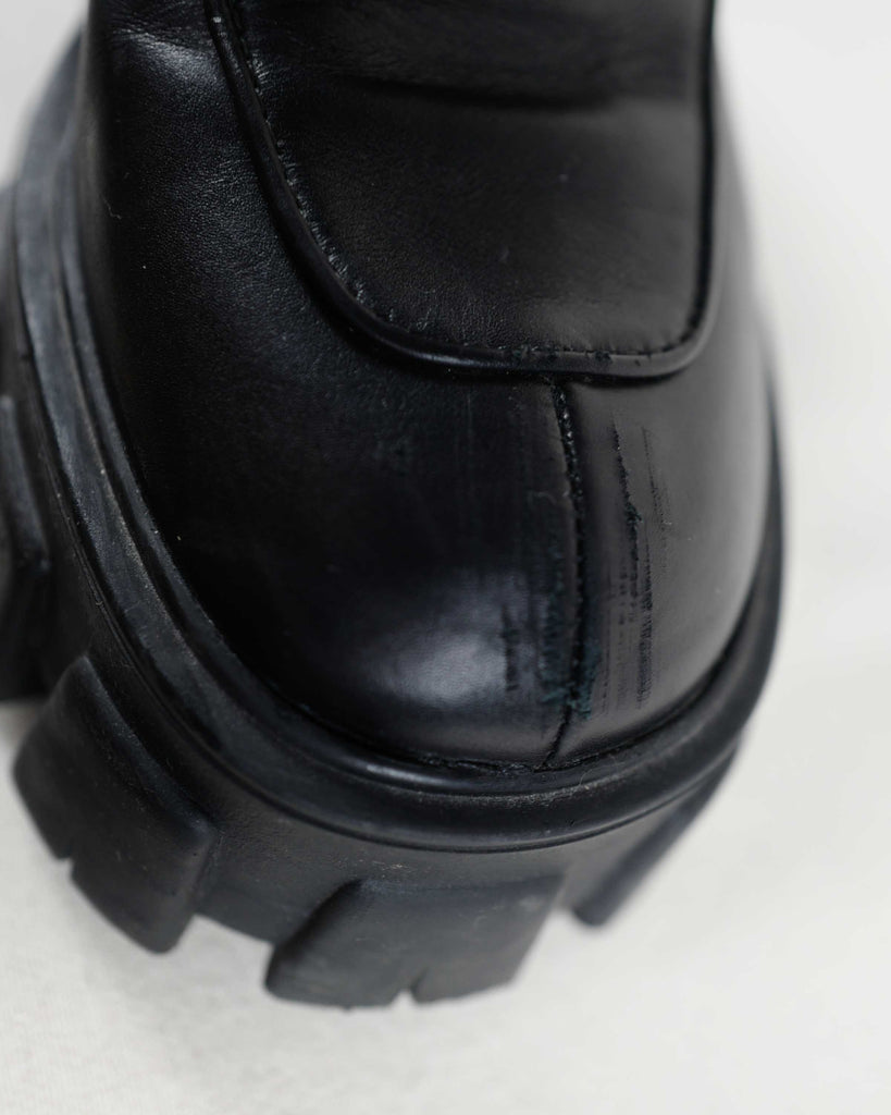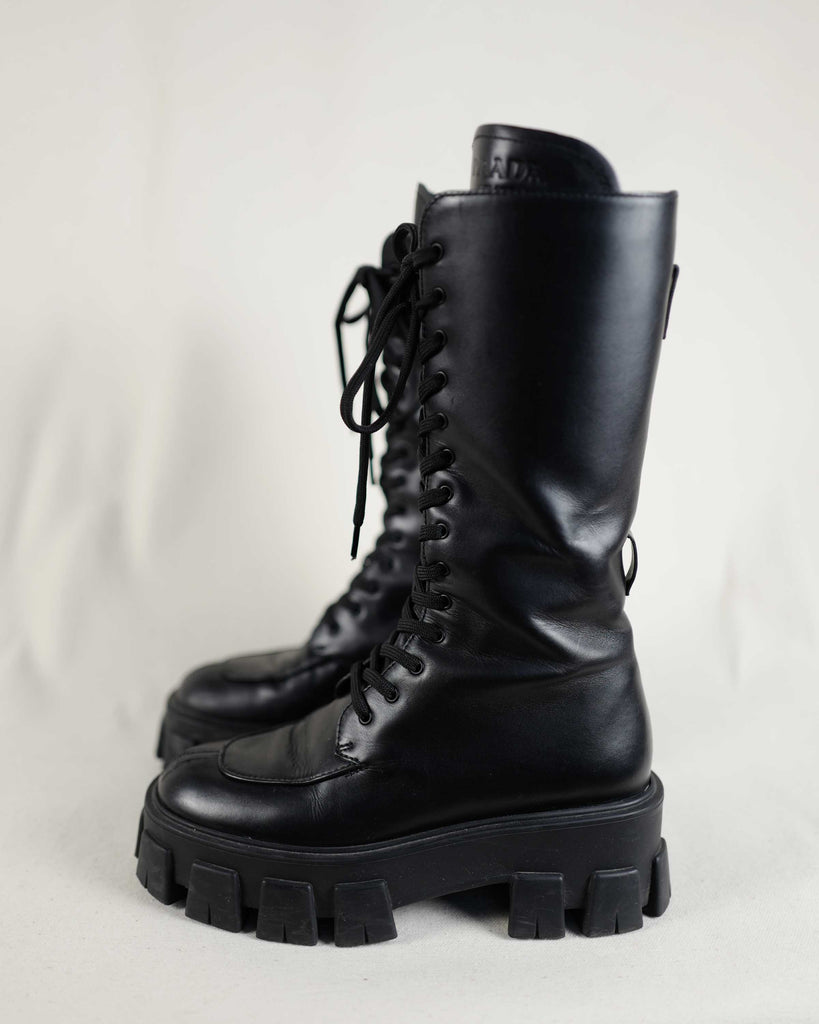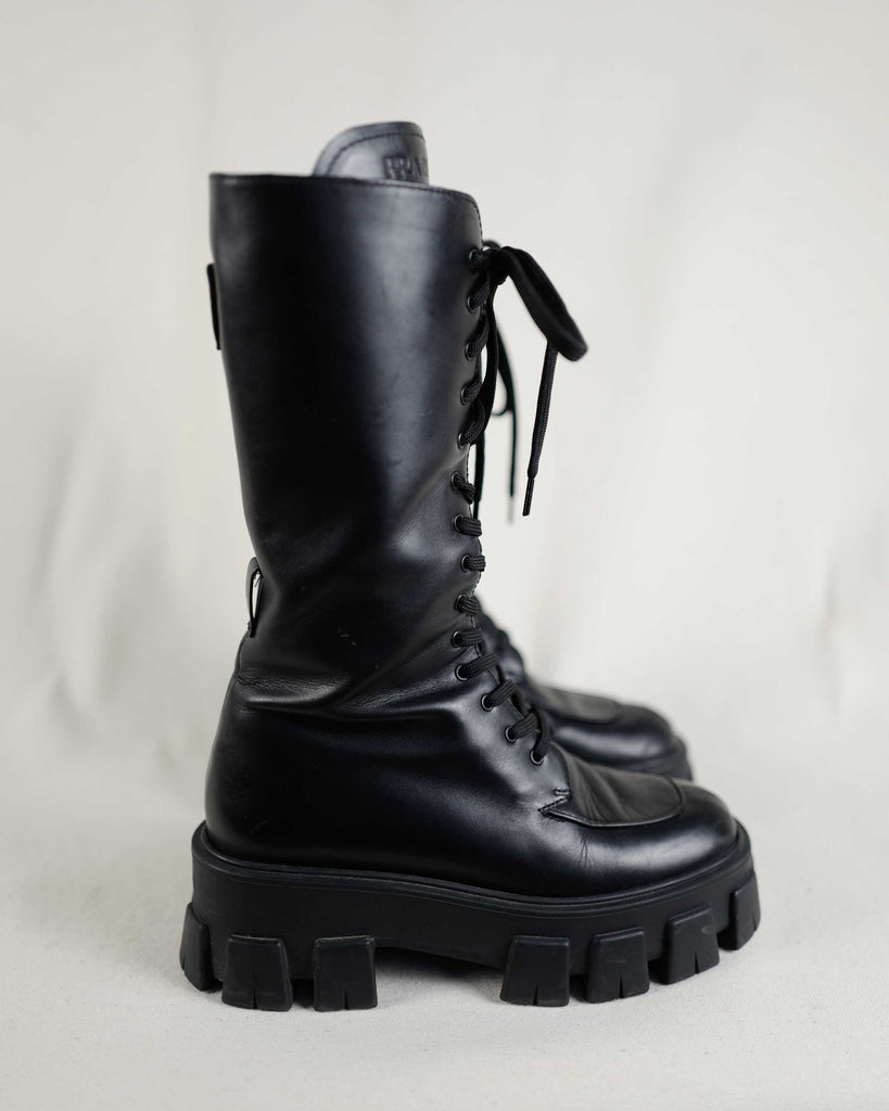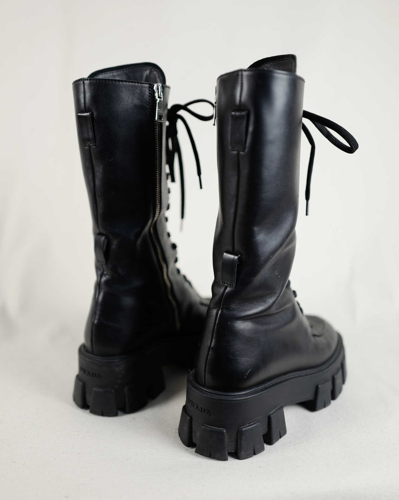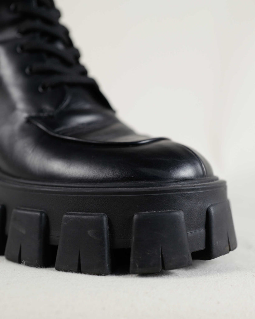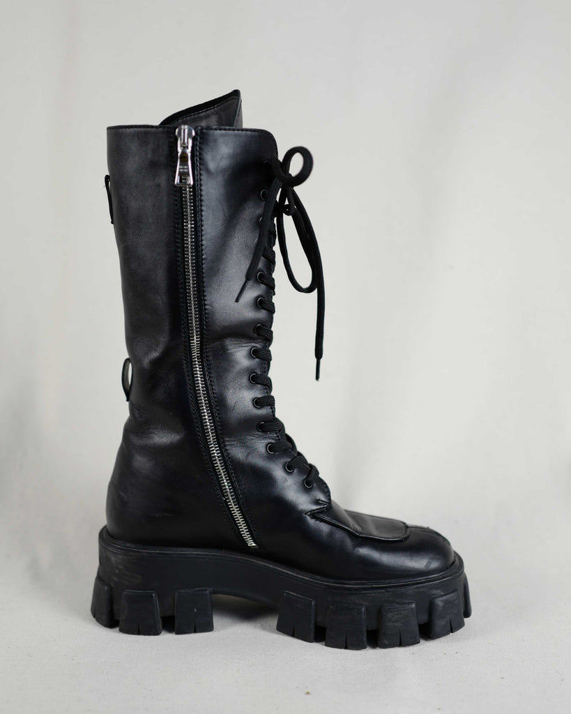 Prada's modern classic combat boots in brushed leather. closes with zipper on the side, as well as full laces. Embossed Prada logo on tongue, silver zipper and on rubber sole.