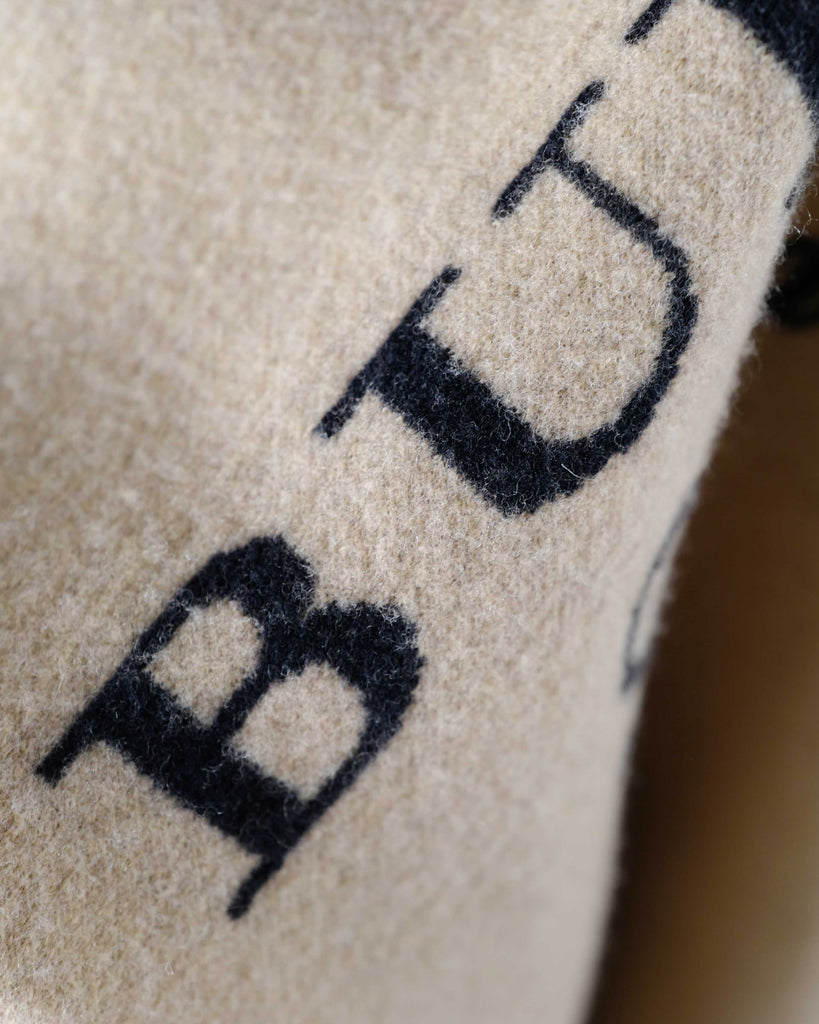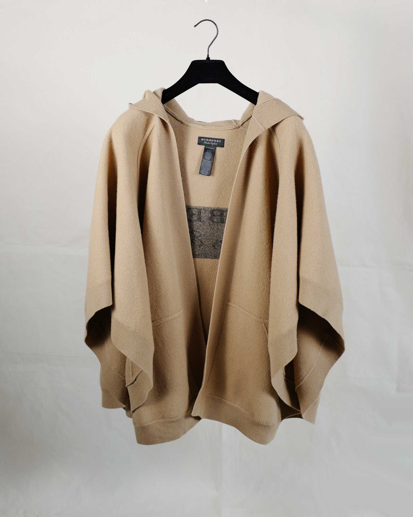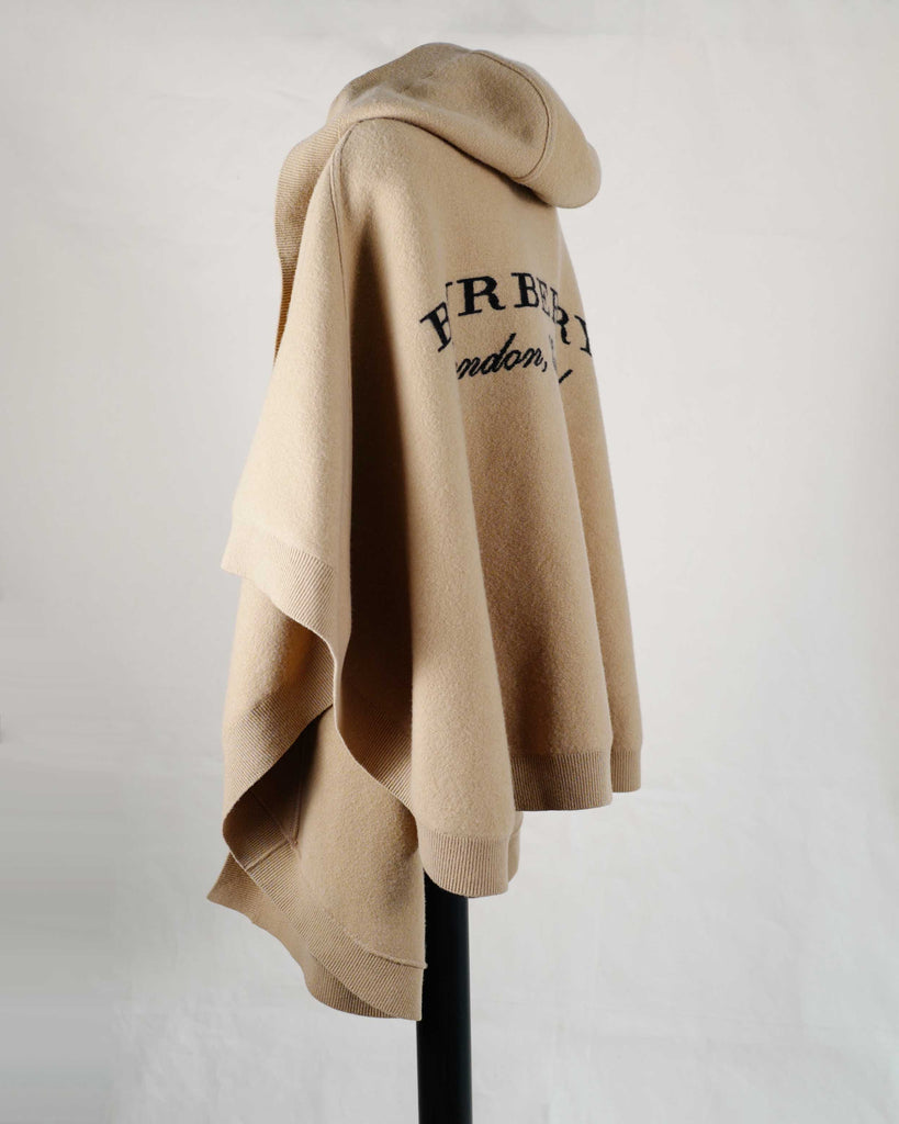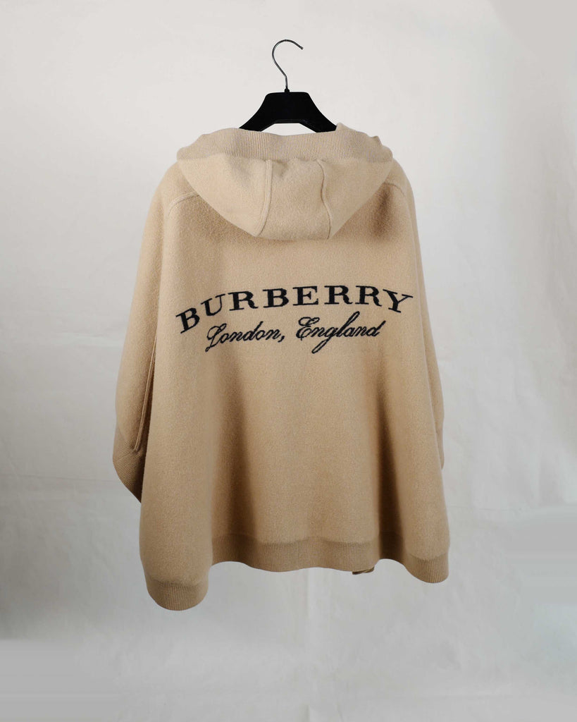 Camel coloured Burberry London cashmere cape with hood and black logo on back.