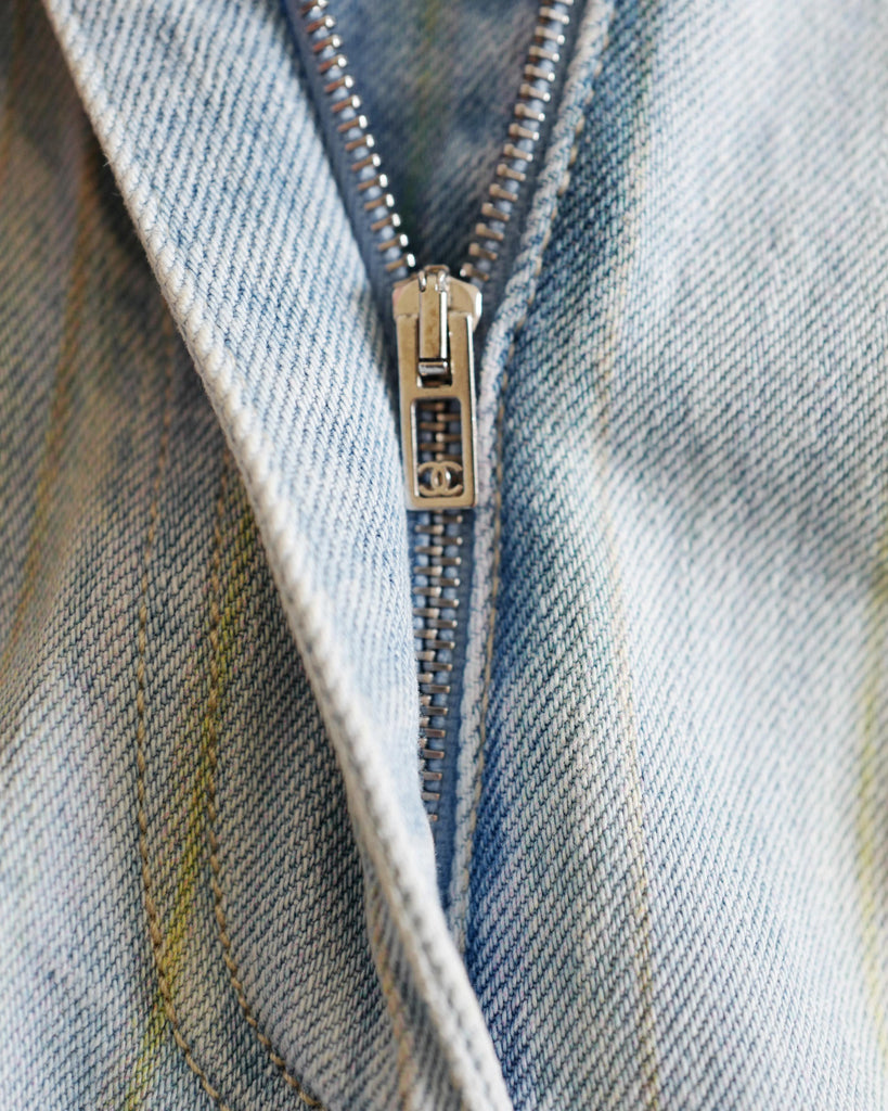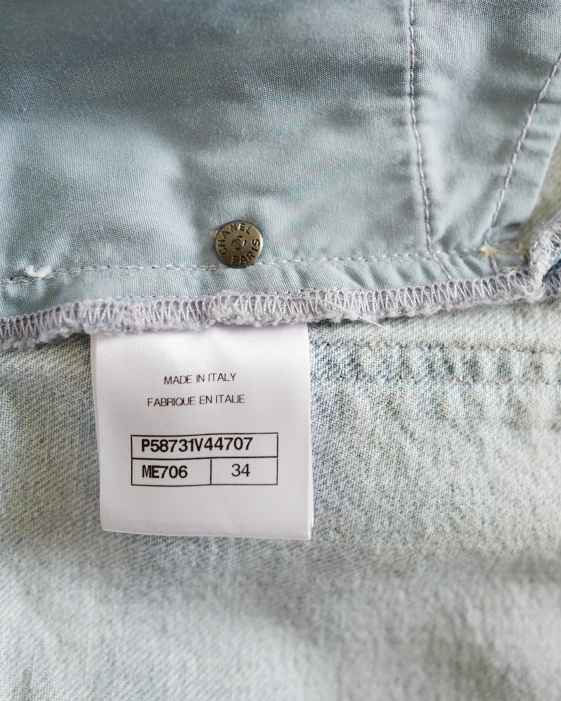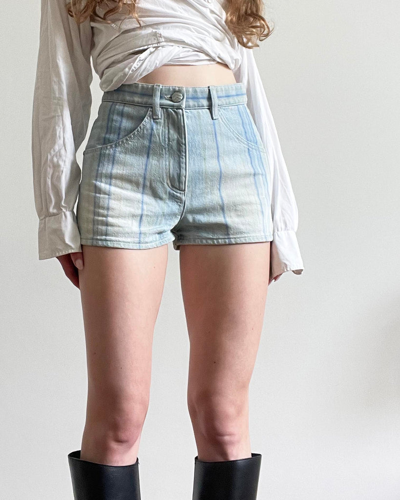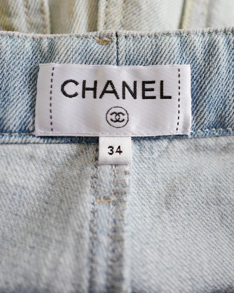 Light blue/turquise Chanel jeans shorts in highwaisted short model. Chanel zipper, brushed silver coloured detailed buttons.