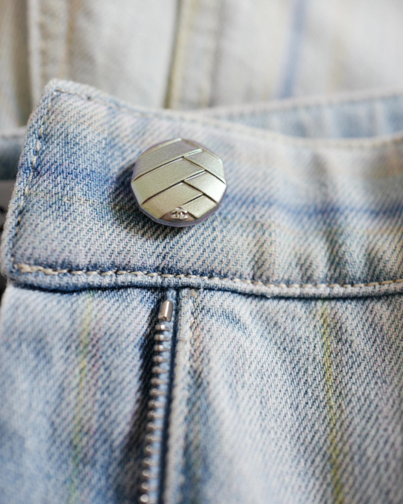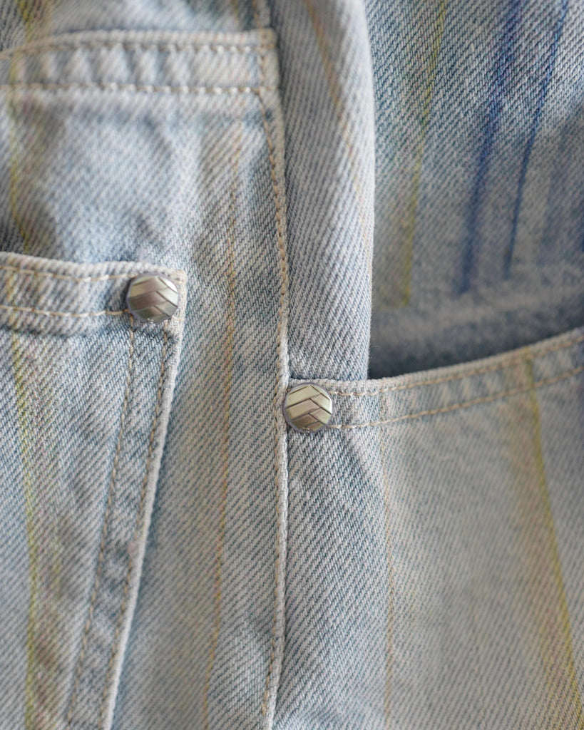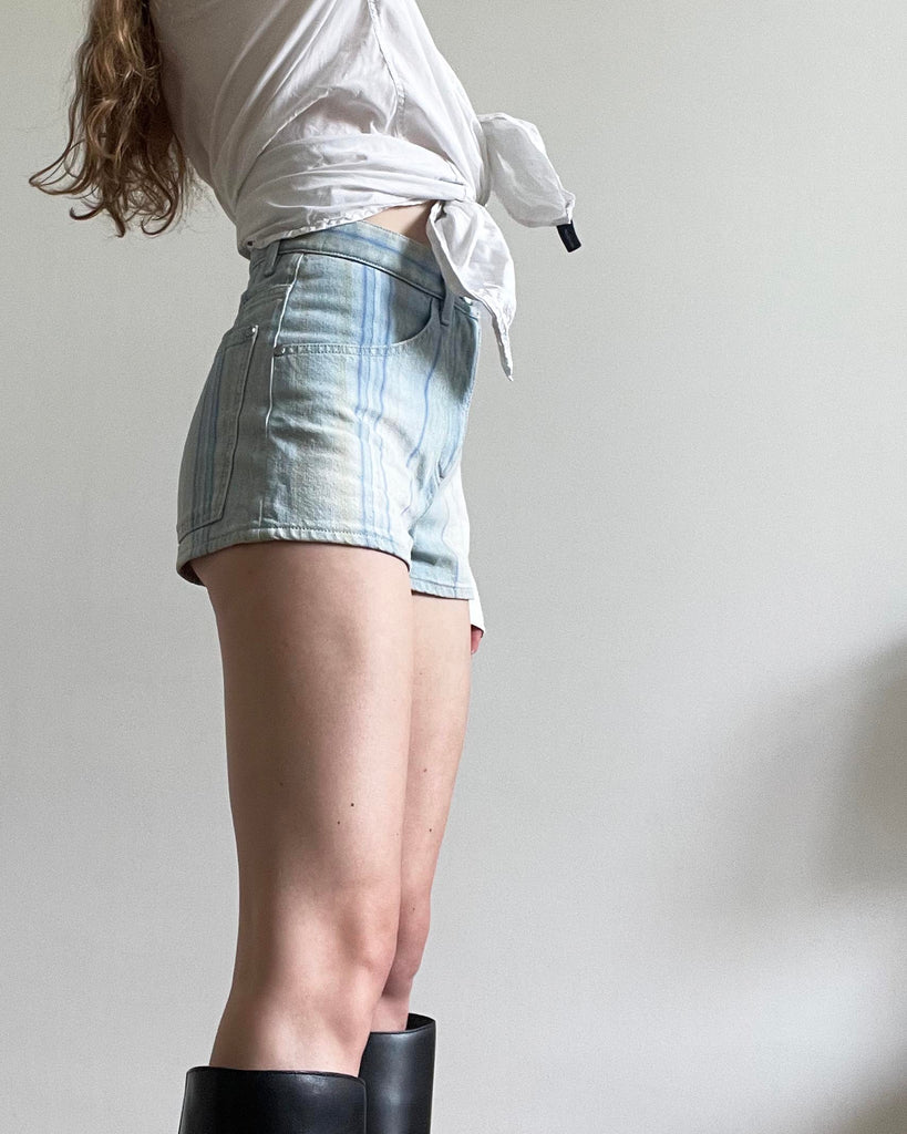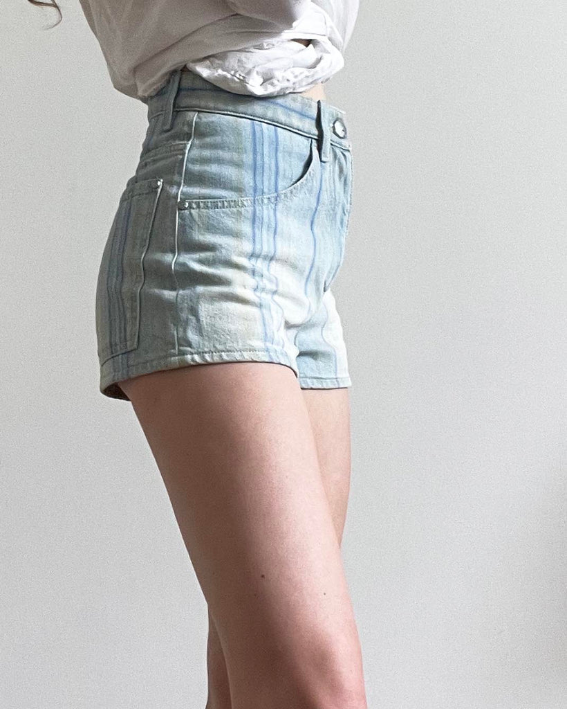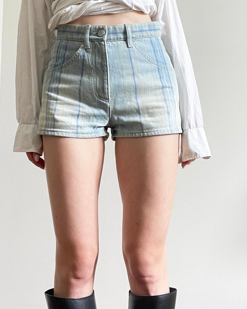 Light blue/turquise Chanel jeans shorts in highwaisted short model. Chanel zipper, brushed silver coloured detailed buttons.