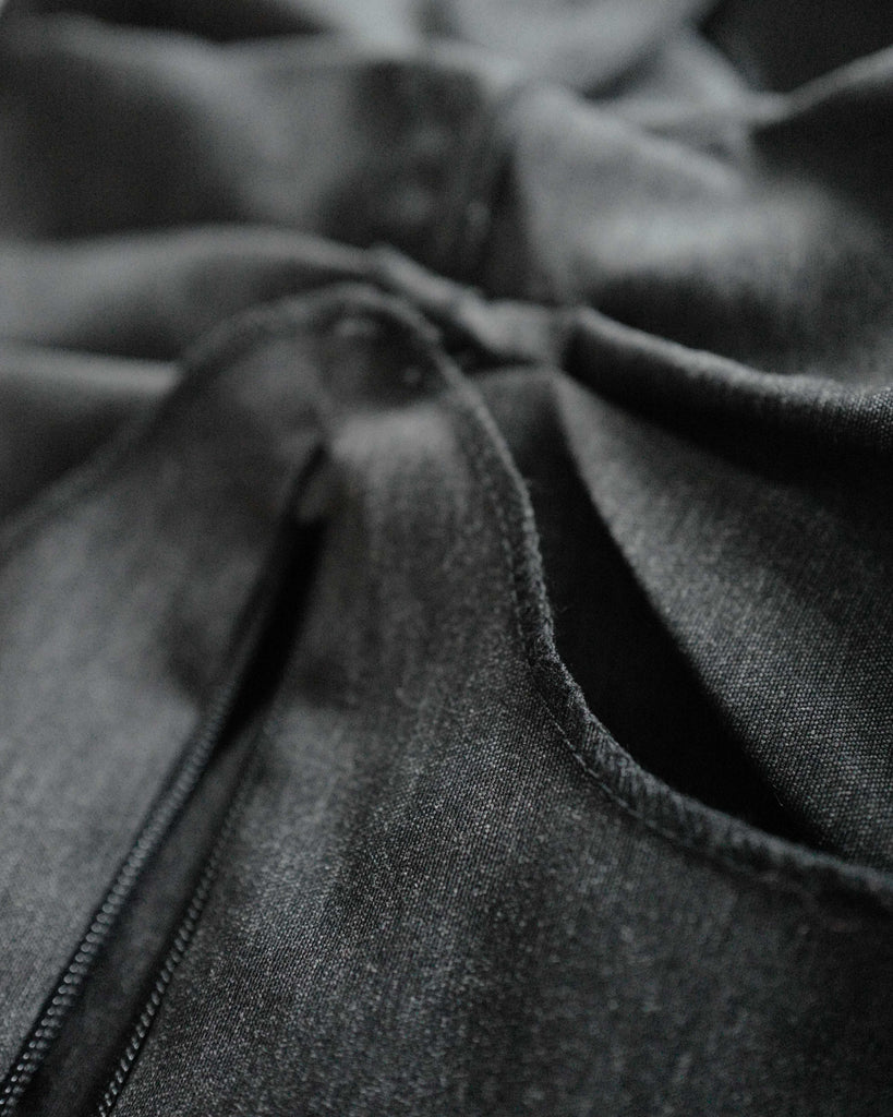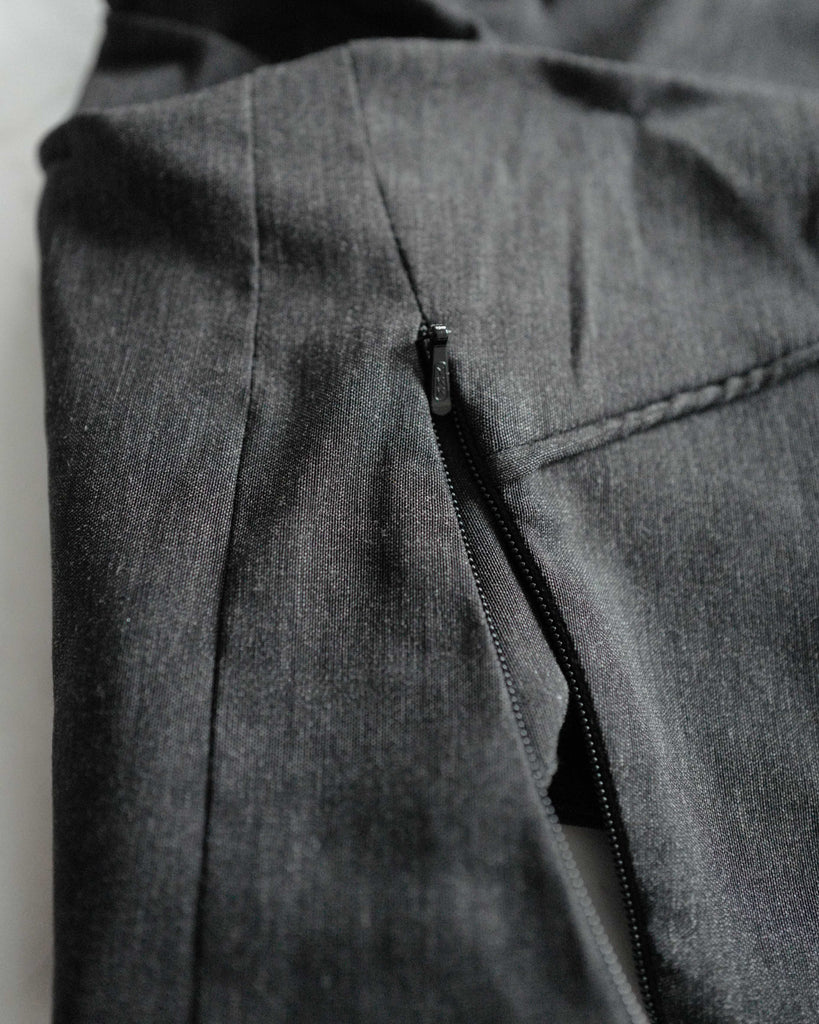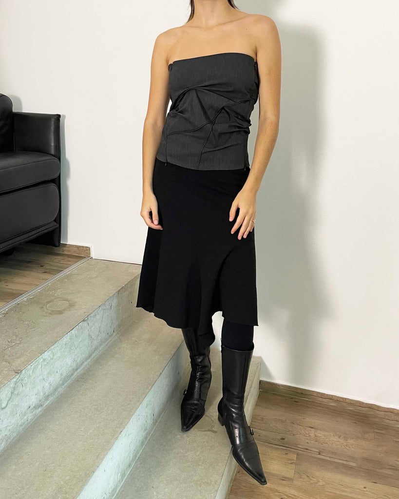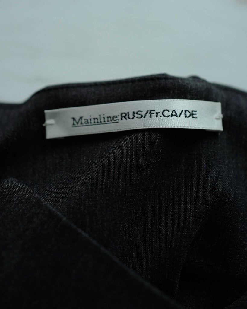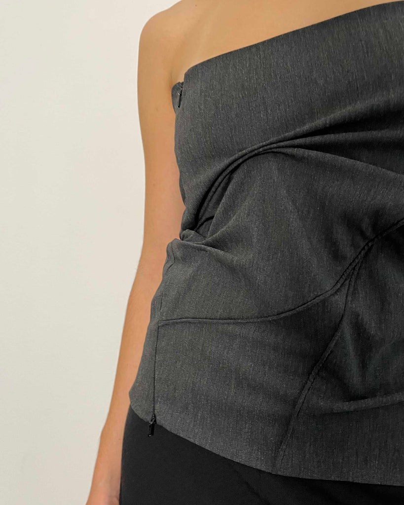 Ultimate "Corpcore" brand Mainline Ru/Fr.Ca/De. Grey, cropped corset top with multiple zippers for diverse styling. Advanced tailoring with multiple pipings for experimental shape.
