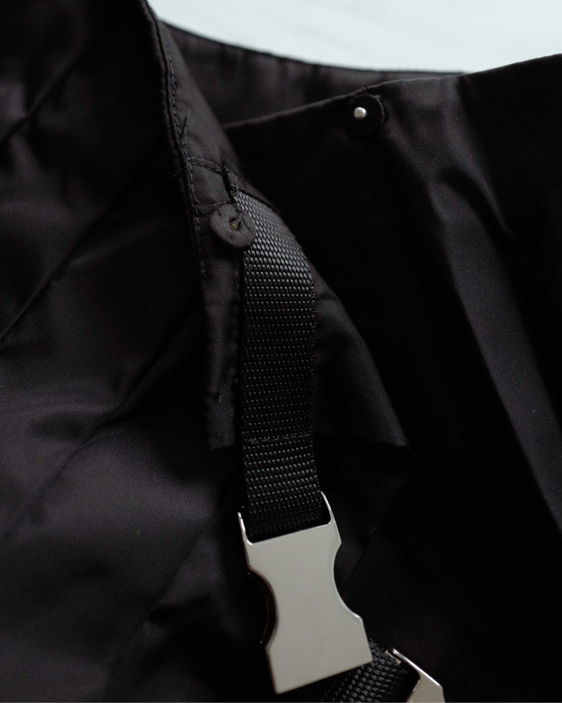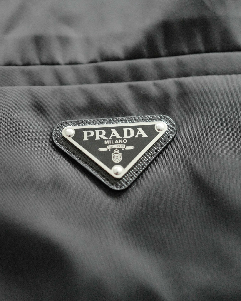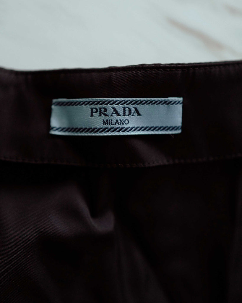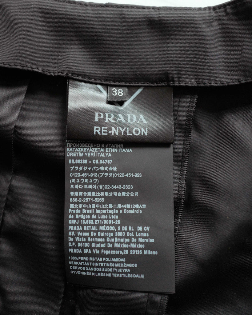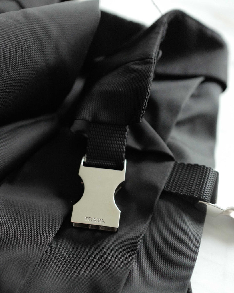 Black nylon Prada skirt in pleated school girl style, kilt-wrap model. Silver Prada logo buckles.