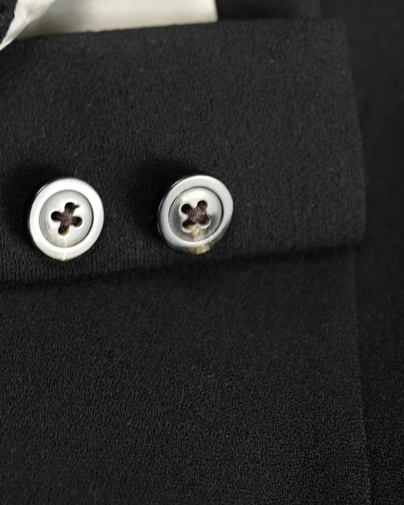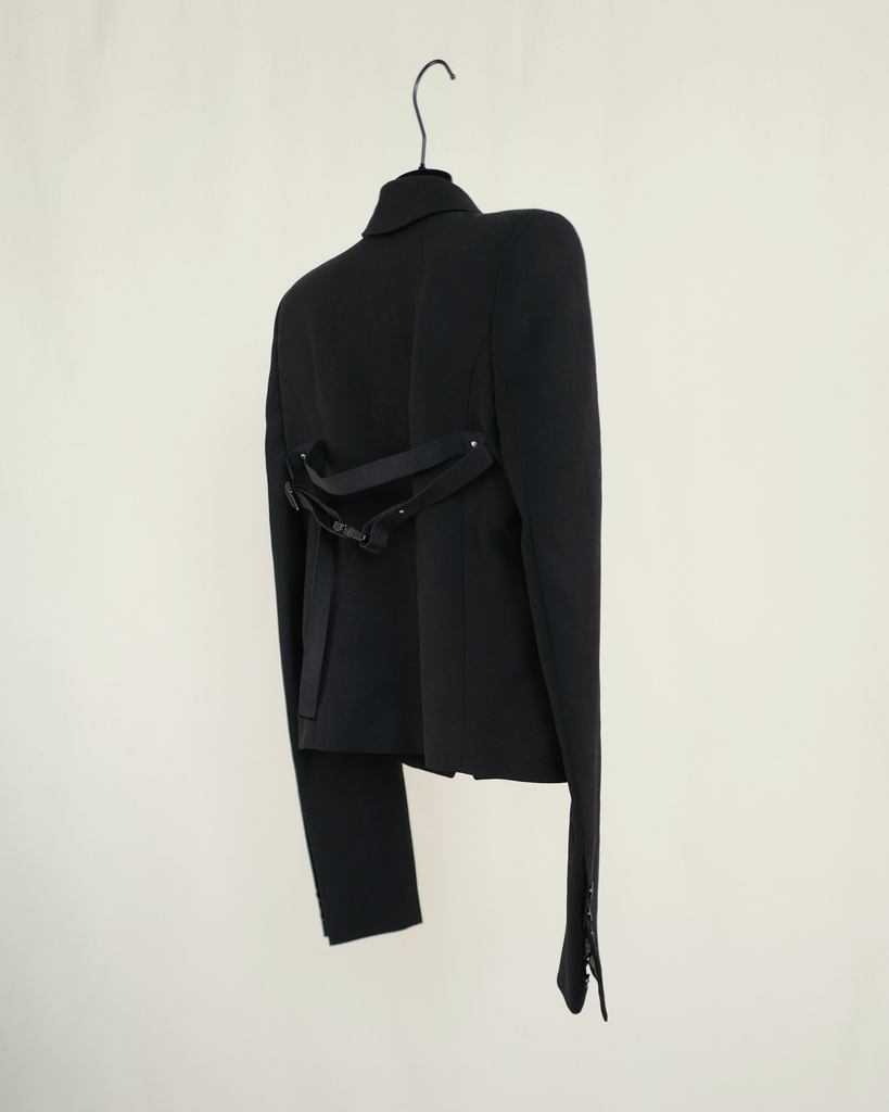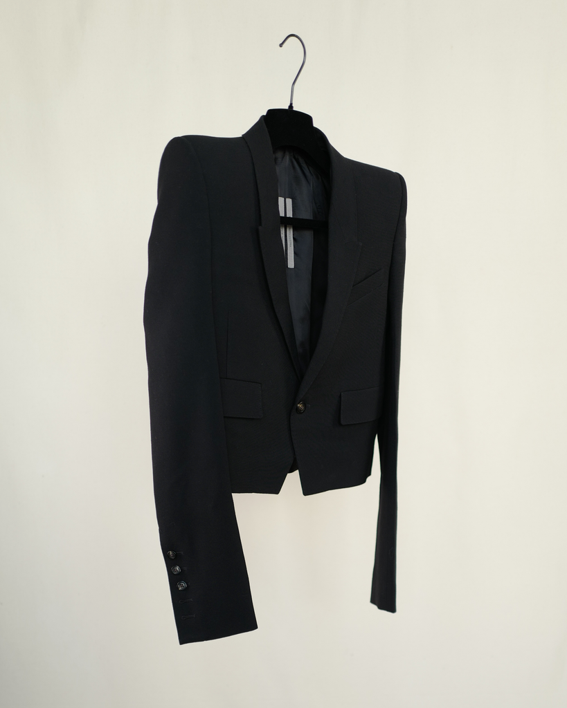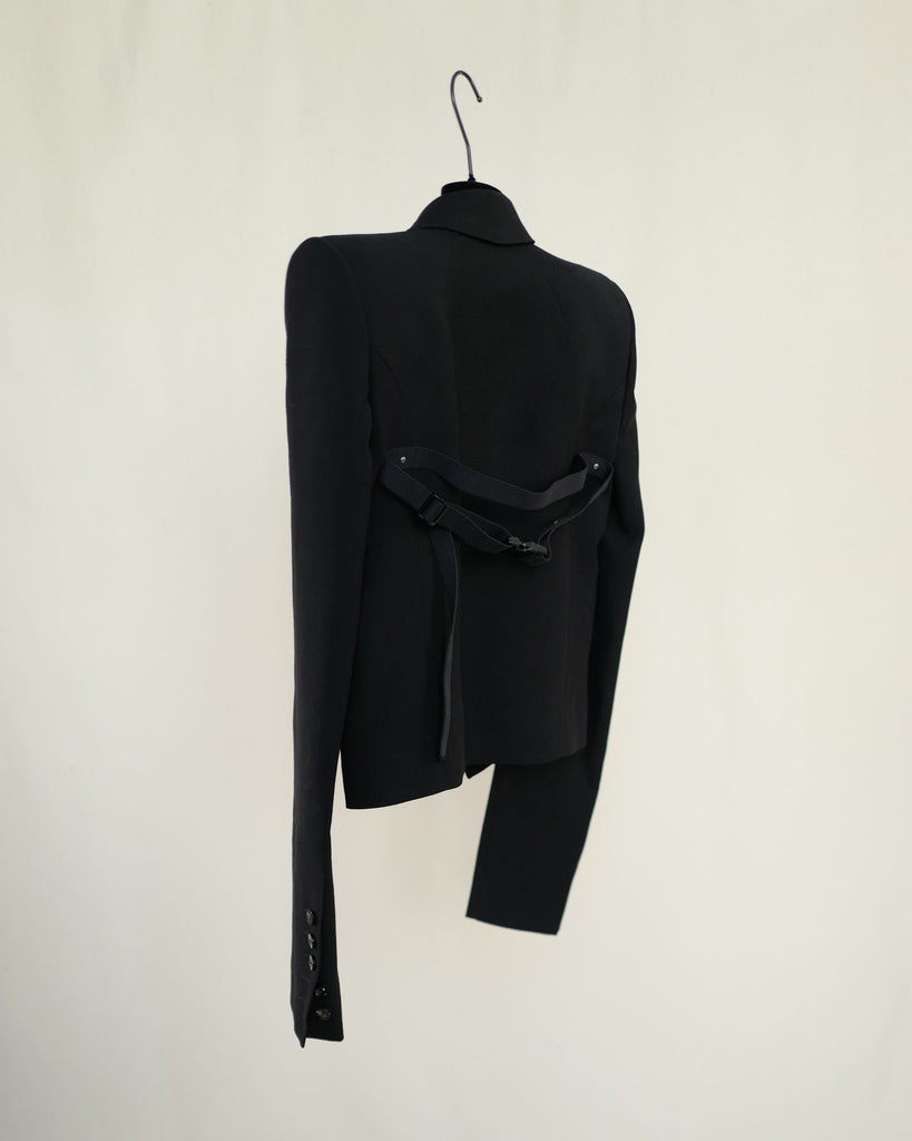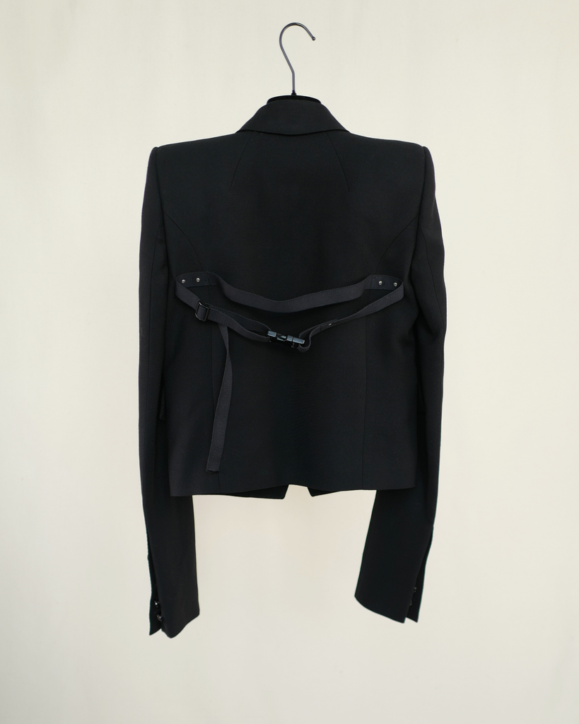 Black Rick Owens boxy cropped blazer from Phlegathon SS21. Straps in back over sshoulders. Long sleeves with buttons. Closes with one button.